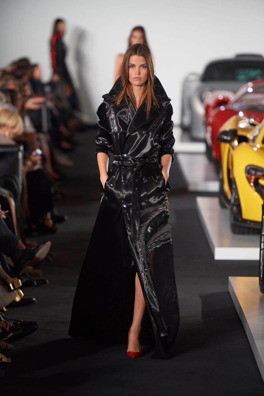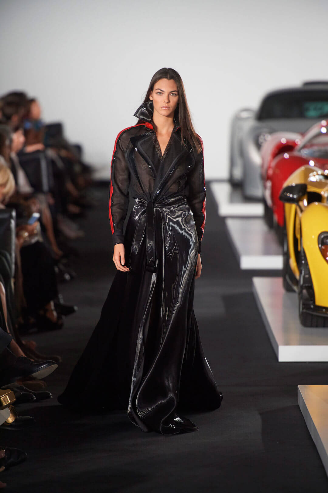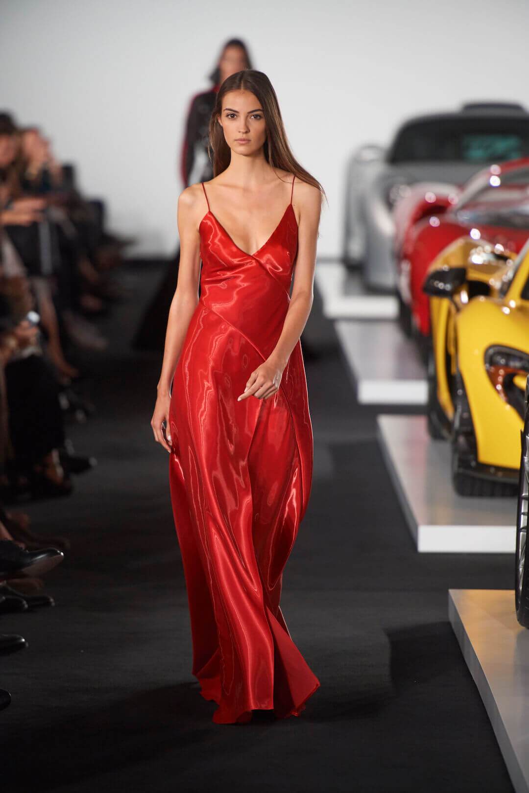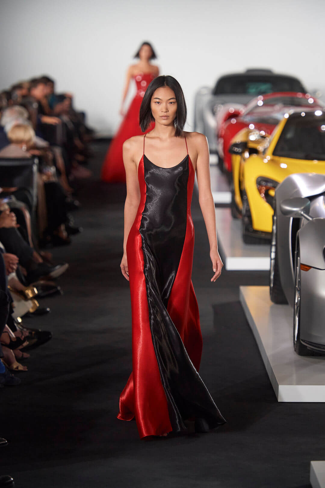 But the best thing here was the gowns, shiny, fluid organza, strapless, falling away into wide A-line skirts. They were shot through with colour – go-faster yellow, electric blue, Ferrari-red. Some were the shape of a trench coat, panelled with layers of sheer. It was a sleeker, sharper offering than Ralph of late, and all the better for it. Those Hollywood starlets front row will be scratching the eyes out of each other to get their hands on one of those gowns.