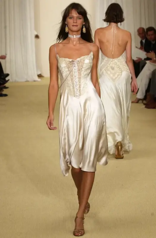 This collection, from Spring/Summer 2003, shows a distinct shift in Lauren’s approach to designing. Moving away from the understated looks of the 90s, this collection is shaped on the undergarments of historical women, emphasising lace detailing, corsetry and silky skirts. Paired with a cameo choker, this look is a personal fave over here at 10 towers.