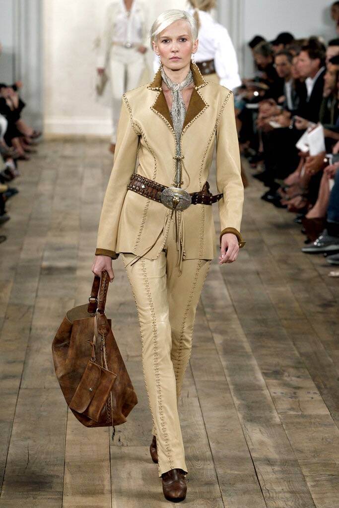 This Spring/Summer 2011 look is the first of our picks to really show the equestrian influence that’s been strongly threaded throughout a large portion of Lauren’s designs. A fully leather look, the belt and jacket are distinctly cowboy-chic, with the lace-up detailing adding an alternative edge.