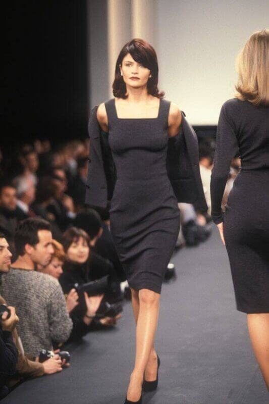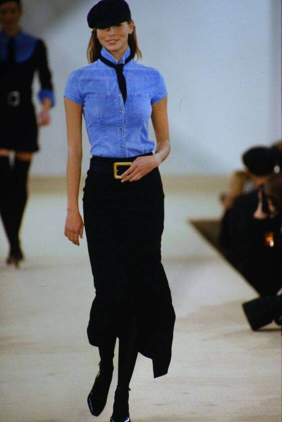 Embodying the ultimate Rachel Green energy, this minimalist look is chic and tailored to perfection. Taken from his Autumn/Winter 1995 show, this dark-grey two piece shows smart can be sexy and nods to a lot of the understated glamour that peppers Lauren’s earliest collections.