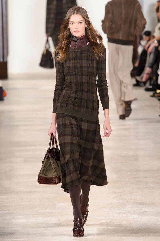This particular look, from Autumn/Winter 2016, draws directly from Ralph Lauren’s roots. Styled with a silky, knotted scarf – nodding to Lauren’s first ever piece – this two-time tartan co-ord recalls the fabrics used in the 1972 women’s collection, which featured a similar, more compact print. Paired with heeled leather brogues and a chunky bag, this look is autumn fashion done right.