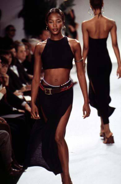 Belt’s the word in this Spring/Summer 1997 look, worn by a fresh-faced Naomi Campbell. This swishing black two piece bares both leg and stomach, making it the perfect pair for a cool-girl’s summer uniform. Paired with an arm cuff and beaded belts, this look is equal parts bold and bohemian.