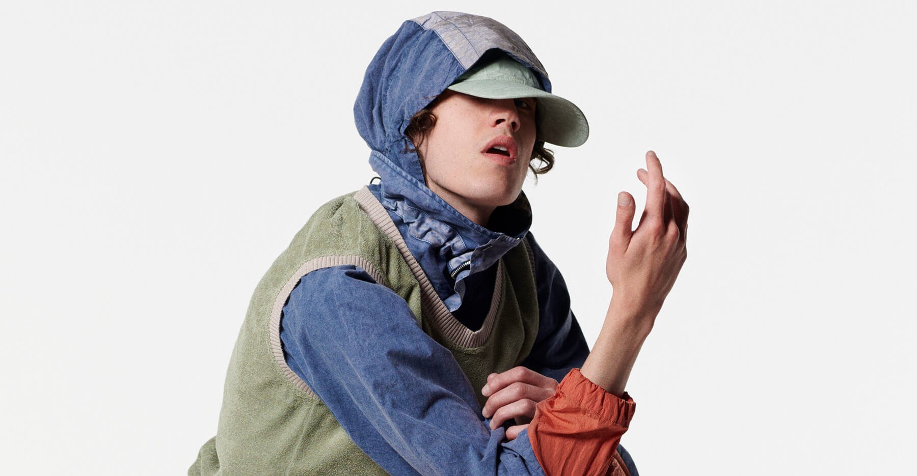 In Ranra’s heart lives a desire to provide a more human touch to the sartorial sphere of practical dress. This is where the artisanal hand-dyed finishes that you’ll see in the tie-dye bombers, cream-coloured crochet bags, motley multi-panel jumpers or zip-adorned windbreakers and incandescent comfy co-ords come into play. Crafted through a process of treating whole garments with an over-dyeing and washing technique, the result is unexpected colour combos and the softening of the handle of heavier Ventile cotton fabrics without affecting their imperative waterproof qualities.