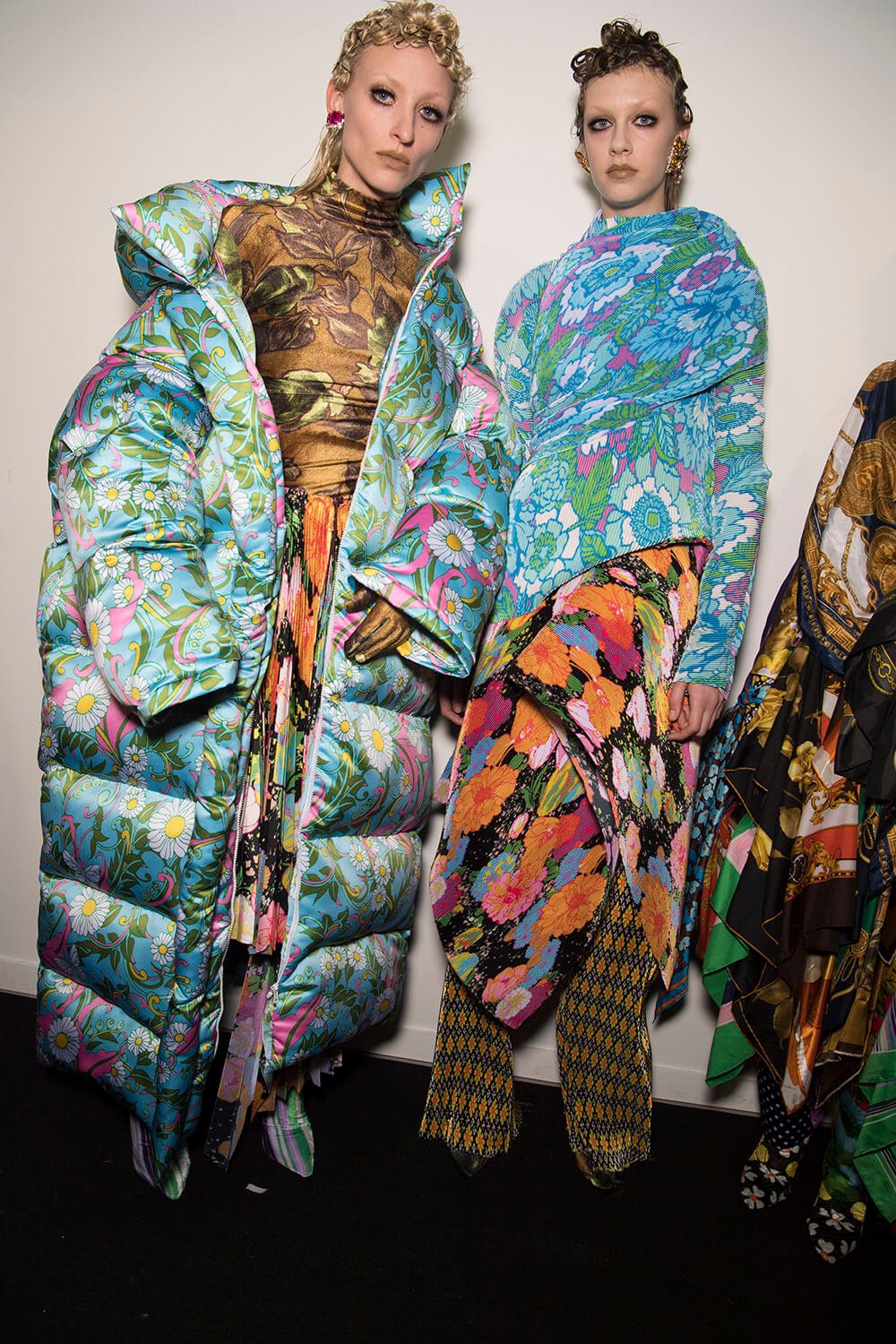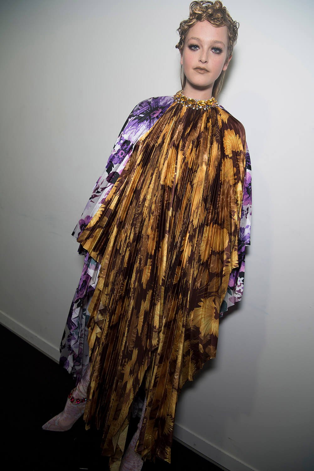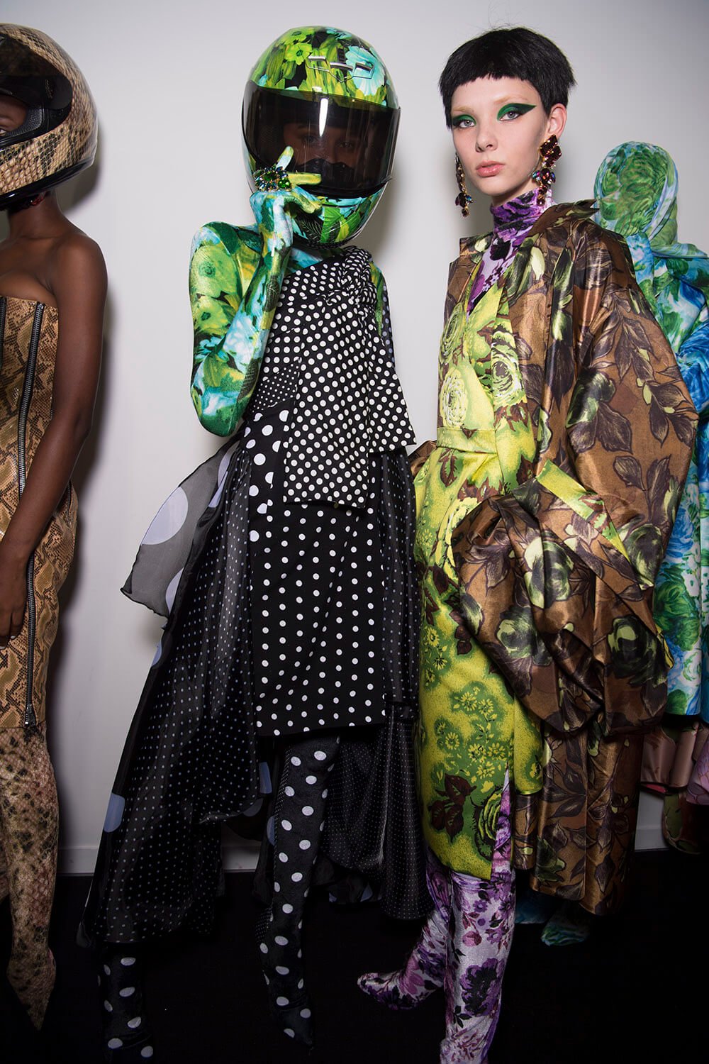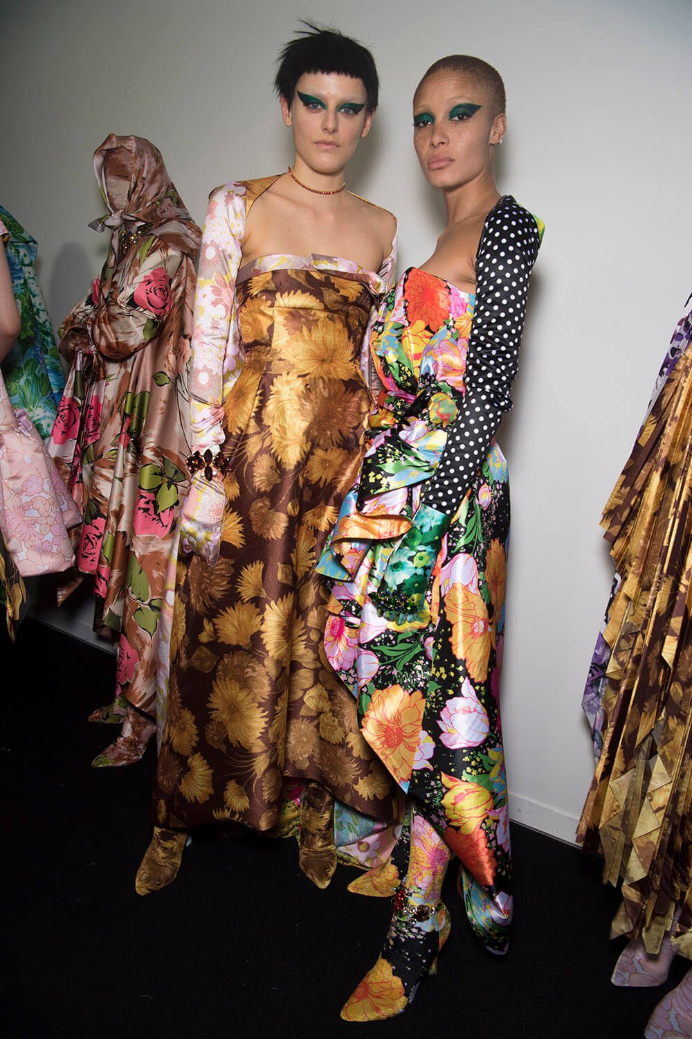 This afternoon’s proceedings at Richard Quinn got off to the most regal of starts courtesy of the attendance of Her Majesty The Queen – yes, THE ACTUAL QUEEN dropped in to see what all the fuss was about. Is she a client of Mr Quinn’s? A long-term collector of his work? It wouldn’t surprise us, given the prevalence of headscarves, prints, florals and billowing capes in the Autumn/ Winter 2018 collection, but on this occasion HRH was there on a mission, perched FROW beside Anna Wintour and Caroline Rush to bestow Richard with the inaugural Queen Elizabeth II Award for British Design. The award itself, designed by Ms Angela Kelly, Her Majesty’s personal advisor and wardrobe orchestrator for the past 26 years, aims to provide a legacy of support for the industry in recognition of the role fashion has played throughout The Queen’s reign.