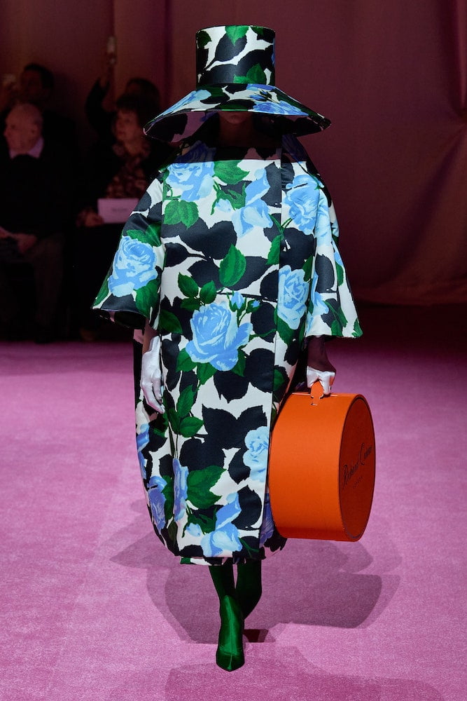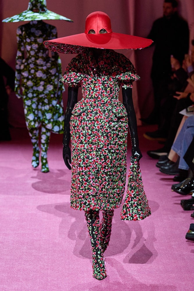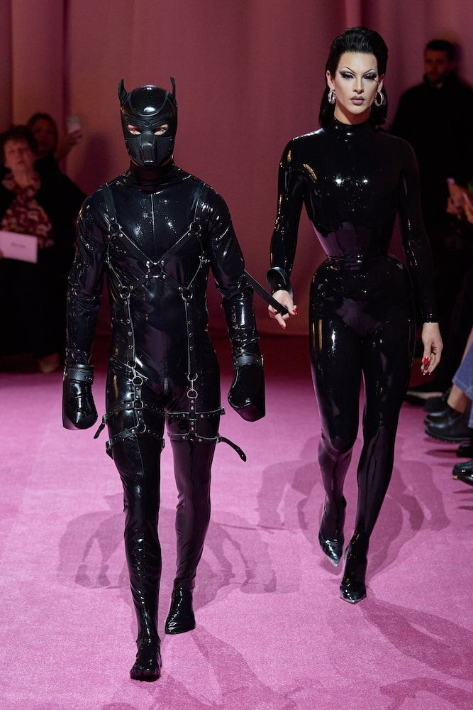 Quinn’s romantic leanings to haute couture shapes and silhouettes saw the designer this season crossbreed coats, catsuits and caftans, animated by glitchy florals, with kinky fetish gear – RuPaul’s Drag Race winner, Violet Chachki, walked a human pup, both in full latex get-ups. We’ve seen these themes from the designer plenty of times before; they shape his design lexicon. But emerging from a bleak two years, a collection awash with so much hedonistic colour and vivid print felt optimistic and poignant at once.