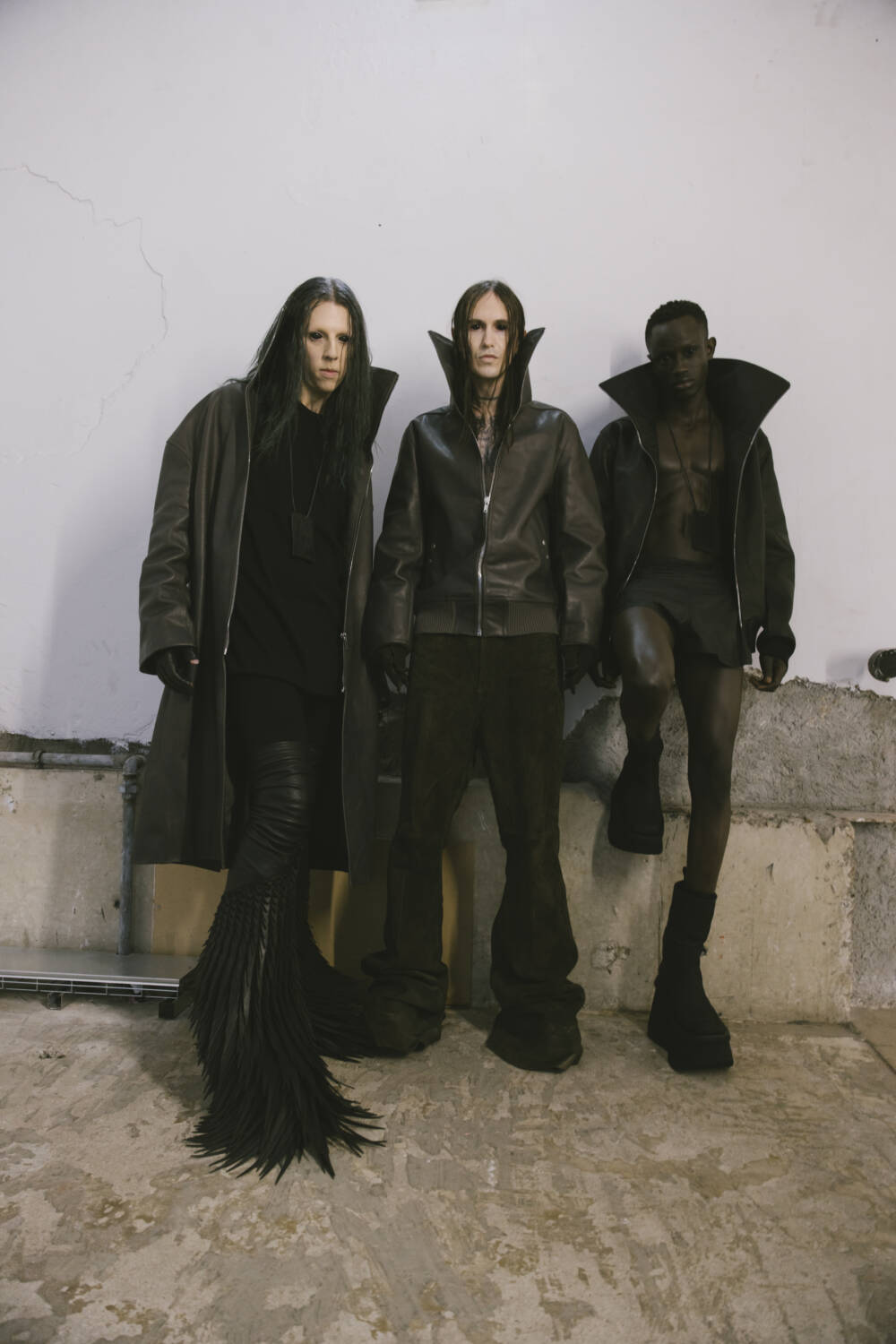 Elsewhere, dramatic dracu-collared jackets, sharply flared trousers and architectural boots evoked a familiar gothic elegance. Shredded jeans in organic Japanese denim and heavy wool capes, zipped and harnessed in a nod to industrial romanticism, were unmistakably Rick.