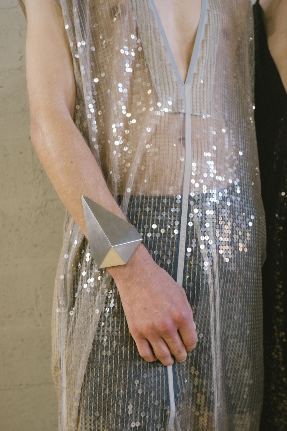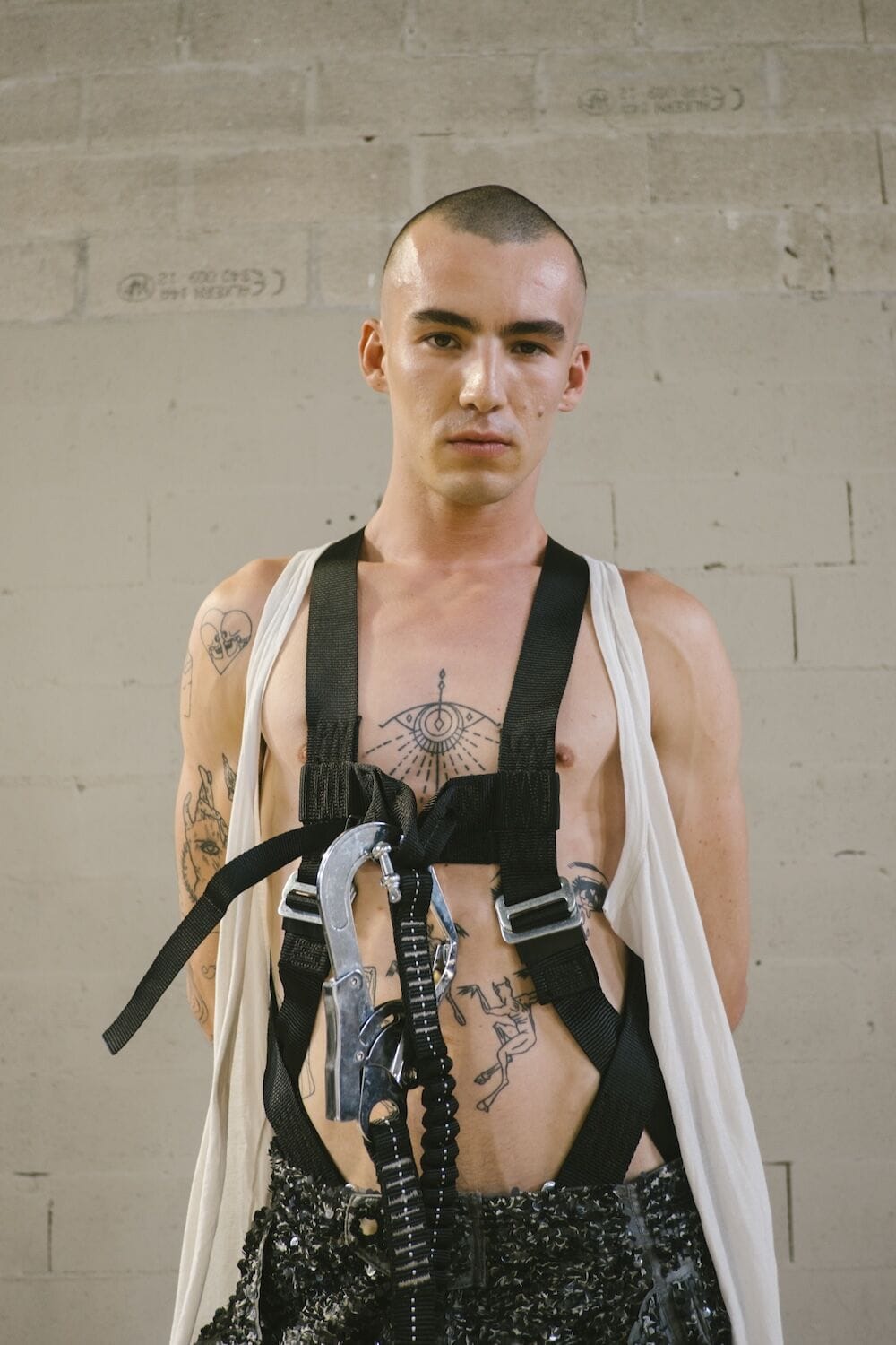 Strapped in leather, wrapped in silk taffeta and that GRSC-certified nylon from Como, figures began to cling to the scaffold’s edge as the show progressed – tethered, suspended mid-air as if in purgatory. It seemed to form a portrait of the world right now – a world on the brink, teetering on the edge of catastrophe, just one misstep from disaster – but was navigated with the grace of a ballet dancer.