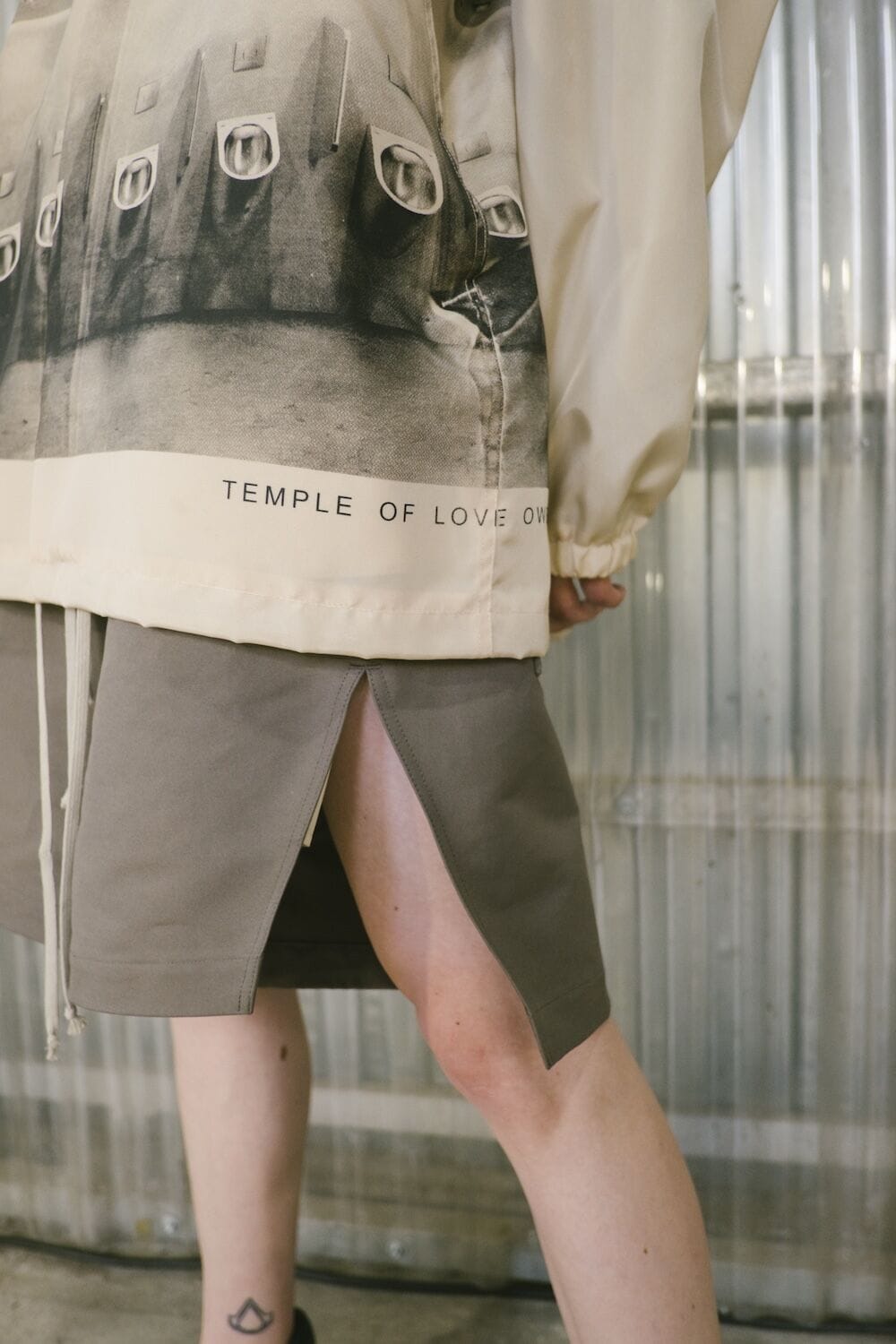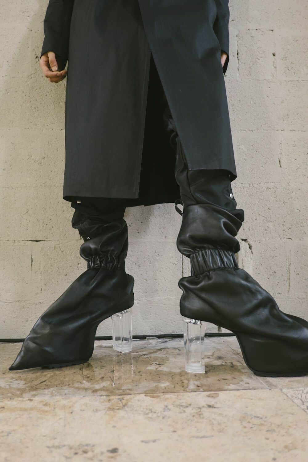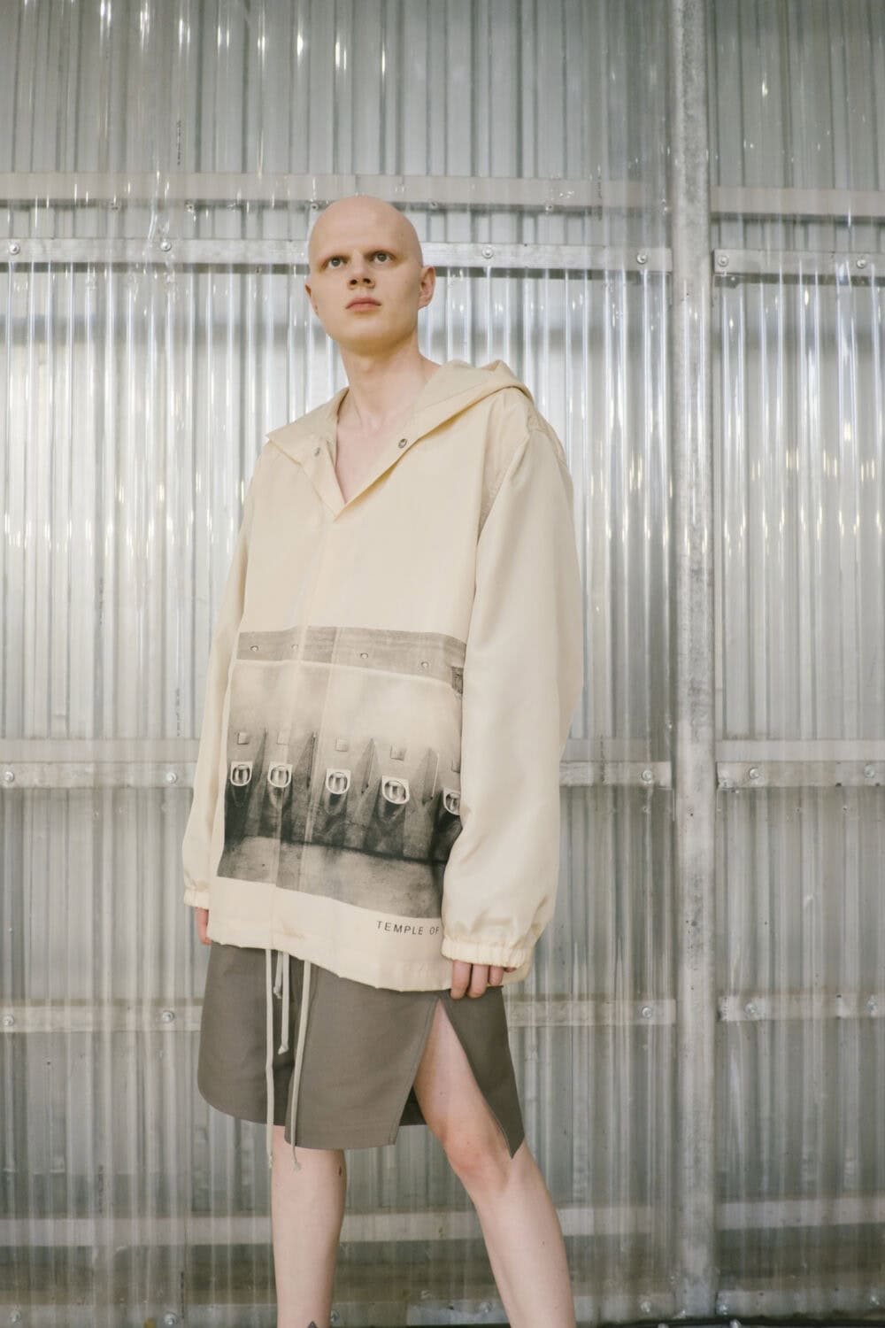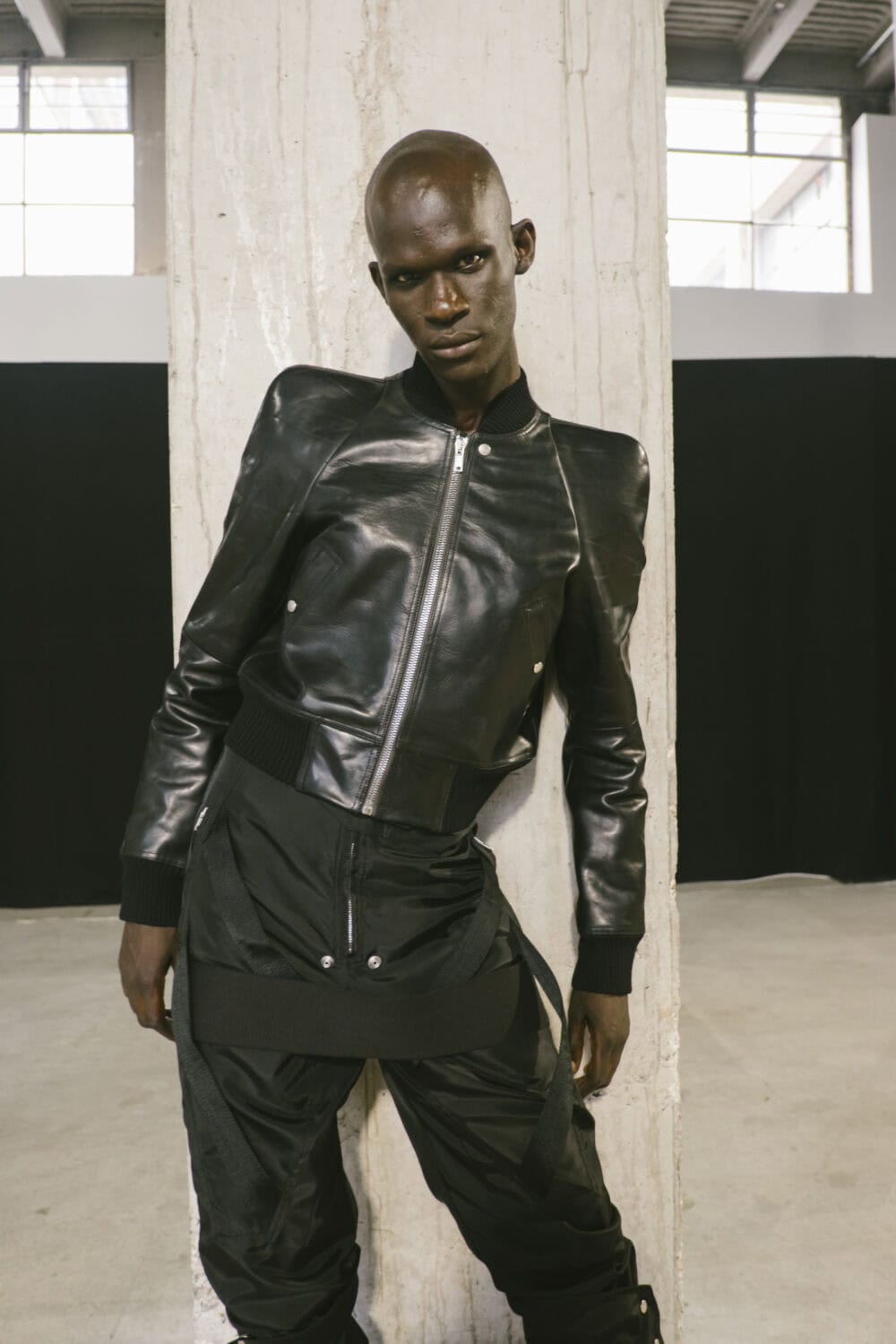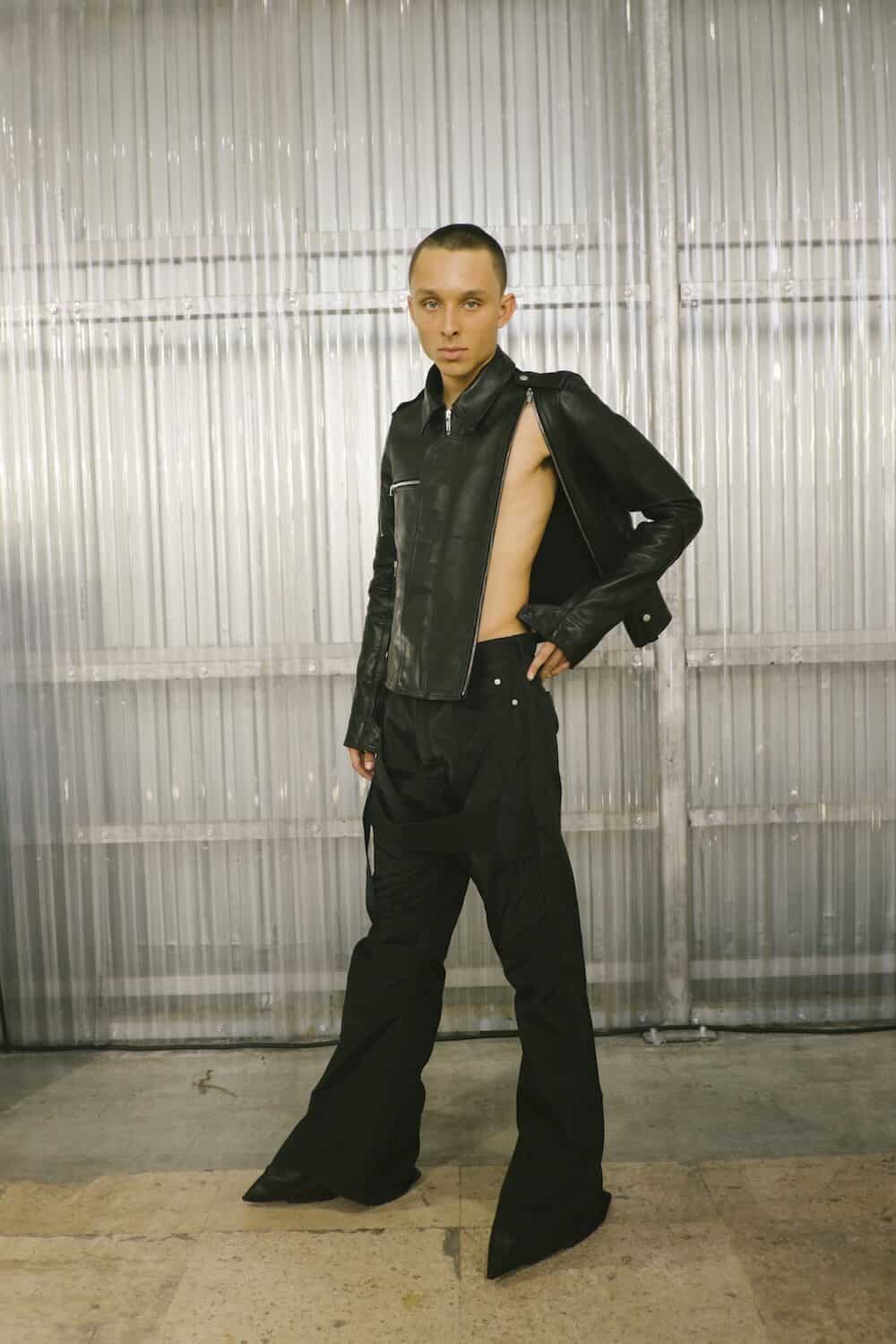 Owens called the collection Temple, after his retrospective Temple of Love, which opened immediately after the show at the Palais Galliera – just across the street, but conceptually across a universe. If the exhibition delves into the pursuit of “glamour and sleaze” that brought Owens improbably from Hollywood Boulevard to the museums of Paris, the runway offered its living, breathing altar: flesh, leather and fortified silhouettes. That meant Owens’ signature glamour-meets-apocalypse aesthetic found new form through raw leather jackets made in Hyogo, Japan, and revisited knitwear from early collaborator Terry-Ann Frencken. Elsewhere, voluptuously proportioned flight jackets and parkas rendered in silk taffeta or GRSC-certified industrial nylon canvas were paired with voluminous cotton shorts and padded, orthopedic velcro-strapped “burrito” sneakers.