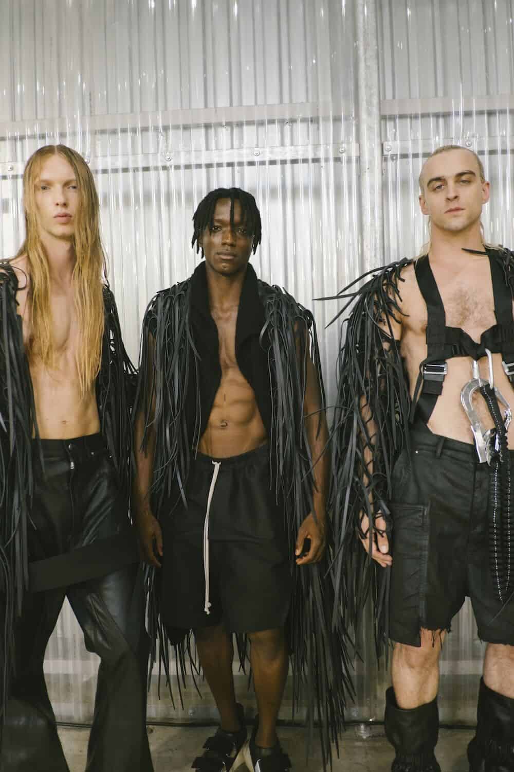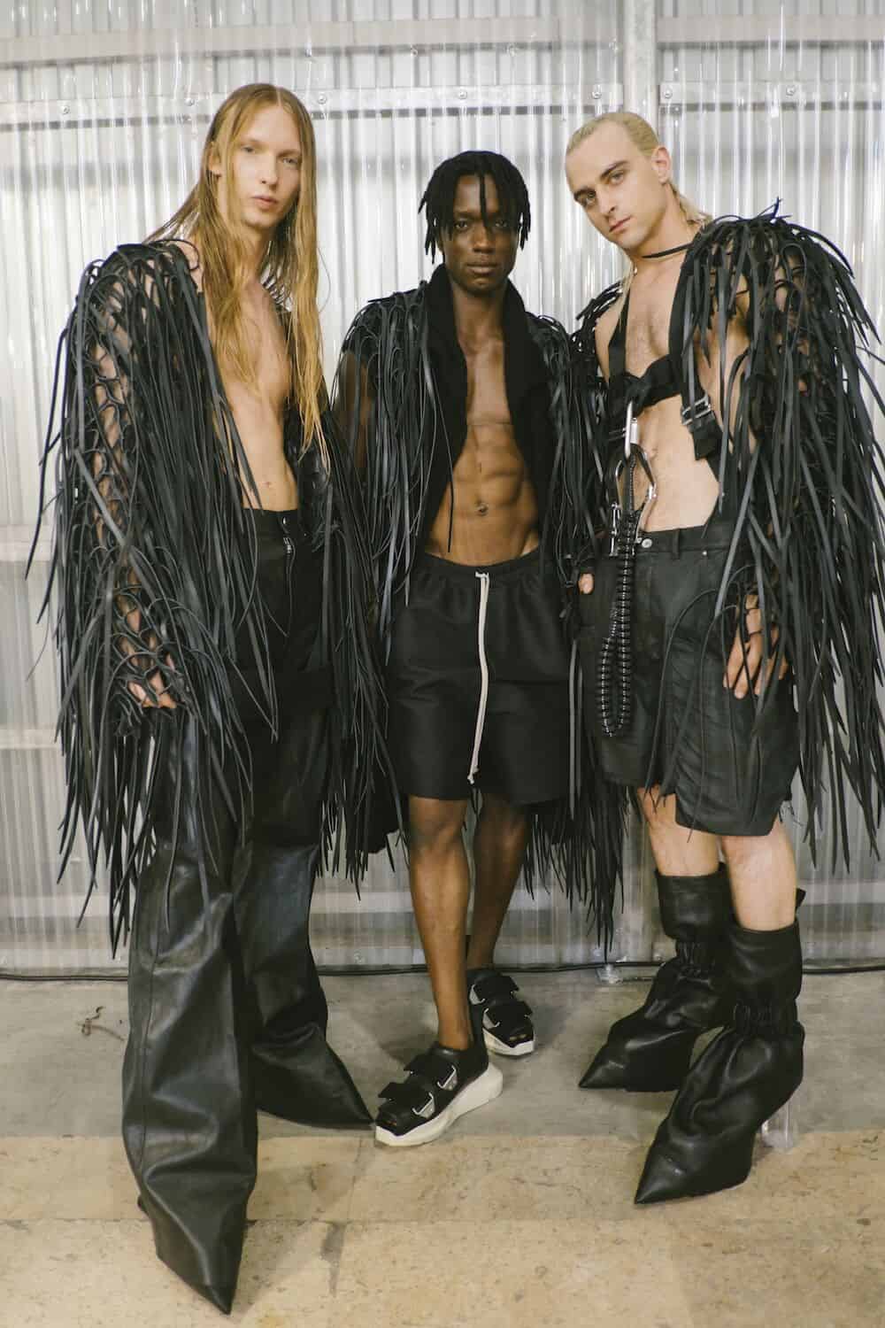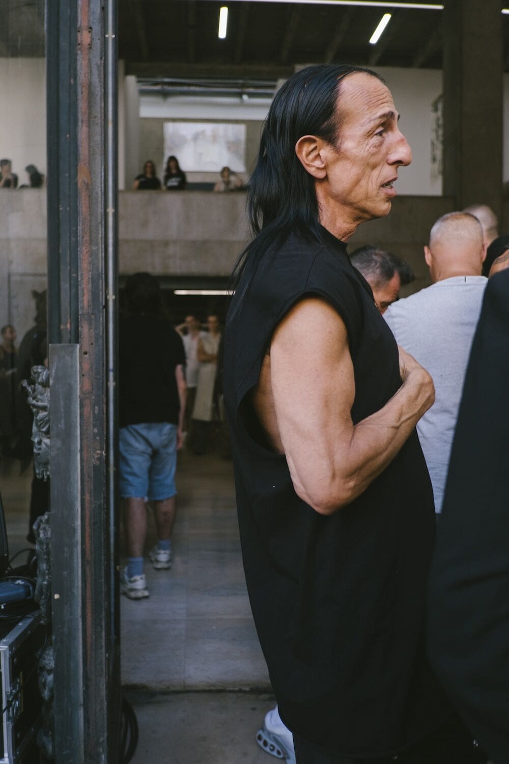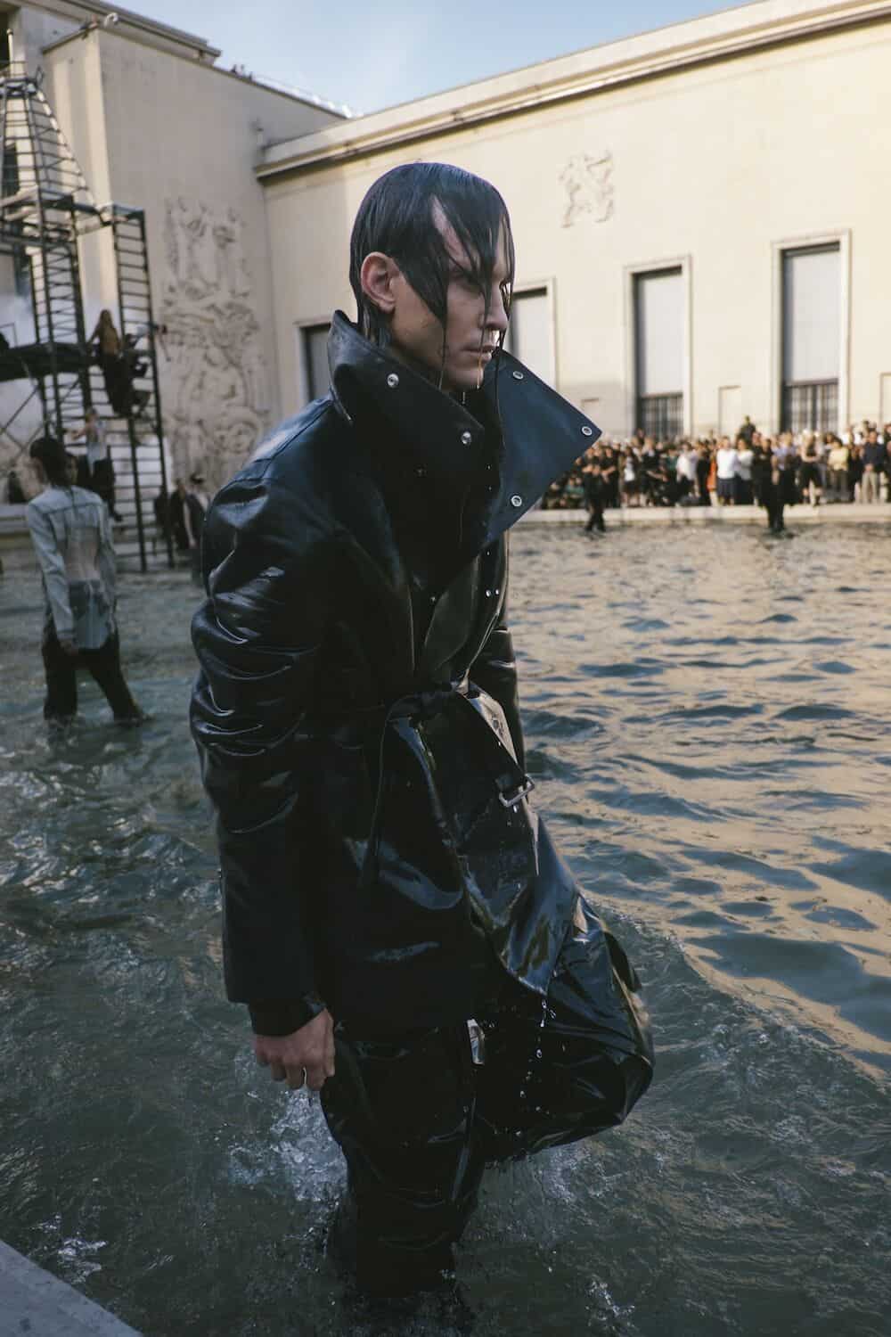 Emerging from the void, Rick Owens’ SS26 army swept through the Palais de Tokyo like a procession of monastic gladiators, descending from scaffolding into water and transforming the runway into a site of ritual. Some dove in headfirst, reemerging soaked – garments clinging, reshaped, reframed. And with that, the water became a place of baptism, imbuing each look with new vulnerability and weight.