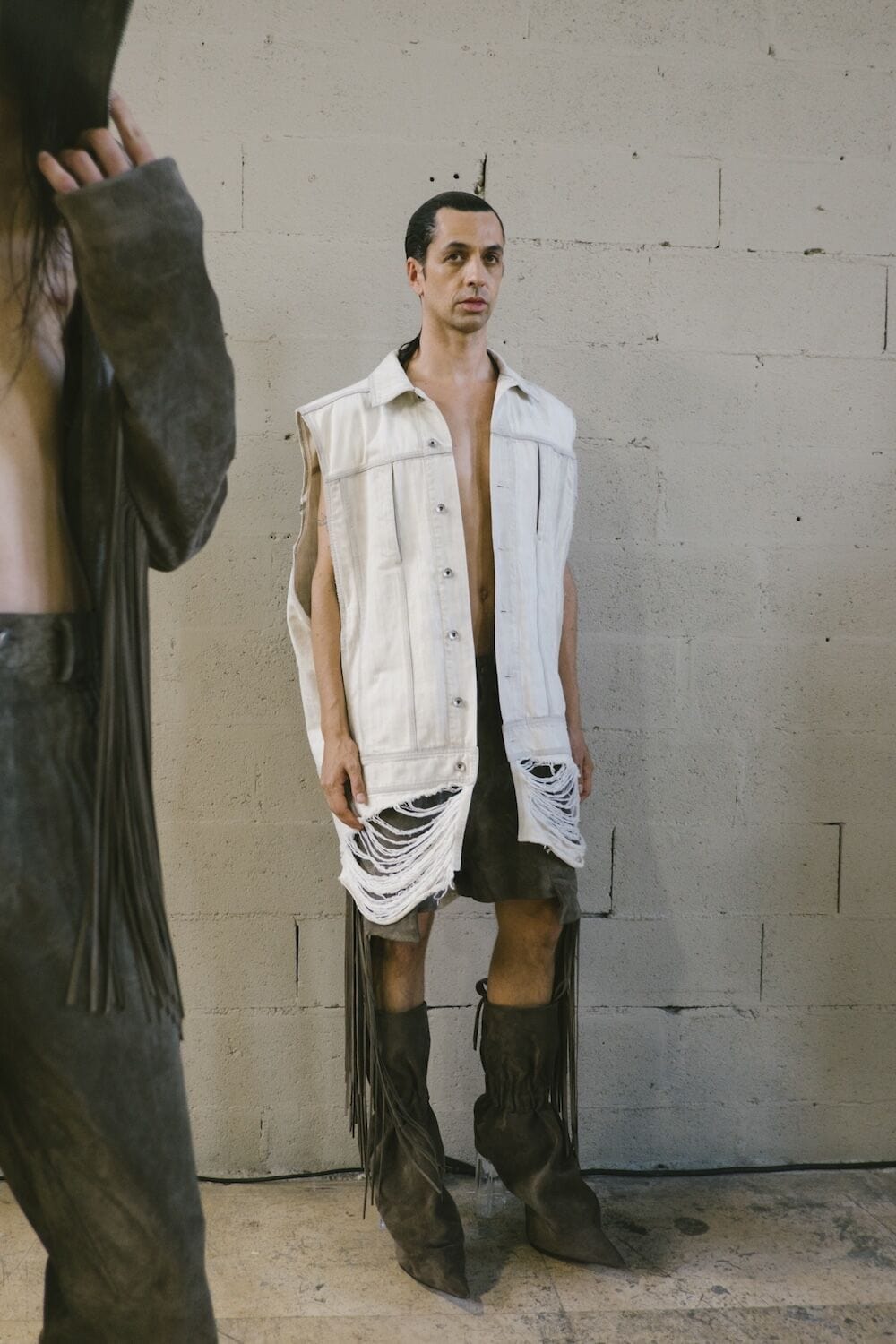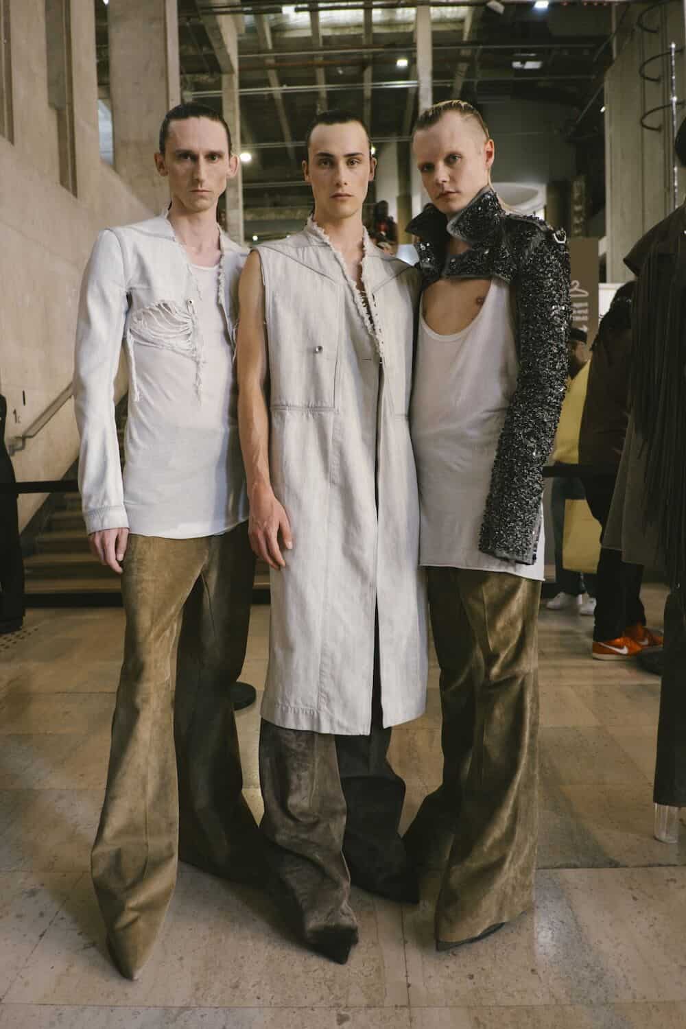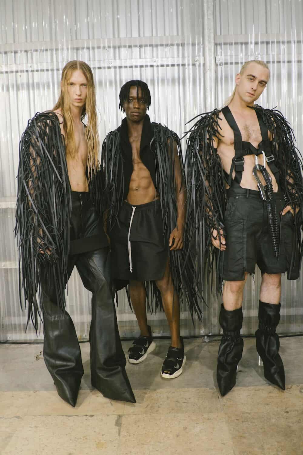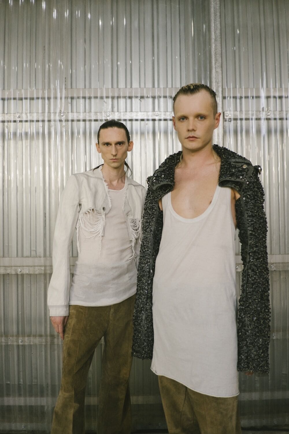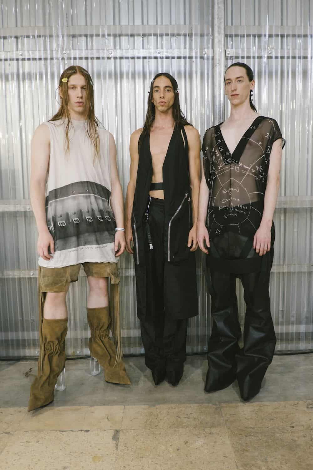 Emerging from the void, Rick Owens’ SS26 army swept through the Palais de Tokyo like a procession of monastic gladiators, descending from scaffolding into water and transforming the runway into a site of ritual. Some dove in headfirst, reemerging soaked – garments clinging, reshaped, reframed. And with that, the water became a place of baptism, imbuing each look with new vulnerability and weight.