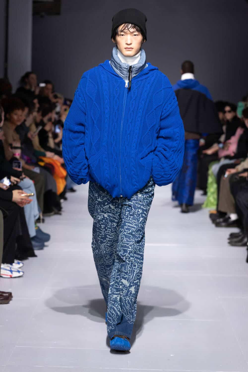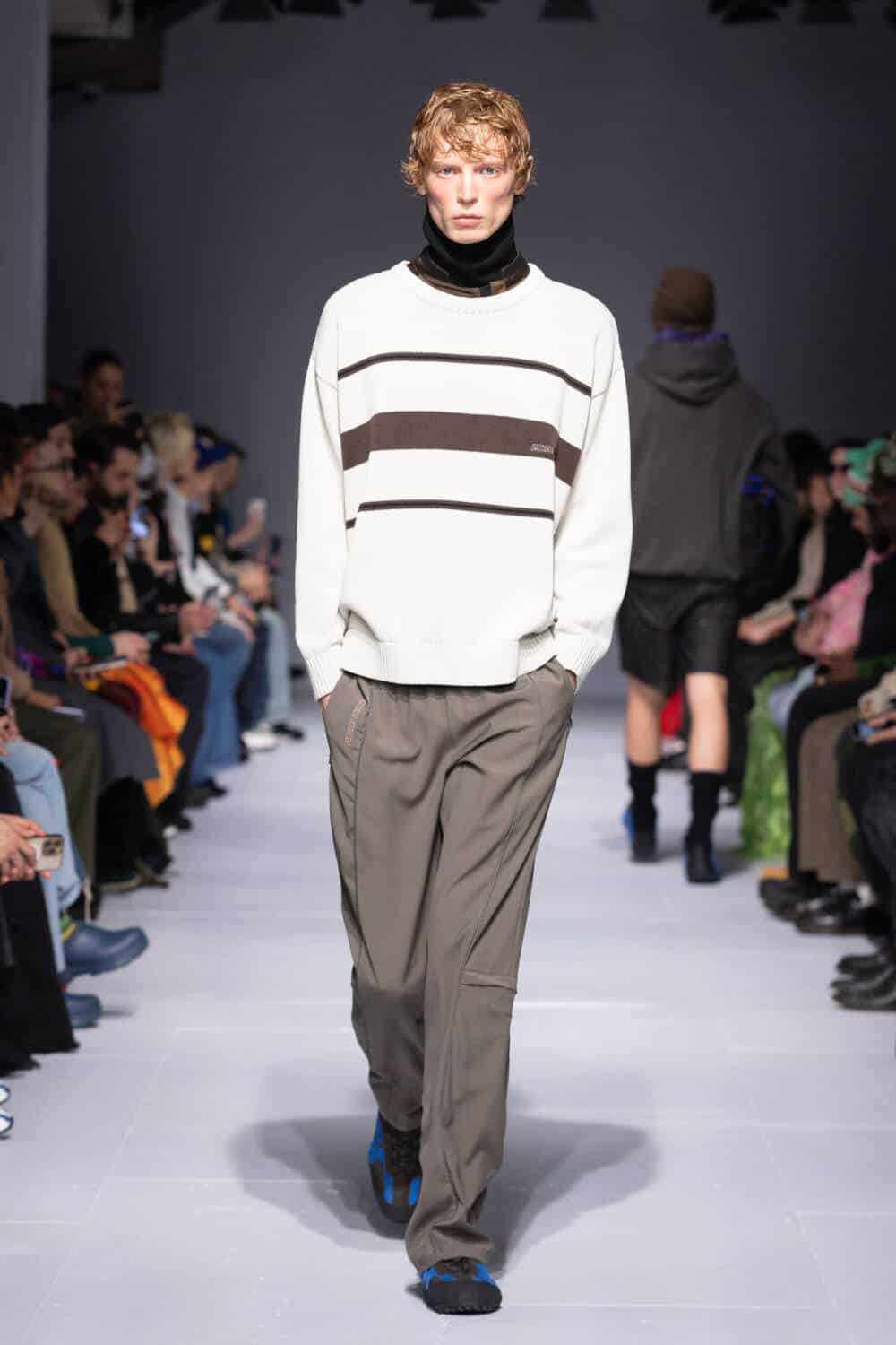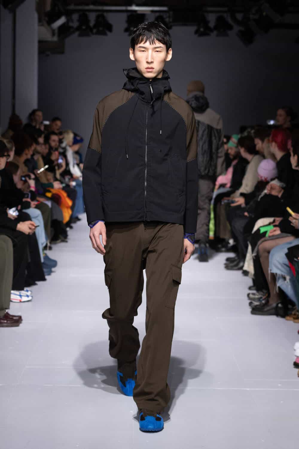 Nostalgia for her formative years growing up in Ireland has always been at the heart of Robyn Lynch’s namesake label. Everything from her dad’s old denim to holiday keepsakes from her mum, and the sportswear Lynch and her mates religiously wore in their school days has seeped into the menswear designer’s collections. This season, she turned to the competing uniform of her younger sister Adrianna, who’s a professional Irish dancer. “I vividly remember all these weekends spent in sports halls at competitions, seeing the glitz and the drama that happened on and offstage,” said Lynch, who brought an extra dash of sparkle to her signature hybrid sportswear via dancing skirts worn over technical trousers – each embroidered with Celtic knots by John Carey Design, a legend in the Irish dance scene.