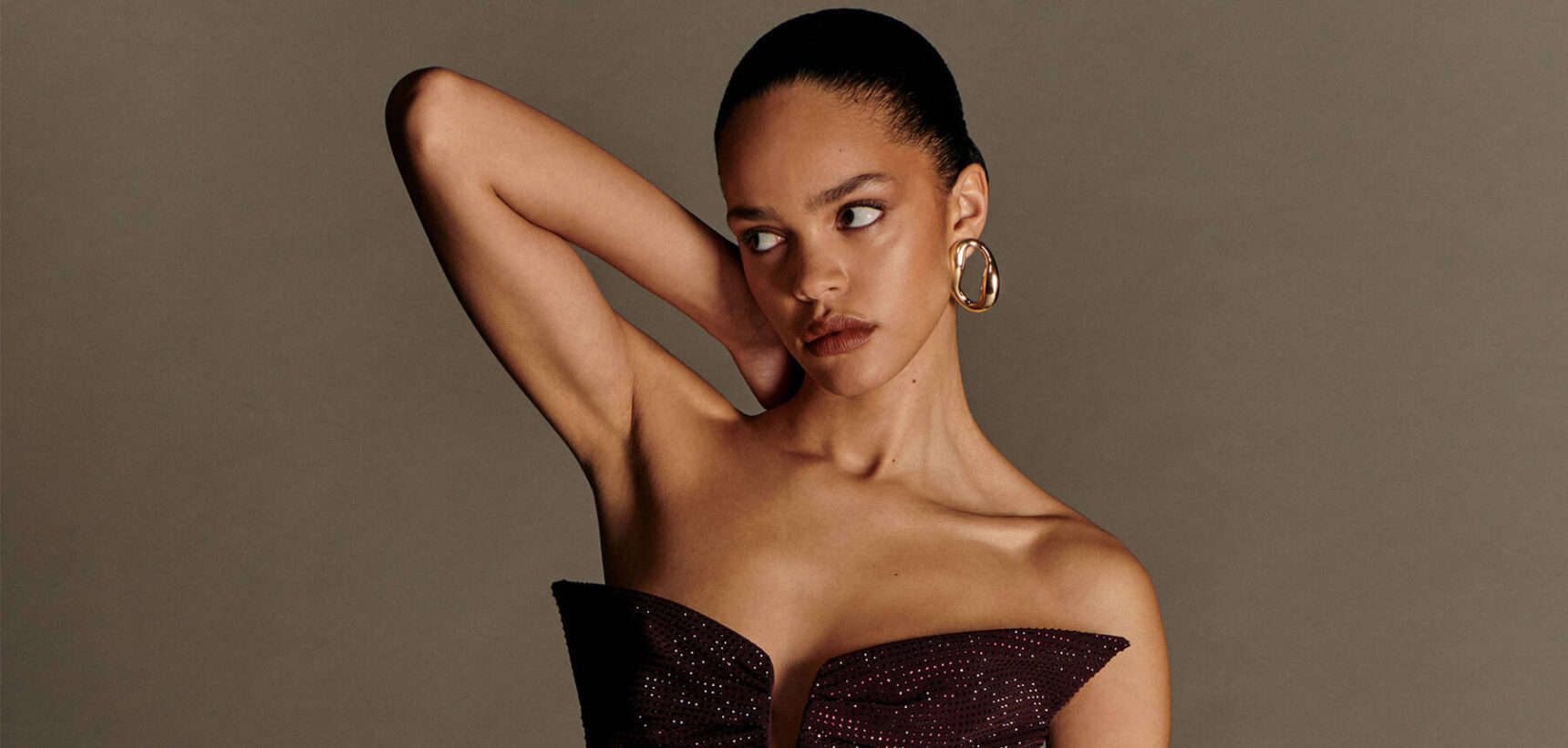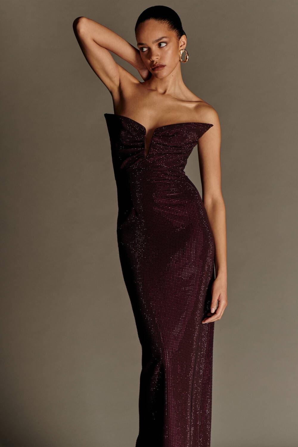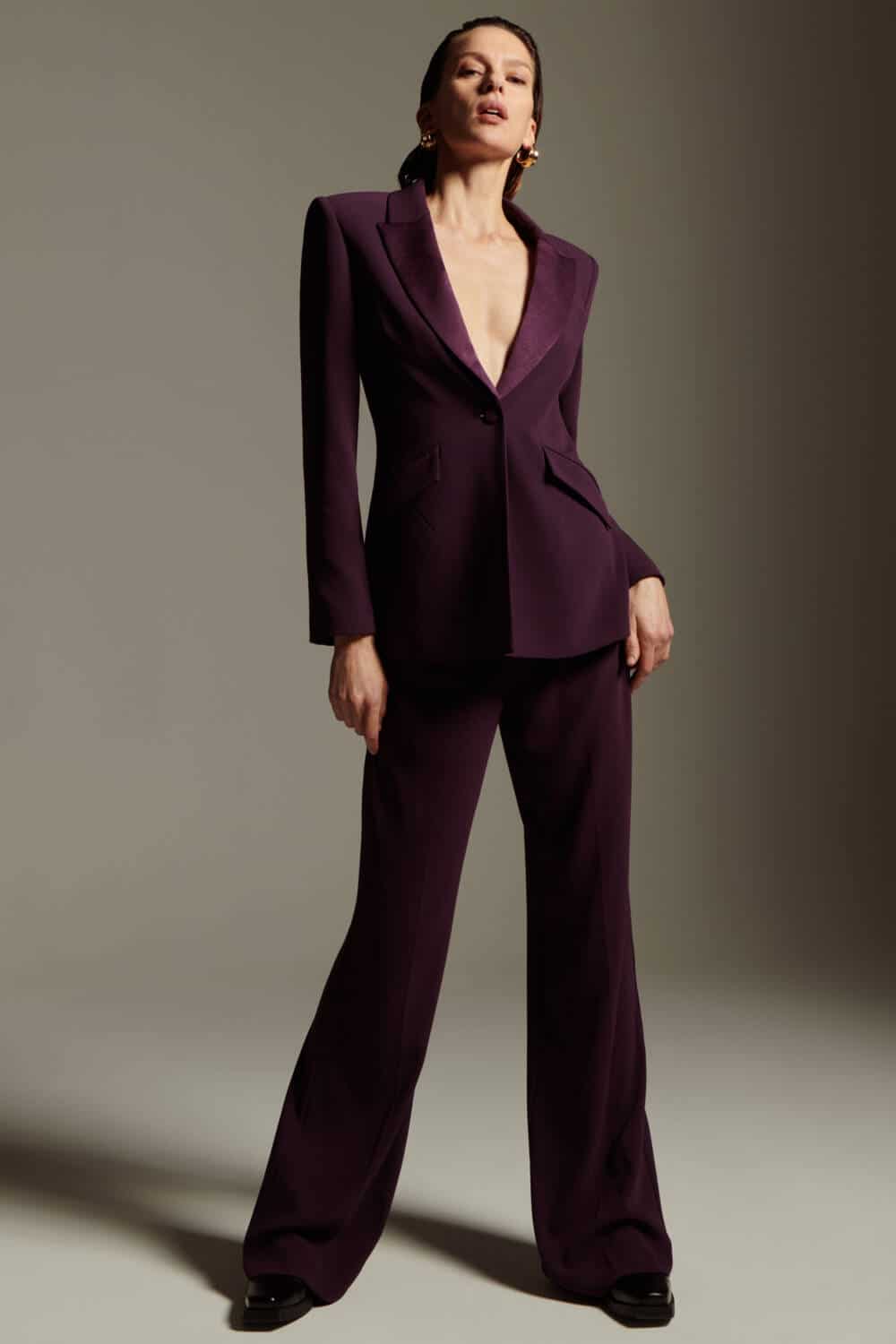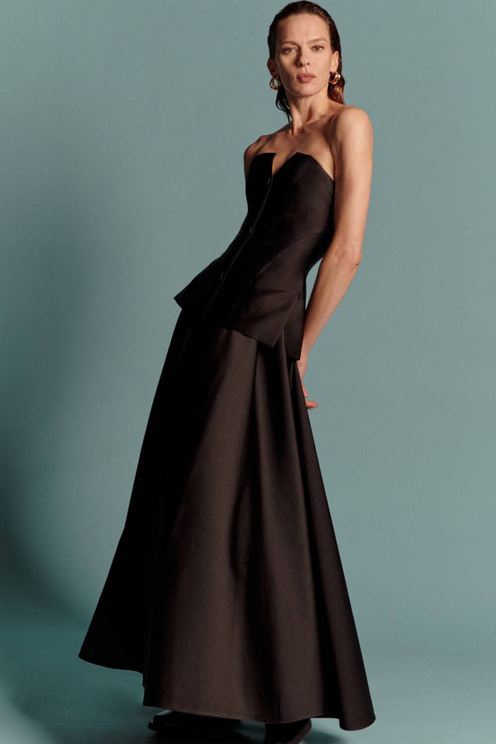 Unfolding through a “symphony of textures, hues, and meticulous design elements, all curated to capture the essence of modern elegance”, according to the collection notes, immaculate, cascading drapes of silk, taffeta, luxurious velvet and textural bouclé took notes from Old Hollywood glamour. A mixture of evening wear and tailoring, sculptural garments jutted out with peplum waists or came cinched in with satin sashes to emphasise feminine curves. New embellishments were introduced, taking shape in diamante dresses and straight-cut trousers that shimmer under the shifting light. One slender mulberry number proved to be a particular standout, cut with a vampiric, three-dimensional sweetheart neckline that jutted out into razor-sharp points at the armpit.
