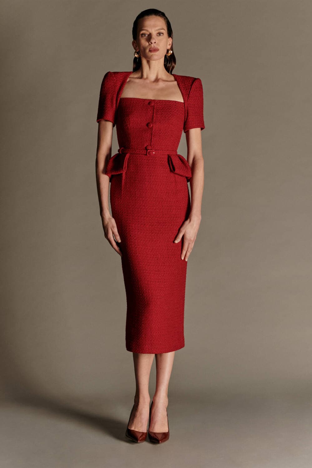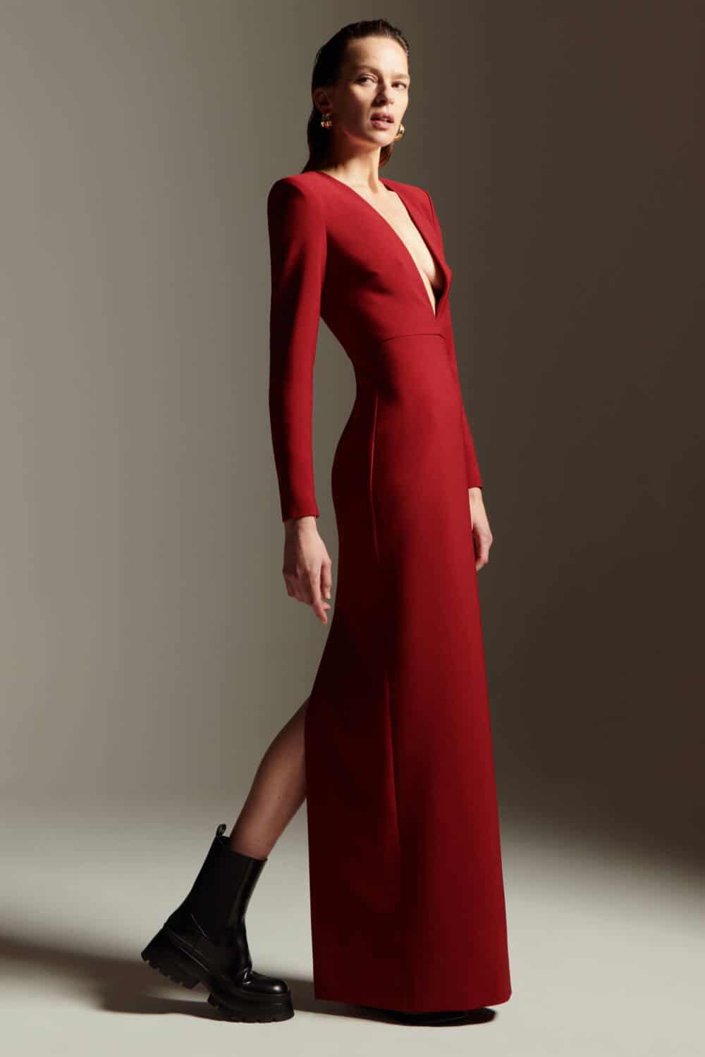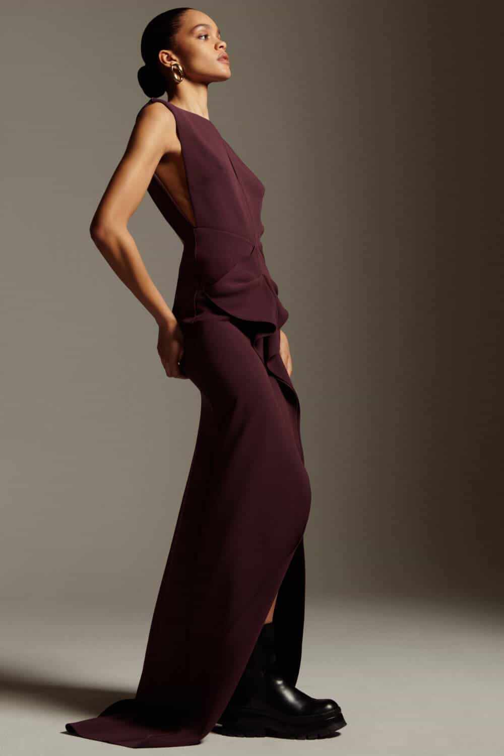 Roland Mouret, a purveyor of glamour and design excellence, has released his AW24 collection via lookbook, and it’s an alluring panoply of afternoon-tea-cum-red-carpet-ready dresses and suit variations (a long wool coat with a flared skirt, a strapless wool jumpsuits with wide legs, a slim aubergine tux, etc).