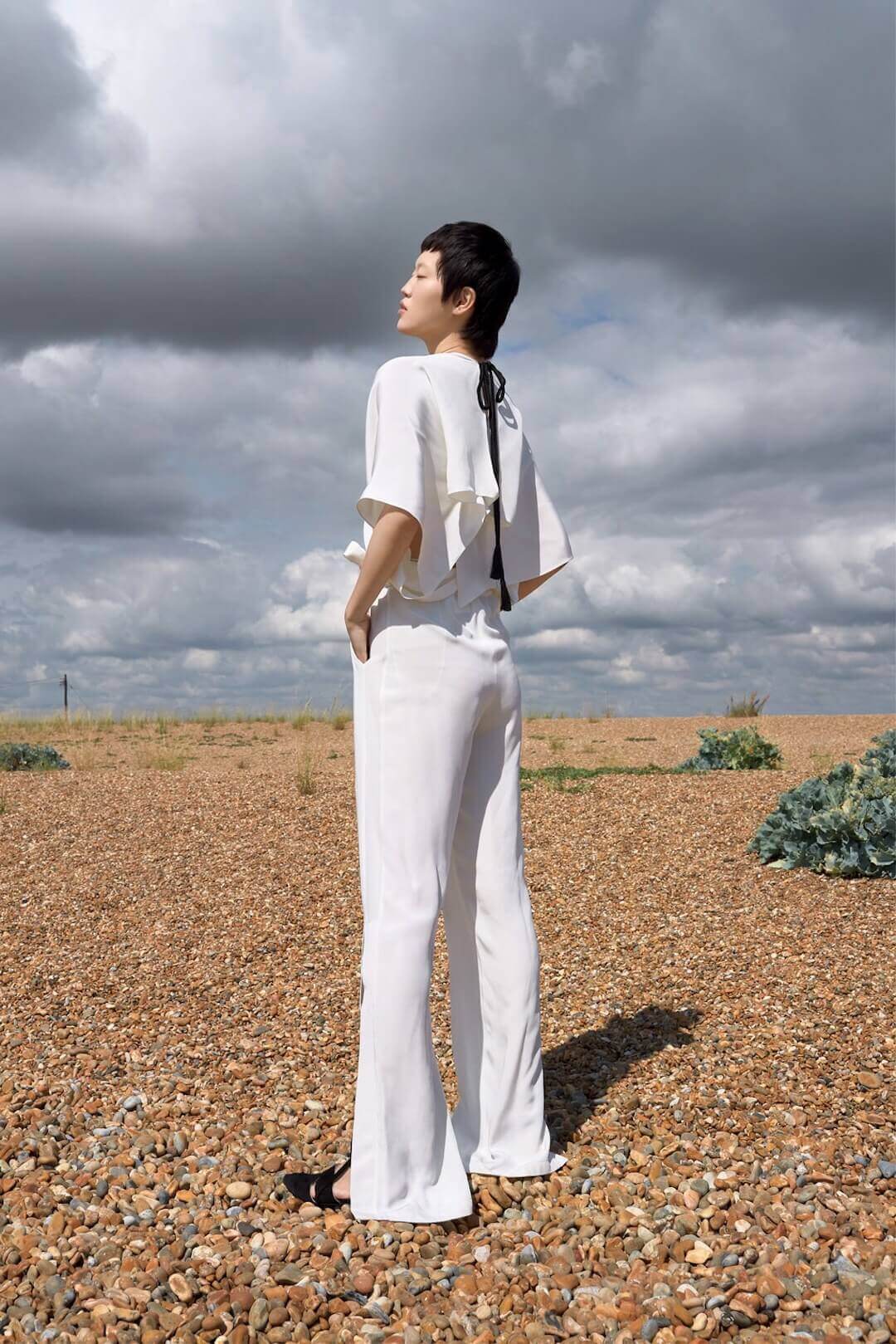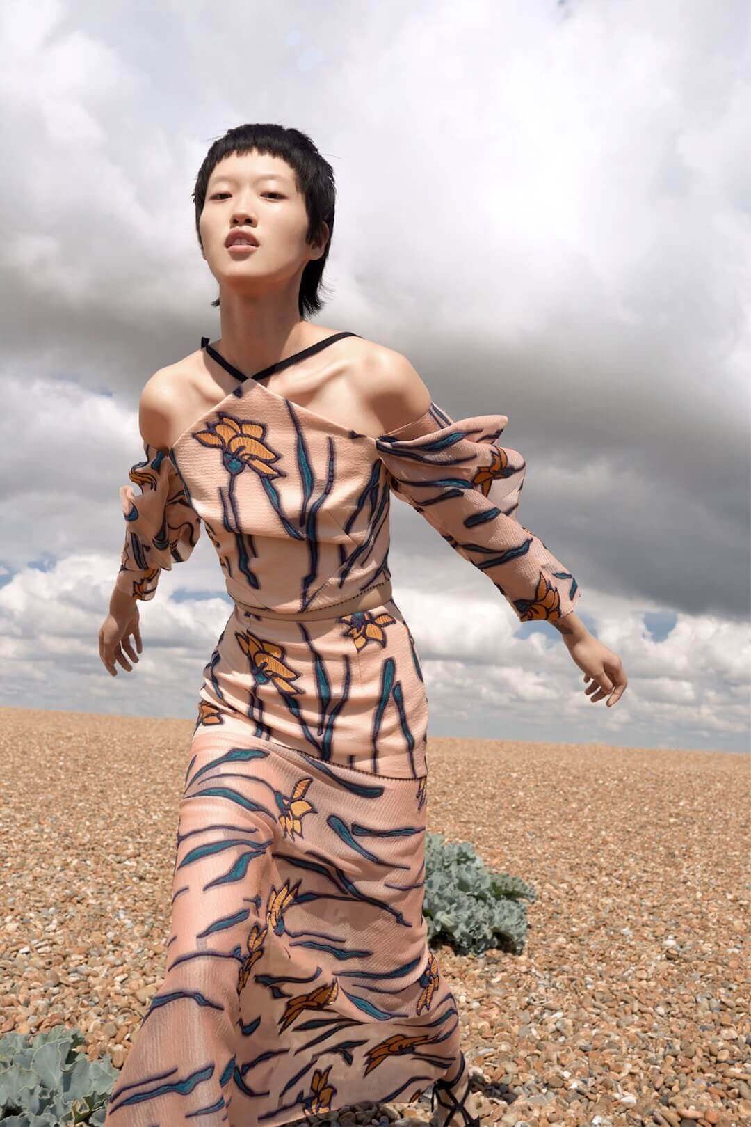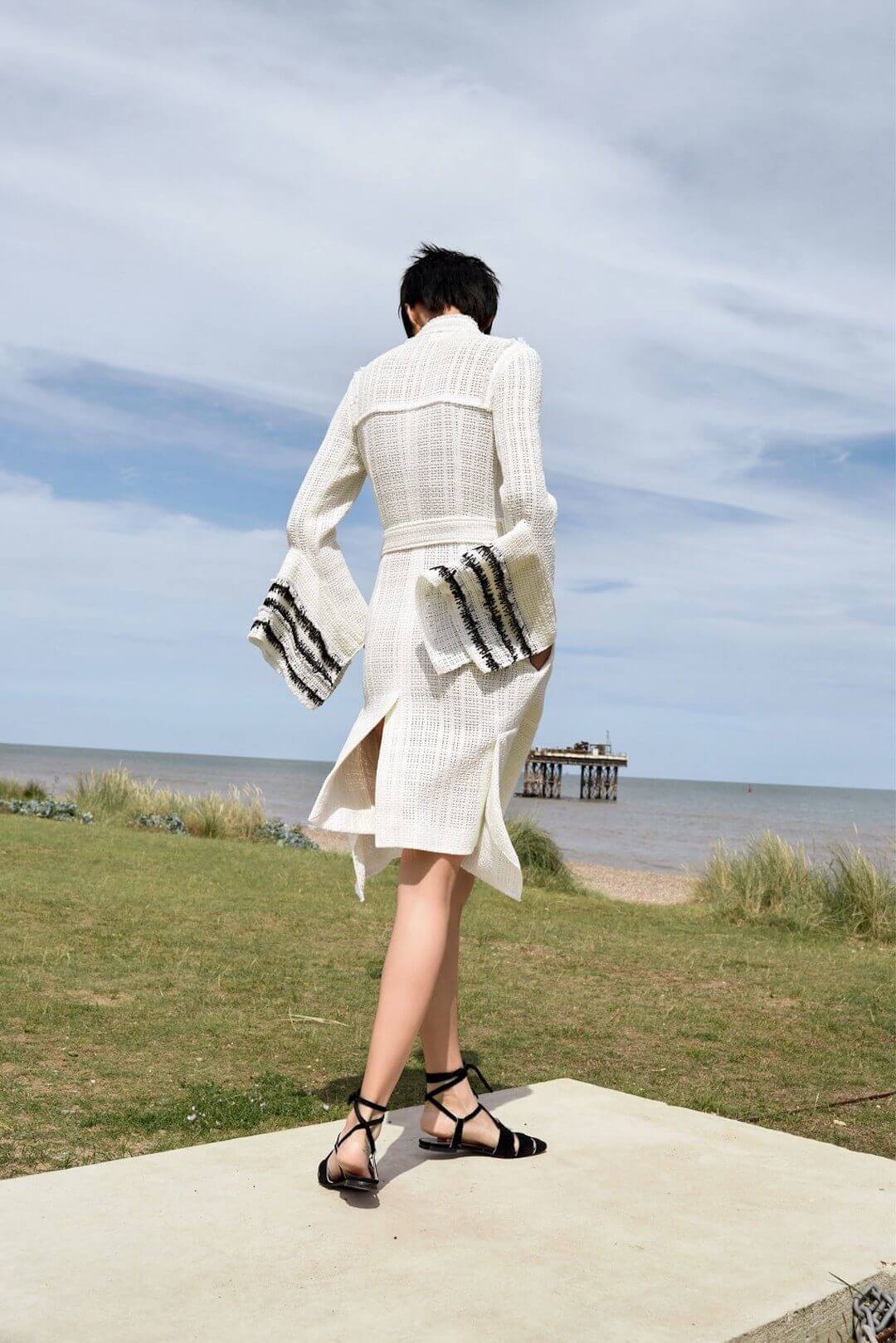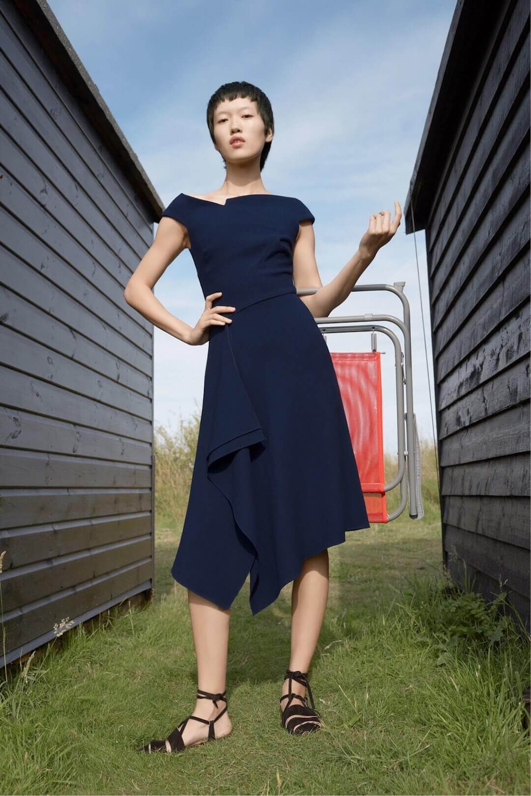 We are all well aware that Mr Mouret is a safe pair of hands when it comes to serving up a dose of “Parisienne chic” season on season, but what is perhaps lesser known is the Frenchman’s infatuation with our own fair isle. Britain is where he has long called home – the Roland Mouret design studio is here and, as of two seasons ago, it’s where Roland has chosen to show his collections – swapping the vaulted halls of Paris for the Brutalist concrete lobby of London’s National Theatre to celebrate 20 years in the business. But it’s away from London for this, his Resort 2018 collection, and to the beach – not the promenades of St Tropez, or Cannes, where you may expect a Resort collection to naturally reside – but those along the Suffolk coastline, where Britain meets the rugged North Sea. Point here being – from Paris to Mayfair to the beaches of England, and just about all that comes between, these are clothes that women can wear anywhere they may choose to be. Because these are, at heart, clothes for women. Which may sound obvious, but it’s not always so – few people have Roland’s inimitable skill of draping and slicing fabric to create clothing that both flatters and emphasises the female form. Mr Mouret knows what women want. And here, whilst Mouret’s hallmark’s remain – namely, the focus on the body, and the waist, the overlapping, asymmetric panels – there is a renewed sense of looseness that has defined his collections of late. The handkerchief hemline is pervasive throughout this latest collection, lending the silhouette a welcome fluidity, so too the suspended neckline that falls away to reveal the shoulder. Layered peplums give easy volume, whilst tweed tailoring is cut to give his woman room to move. This Resort collection, then, becomes less about clothes to wear in far-off climes – but to wear every day, and to look mighty fabulous whilst doing so.