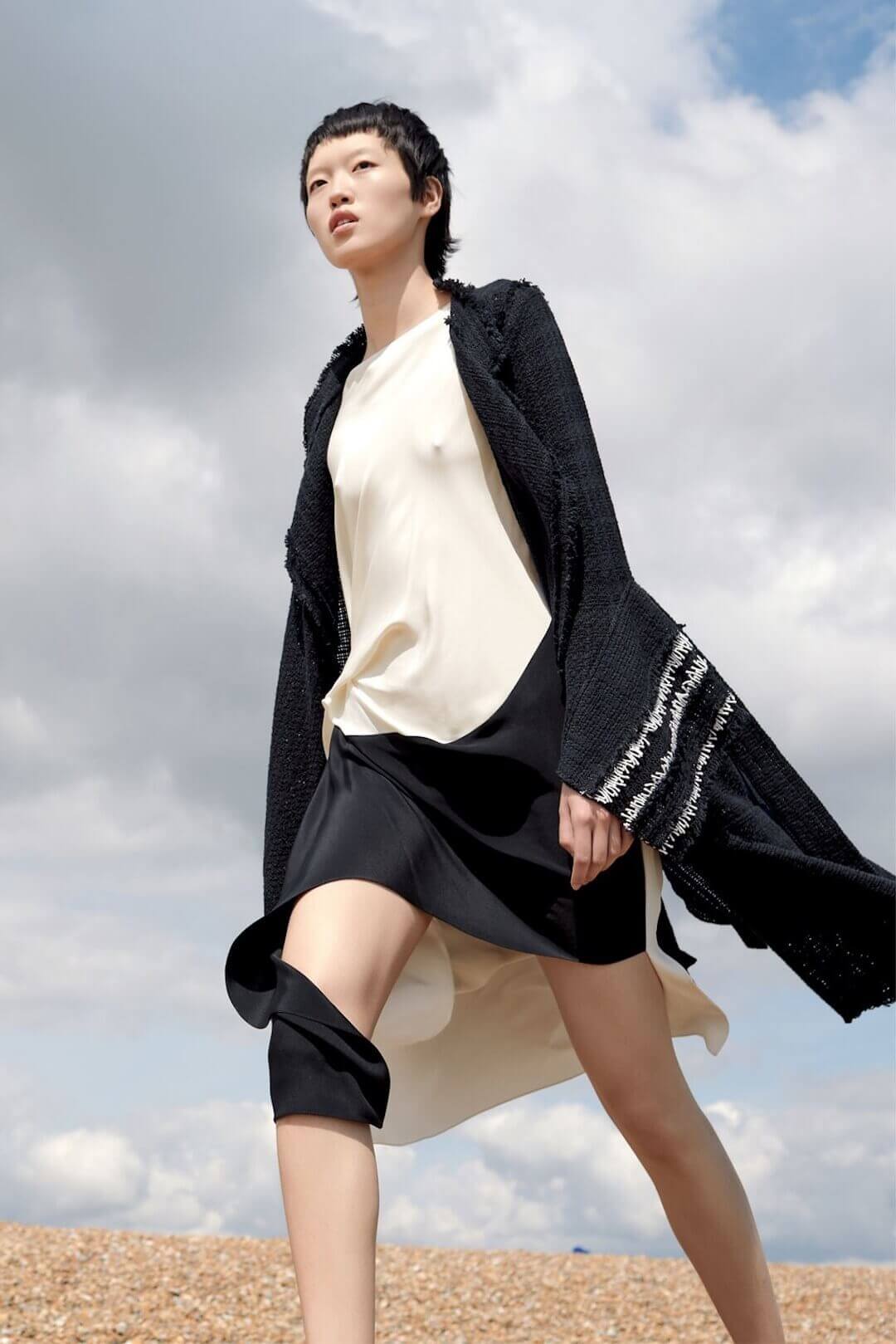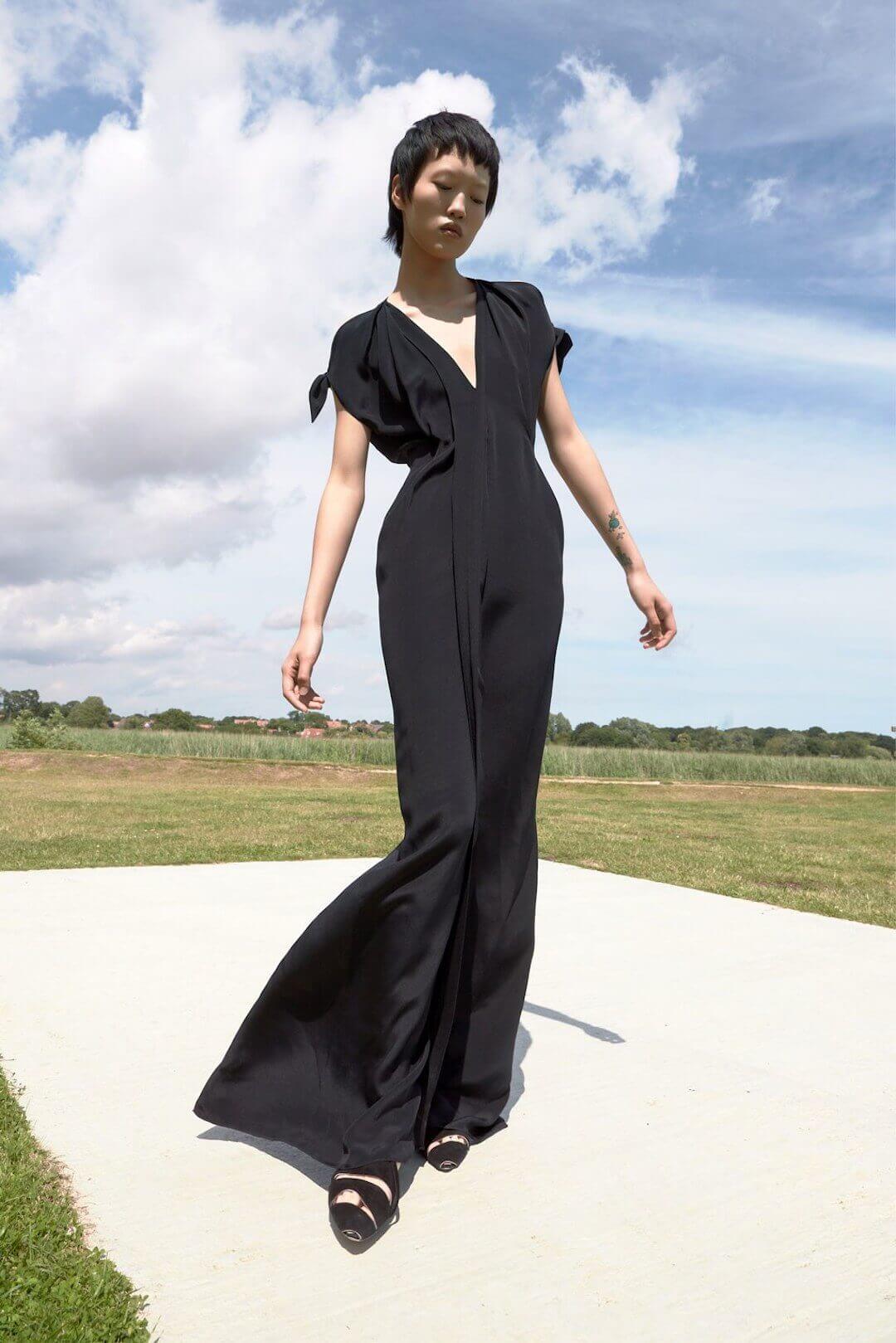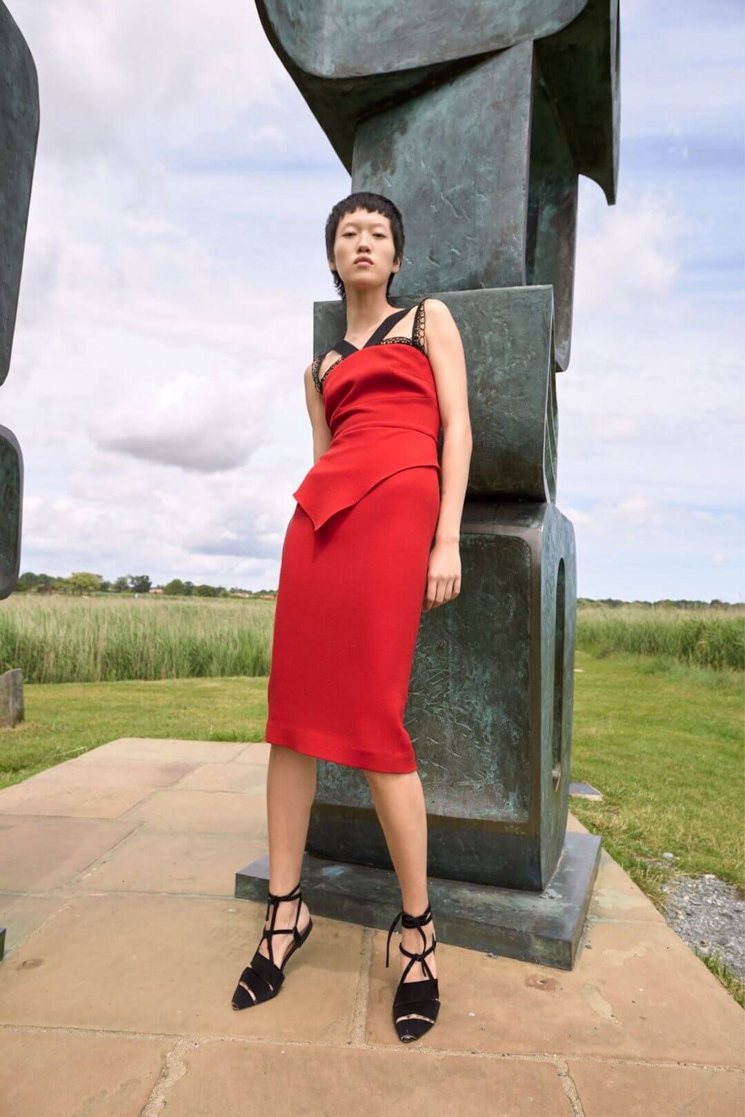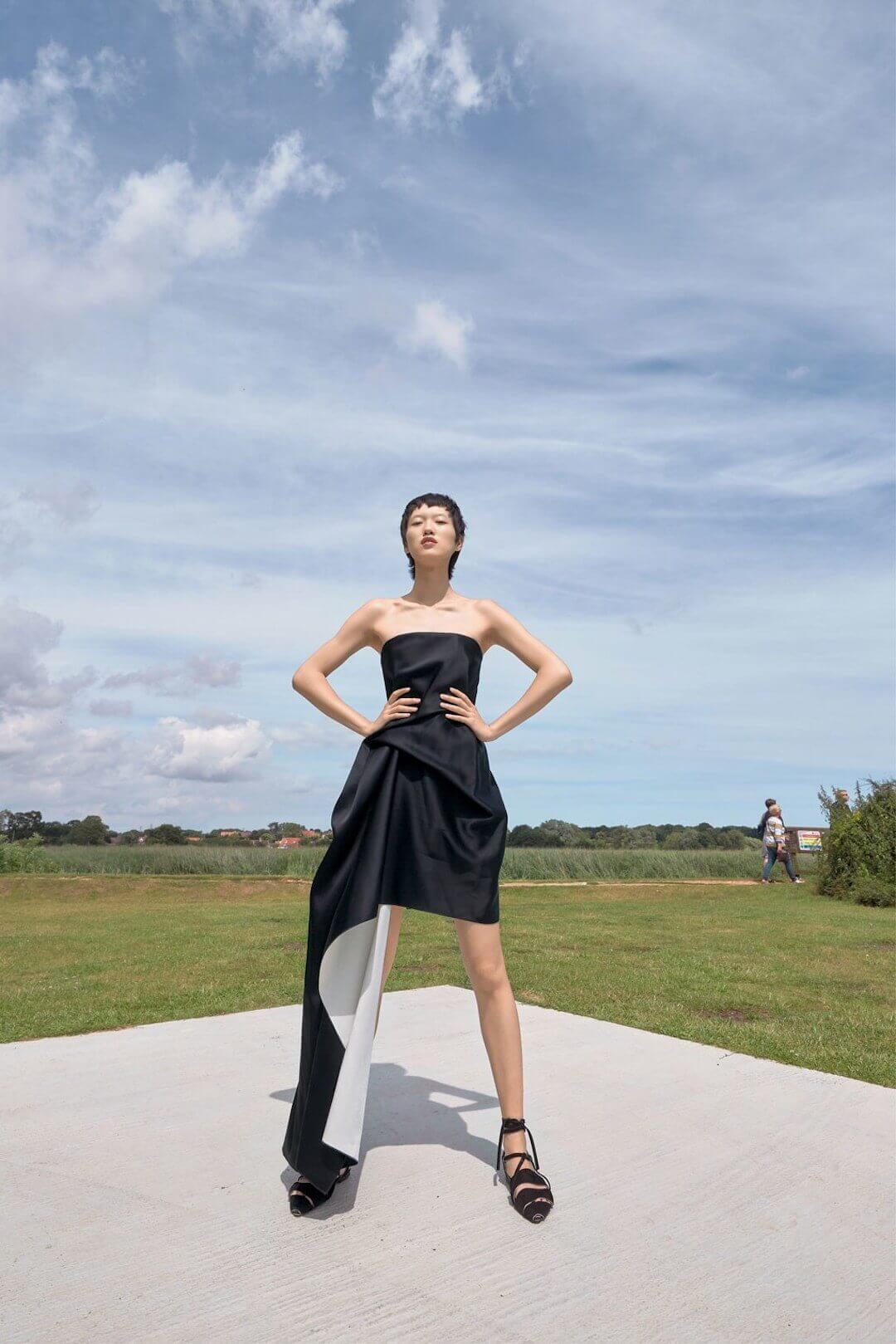 We are all well aware that Mr Mouret is a safe pair of hands when it comes to serving up a dose of “Parisienne chic” season on season, but what is perhaps lesser known is the Frenchman’s infatuation with our own fair isle. Britain is where he has long called home – the Roland Mouret design studio is here and, as of two seasons ago, it’s where Roland has chosen to show his collections – swapping the vaulted halls of Paris for the Brutalist concrete lobby of London’s National Theatre to celebrate 20 years in the business. But it’s away from London for this, his Resort 2018 collection, and to the beach – not the promenades of St Tropez, or Cannes, where you may expect a Resort collection to naturally reside – but those along the Suffolk coastline, where Britain meets the rugged North Sea. Point here being – from Paris to Mayfair to the beaches of England, and just about all that comes between, these are clothes that women can wear anywhere they may choose to be. Because these are, at heart, clothes for women. Which may sound obvious, but it’s not always so – few people have Roland’s inimitable skill of draping and slicing fabric to create clothing that both flatters and emphasises the female form. Mr Mouret knows what women want. And here, whilst Mouret’s hallmark’s remain – namely, the focus on the body, and the waist, the overlapping, asymmetric panels – there is a renewed sense of looseness that has defined his collections of late. The handkerchief hemline is pervasive throughout this latest collection, lending the silhouette a welcome fluidity, so too the suspended neckline that falls away to reveal the shoulder. Layered peplums give easy volume, whilst tweed tailoring is cut to give his woman room to move. This Resort collection, then, becomes less about clothes to wear in far-off climes – but to wear every day, and to look mighty fabulous whilst doing so.