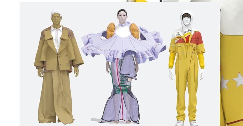 “I made a static display video with the software: CLO. I used CLO to make clothes of my final collection by transferring my 2D illustrations to the 3D garments, to show the progress of my design. Due to the current situation, the fashion industry focuses on sustainable environmental protection, and the digital way of presenting my design is a very effective way to protect the environment. My final collection is a combination of science and technology. One can view my three-dimensional work to present my sculptural identity.”