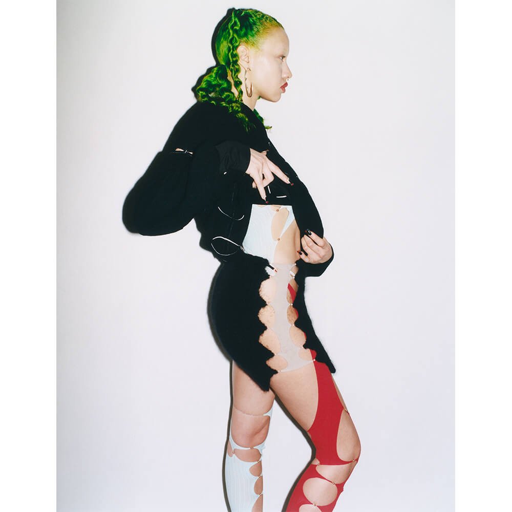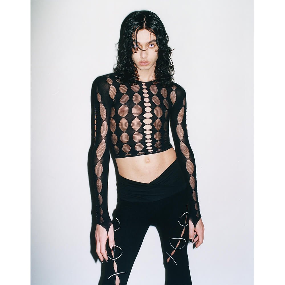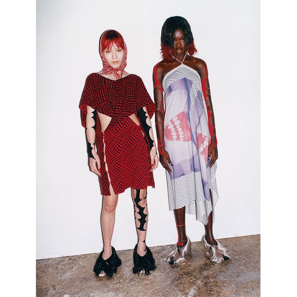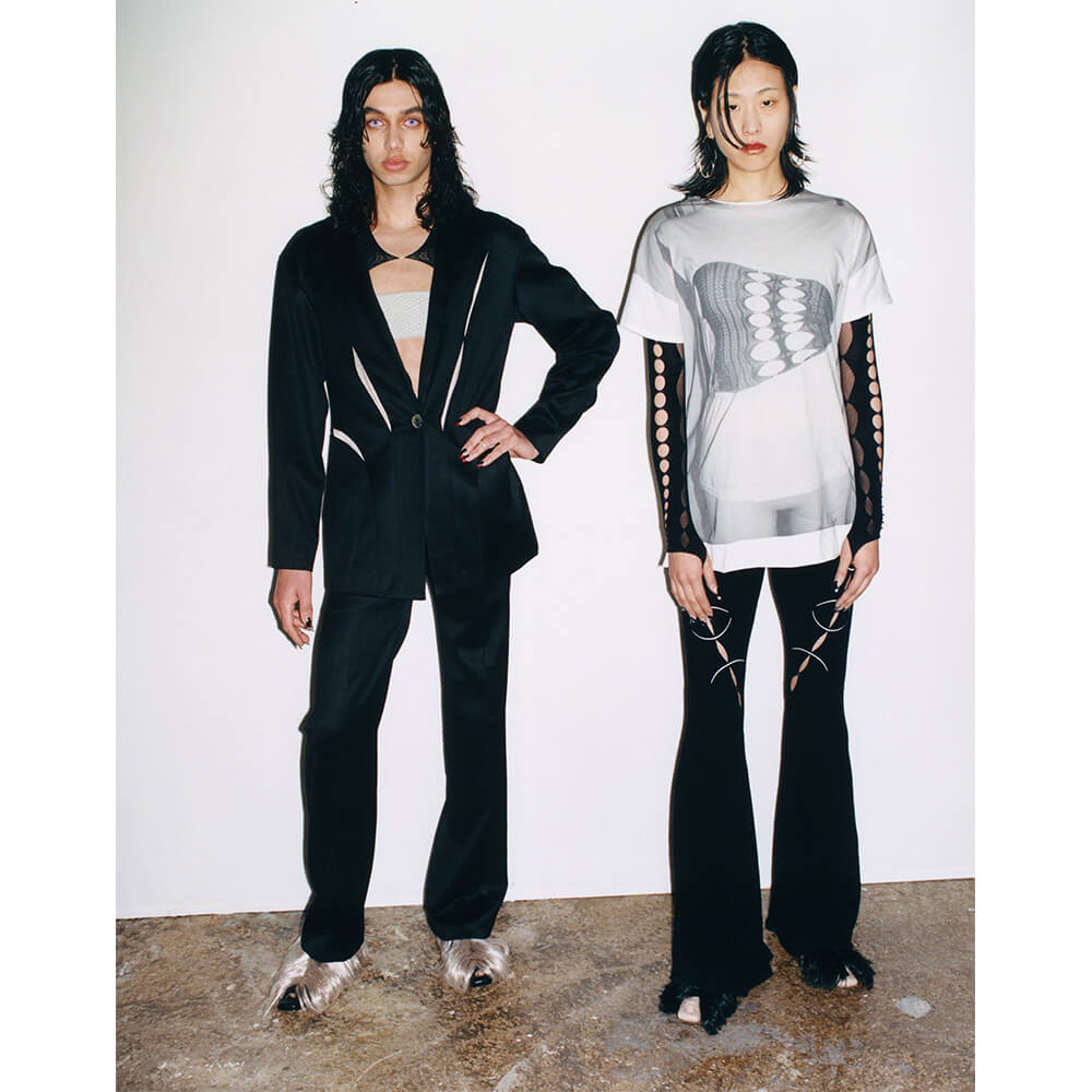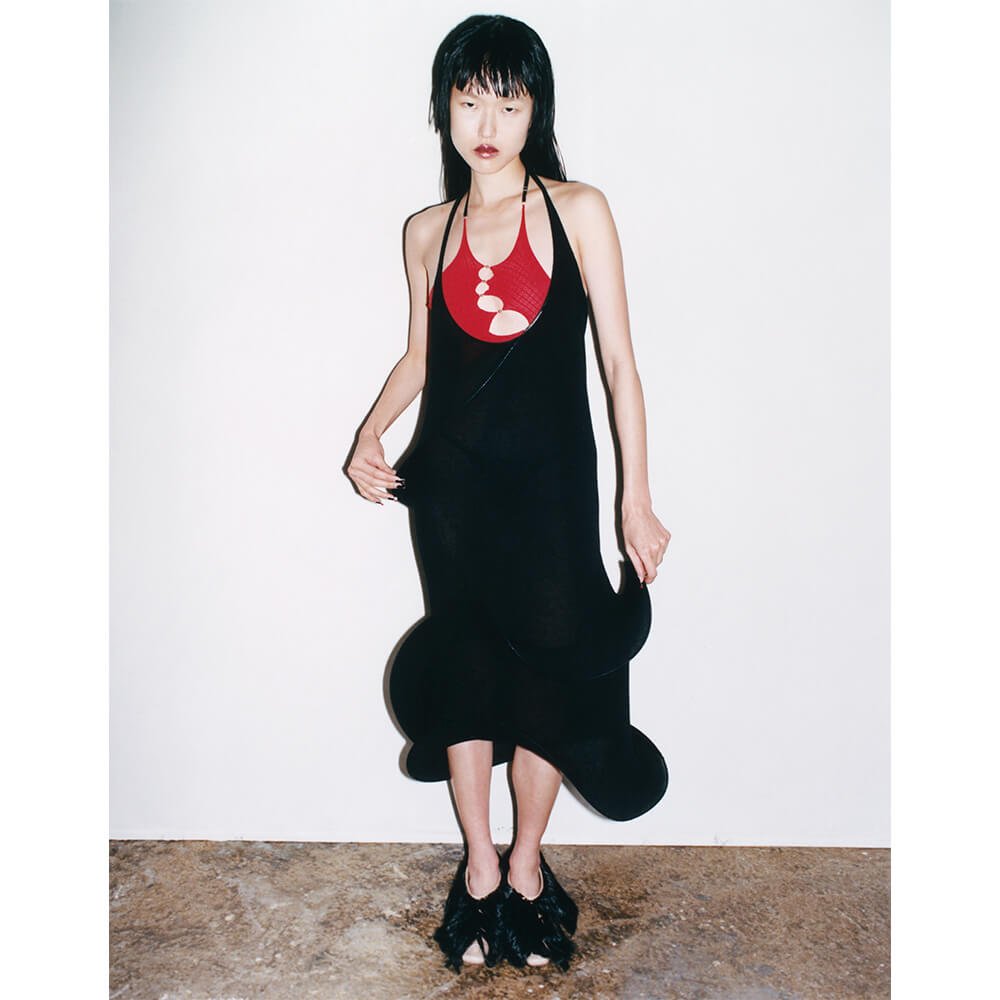 The brand – which took home the 2021 Karl Lagerfeld LVMH Prize for Young Designers – employed a range of modern technologies to present reinterpretations of its signature cut-out, fine knit pieces. Textures, sometimes developed using 3D whole-garment-knitting techniques, steal the show. Tired of the traditional cotton jersey? Here, open-work, transparent segments of dresses contrast cosy, woollen tops, and everything is surrounded by circular holes and asymmetrical cuts.