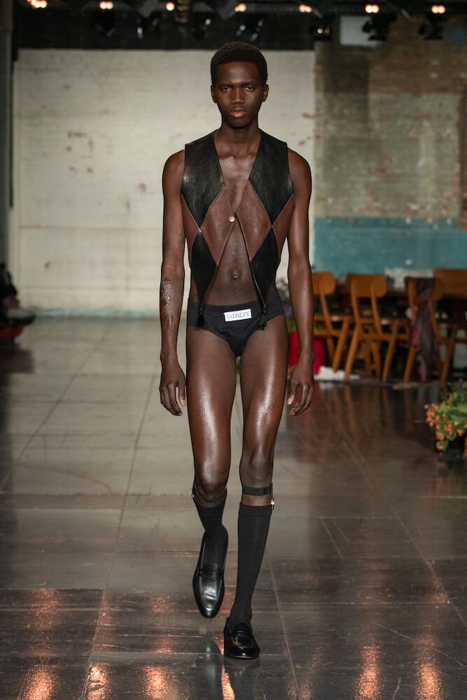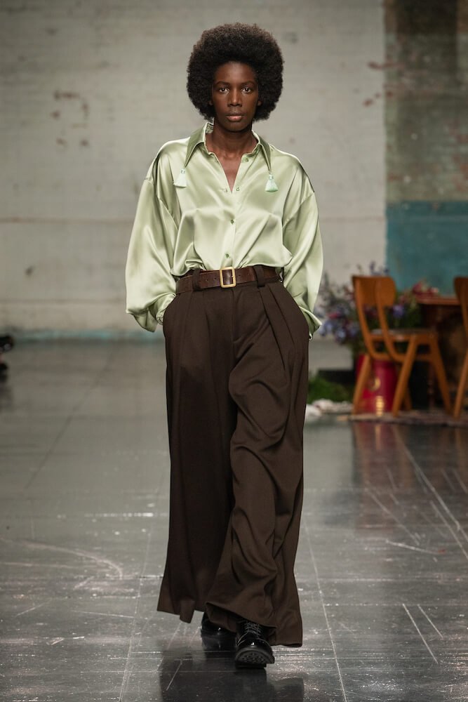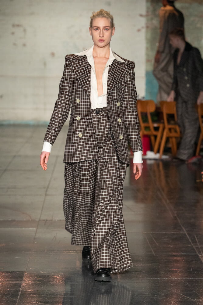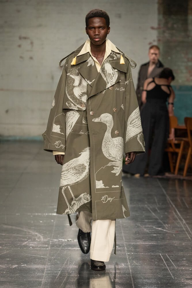 It’s all about character for S.S.Daley. The designer, a semi-finalist for this year’s LVMH prize, has a knack for storytelling and writes narratives for each look. Lives, loves and motivations are explored. The clothes come alive on his cast of dancers and actors as does his intention – to explore the English class divide, and to break the constrictions of a codified world.