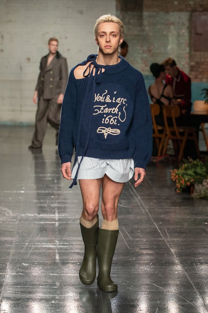 He was inspired by the dissolution of the stately homes in the 20th Century, when many were sold off or fell into disrepair after the war. Lords, ladies and servants cavorted in his signature Oxford bags, and silken shirts, hung with curtain tassels for extra flourish. Diamonds of surplus leather were crafted into a waistcoat, whilst louche windowpane check suits and tuxedo shirts, worn by men and women, spoke a secret language of desire. Every piece had a sensual edge, including a balloon sleeved trench, covered in 17th Century poppy etchings. The knitwear was stand-out: from a cute cropped cable knit to an asymmetric jumper with the words “You & I are Earth” scrolled across it. The phrase, which came from a fragment of a 17th Century plate found in a London sewer, speaks to Daley’s romantic, soulful character.. These are clothes designed with emotion and worn with feeling.