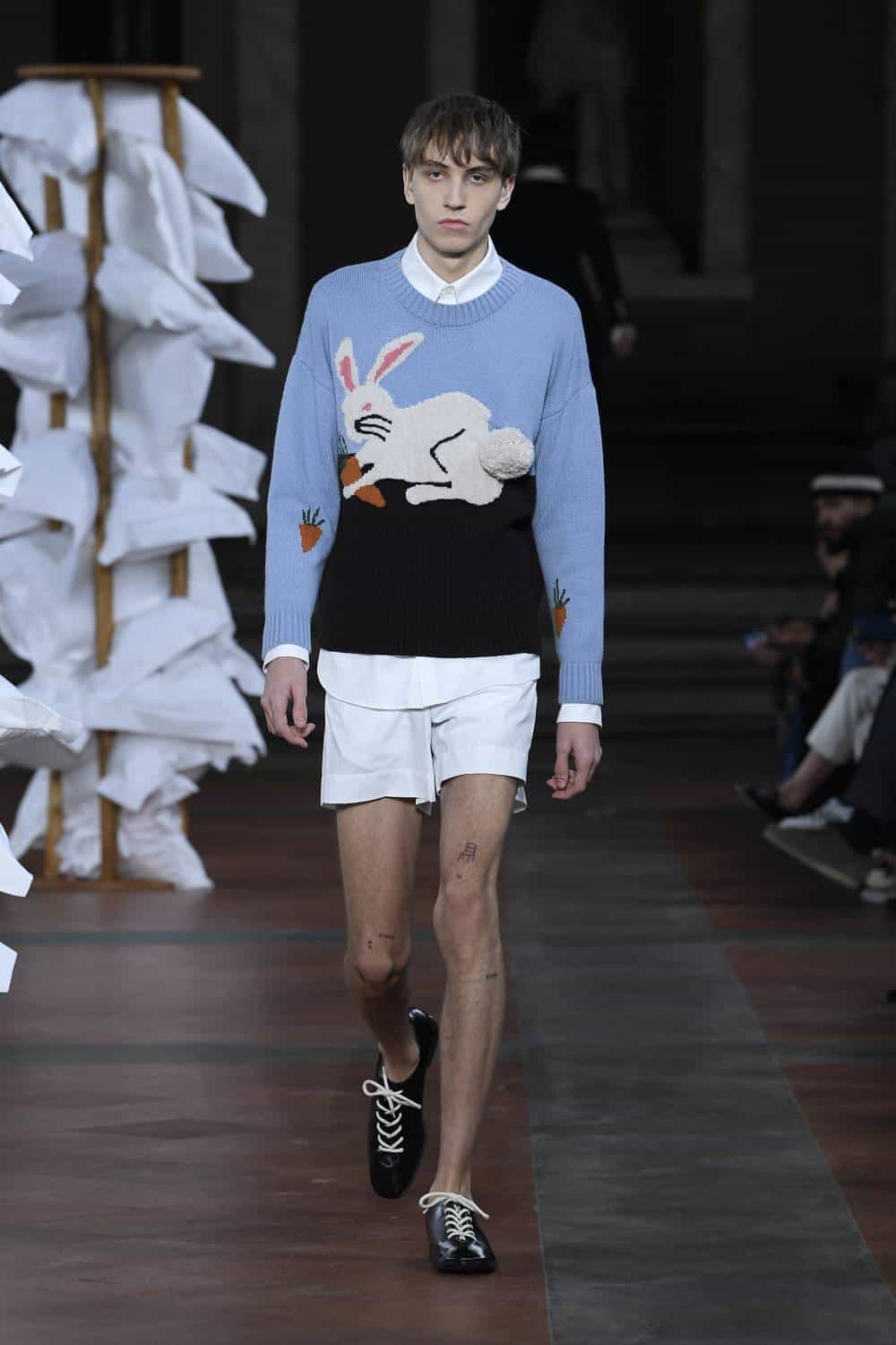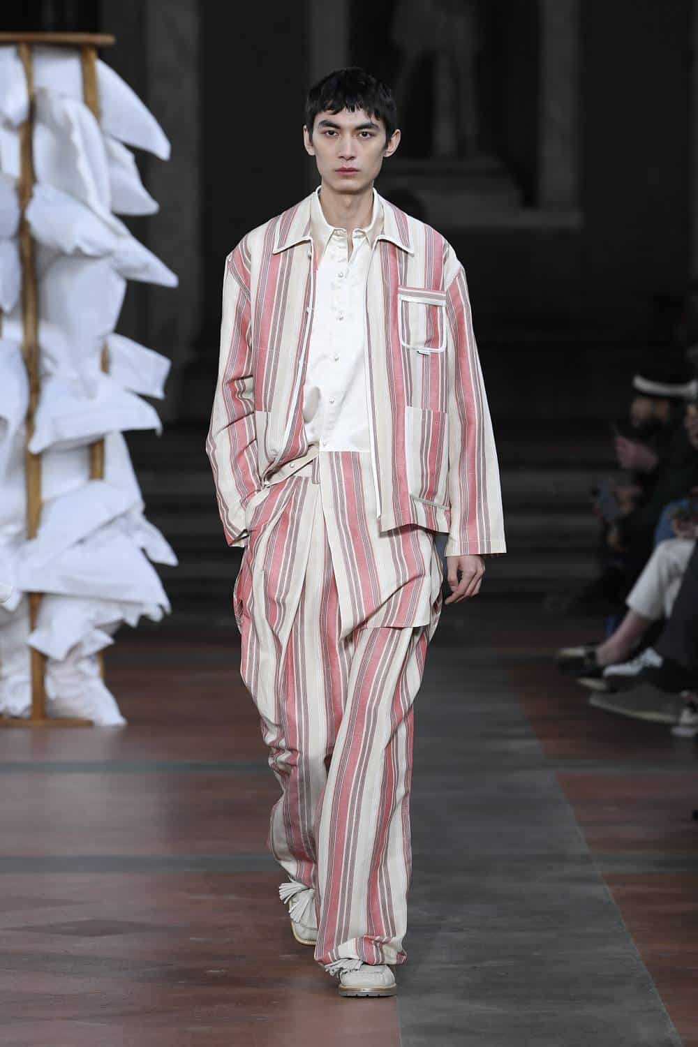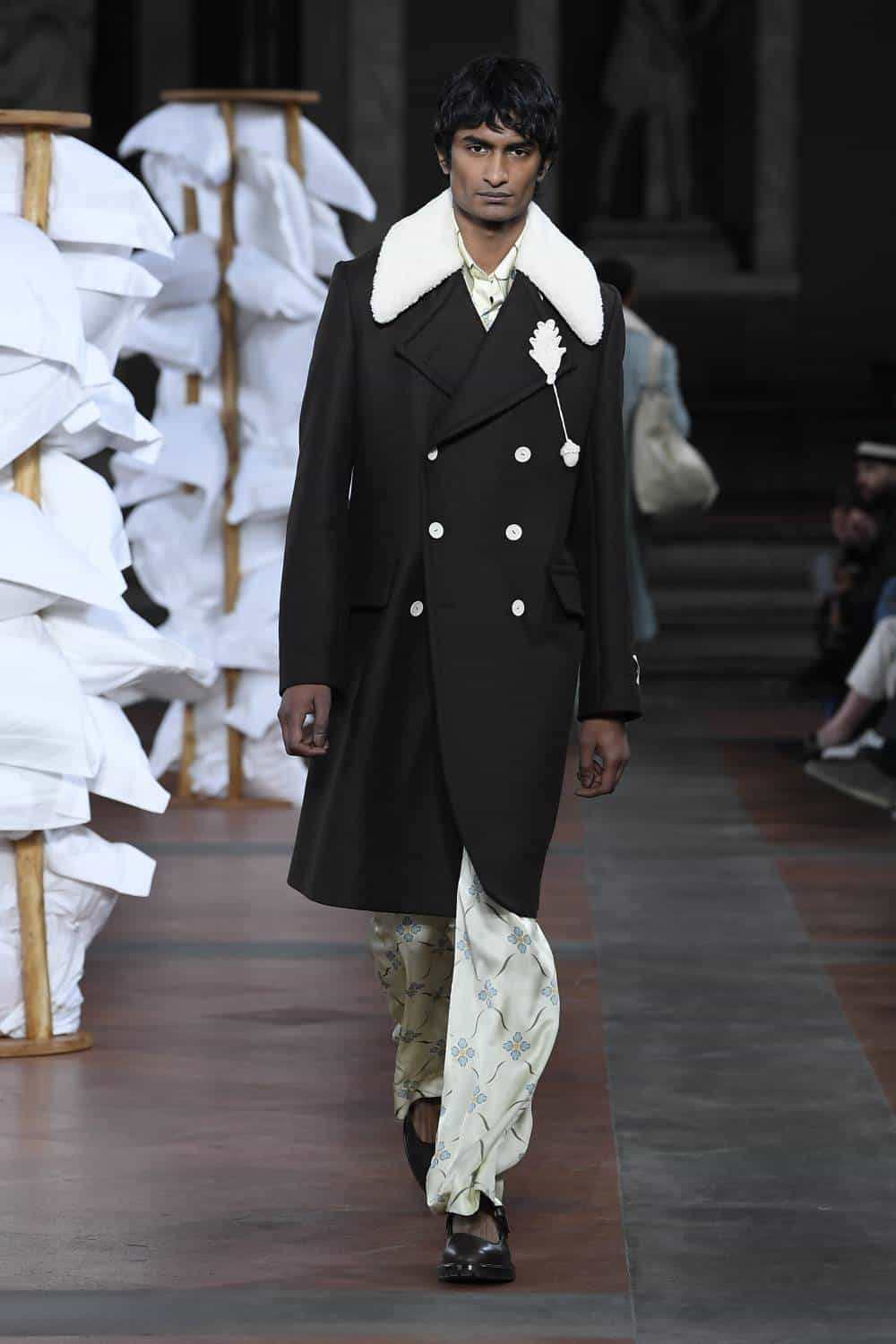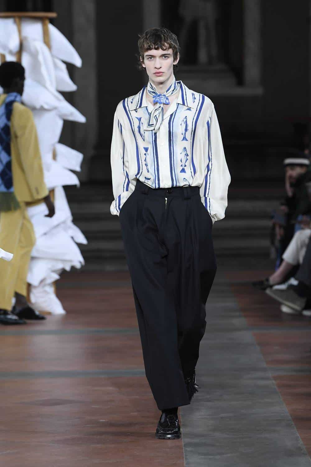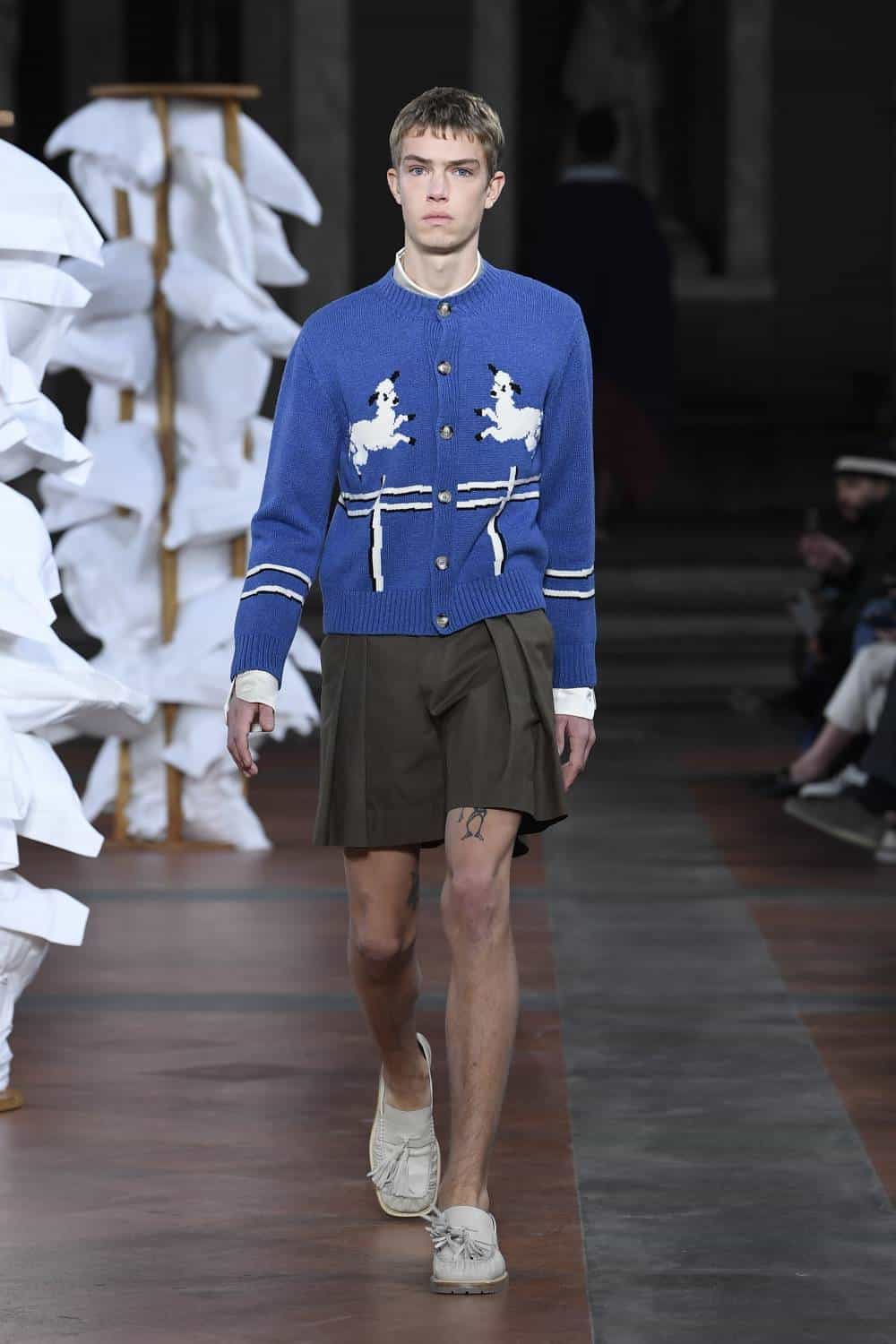 Elsewhere, Daley’s signature billowing trousers were swapped for more slender suits, as the designer revealed backstage he’d begun working with more factories in Italy to craft his collections. There was also military-inspired woollen coats, night shirts dressed up with paintings of fishes and boyish knits featuring cute, animal motifs – making for a well-rounded wardrobe that’ll delight the designer’s growing, loyal fanbase (Mr Styles included).