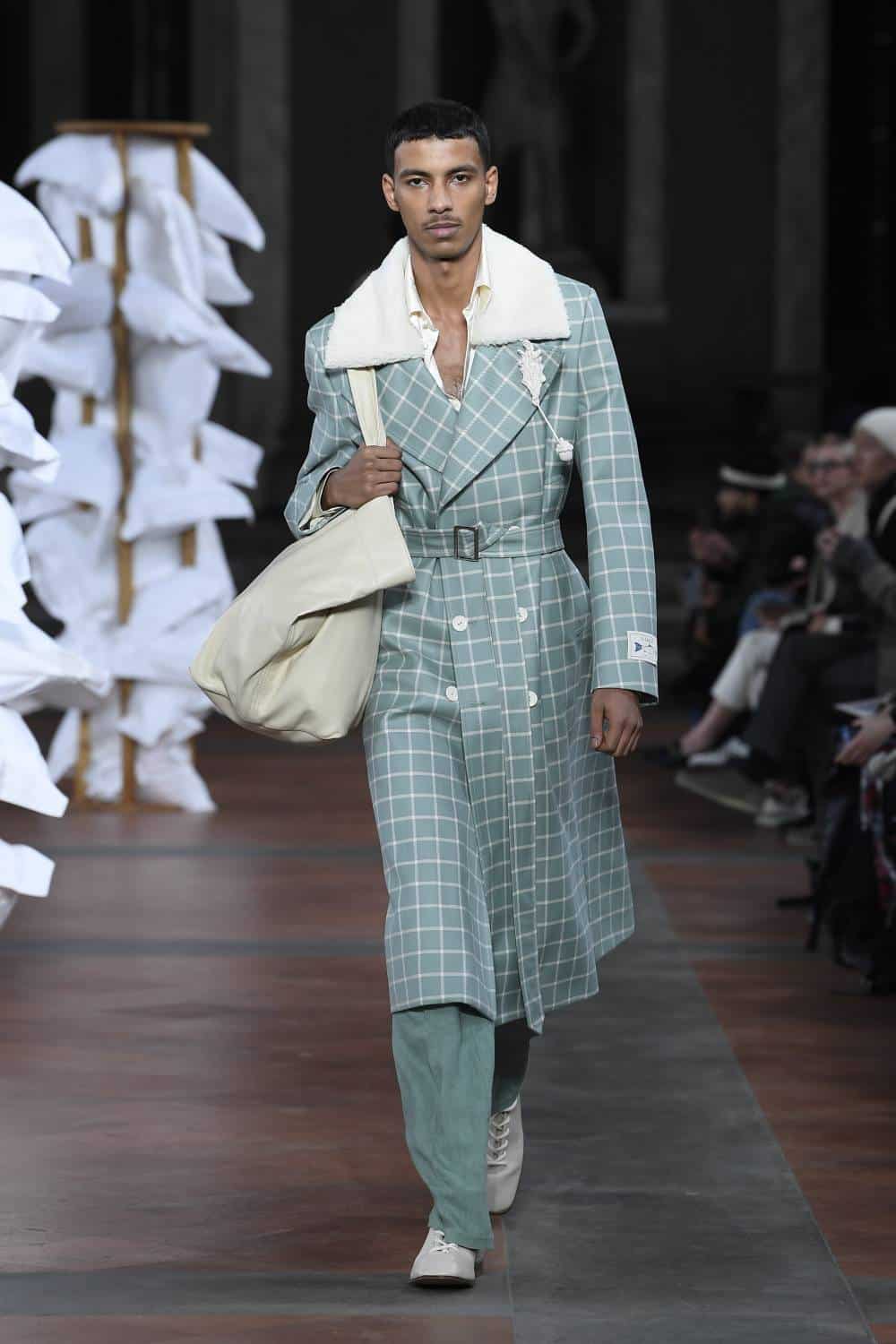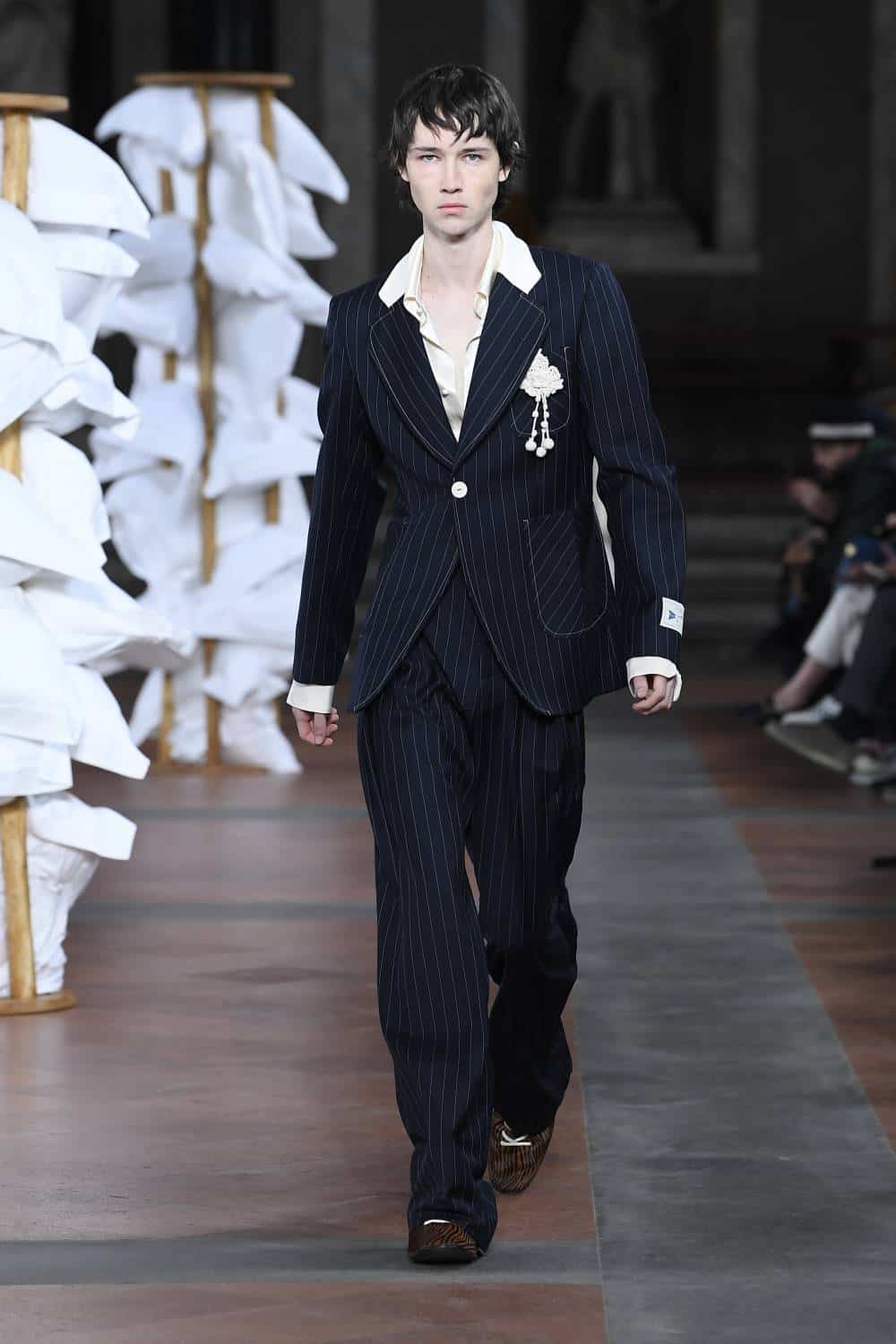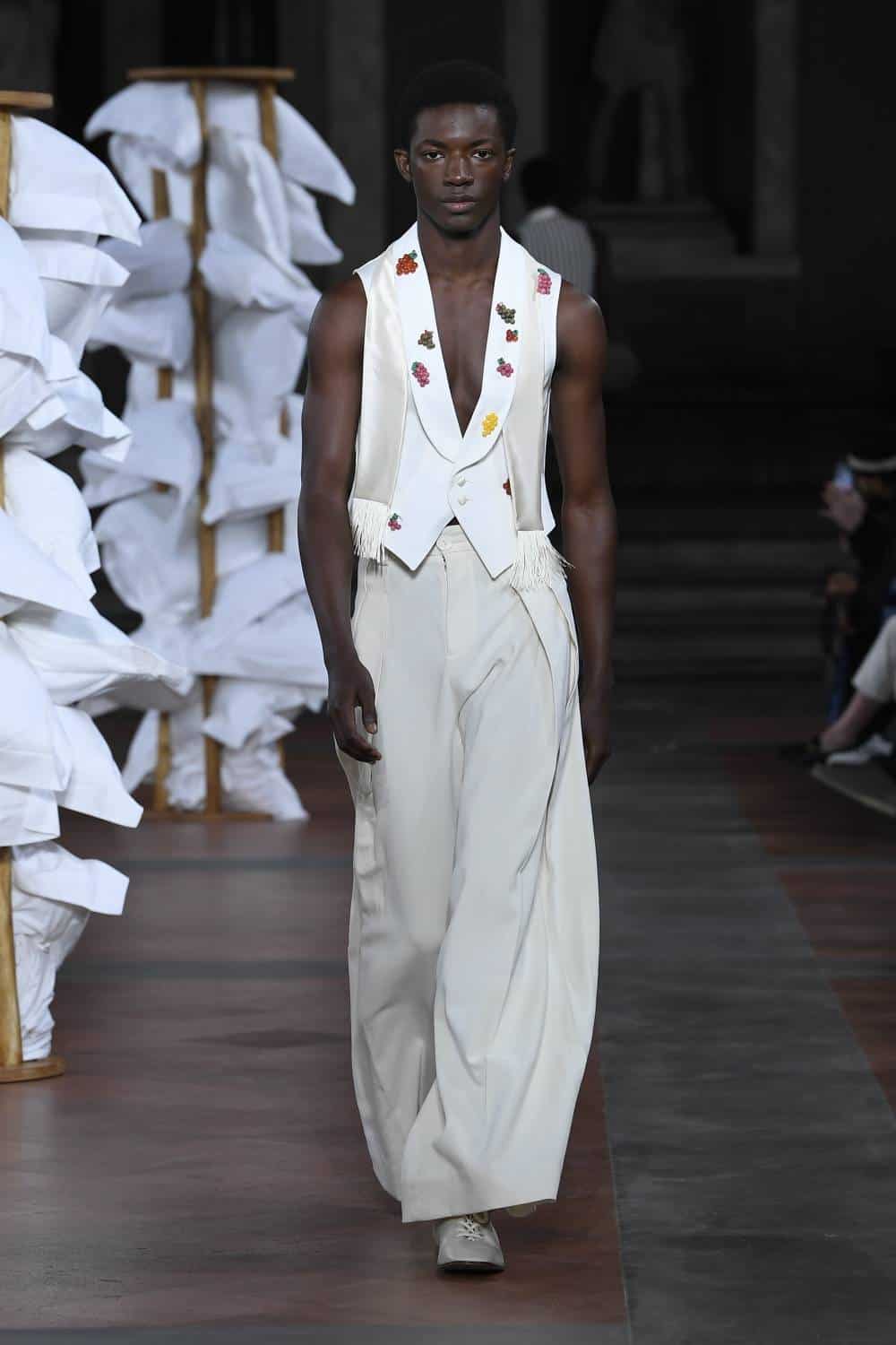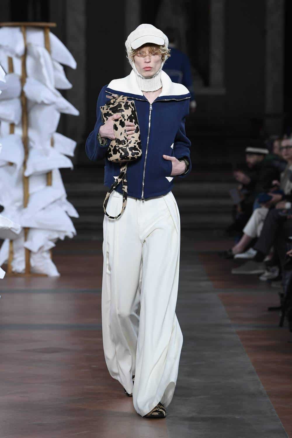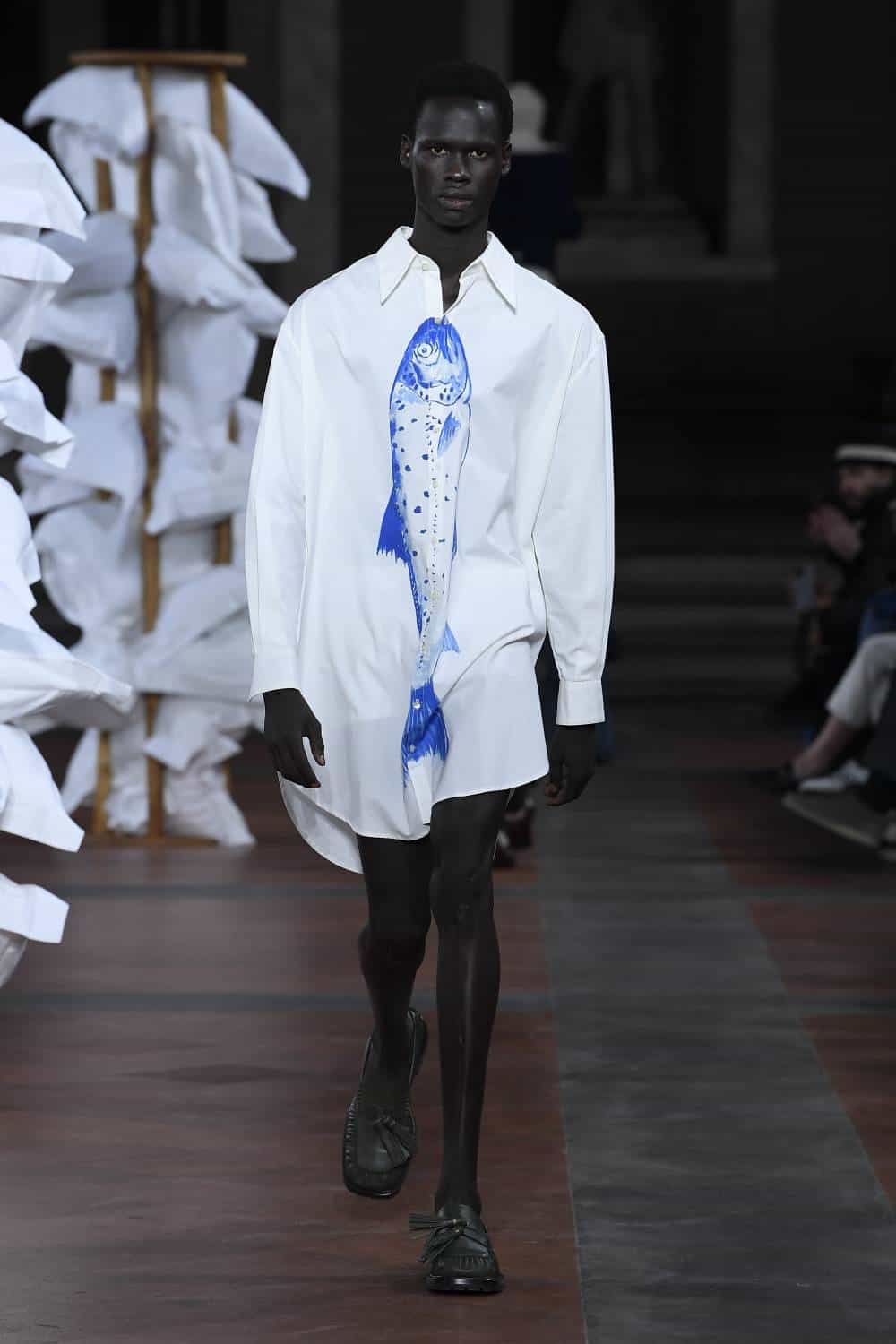 Elsewhere, Daley’s signature billowing trousers were swapped for more slender suits, as the designer revealed backstage he’d begun working with more factories in Italy to craft his collections. There was also military-inspired woollen coats, night shirts dressed up with paintings of fishes and boyish knits featuring cute, animal motifs – making for a well-rounded wardrobe that’ll delight the designer’s growing, loyal fanbase (Mr Styles included).