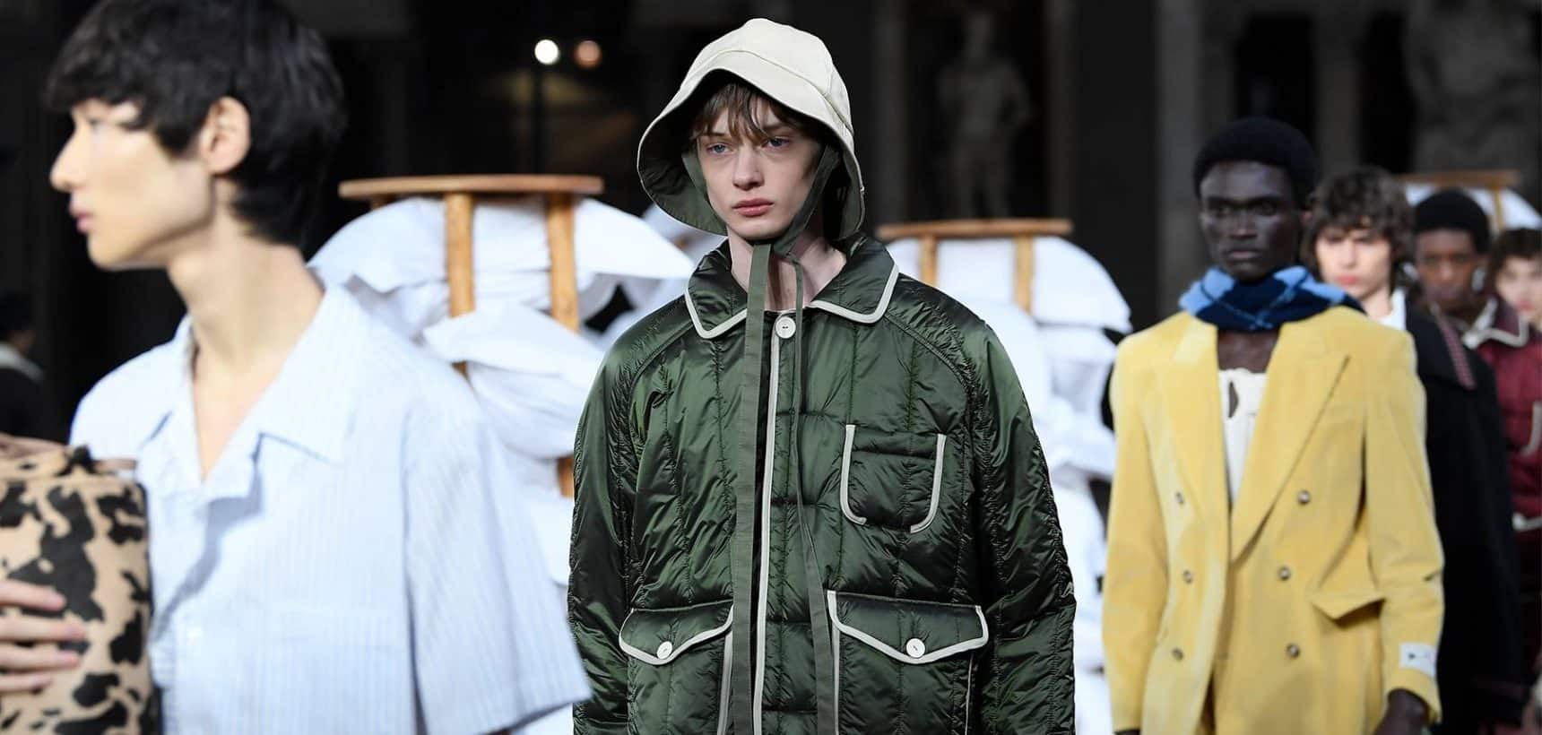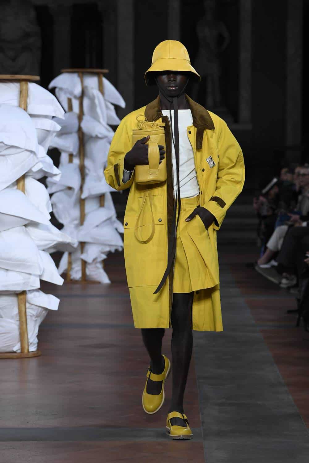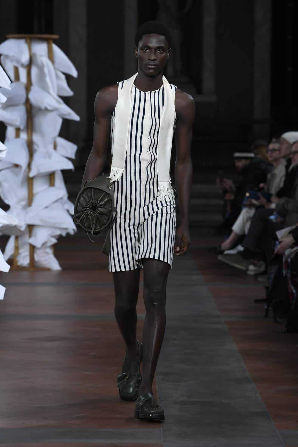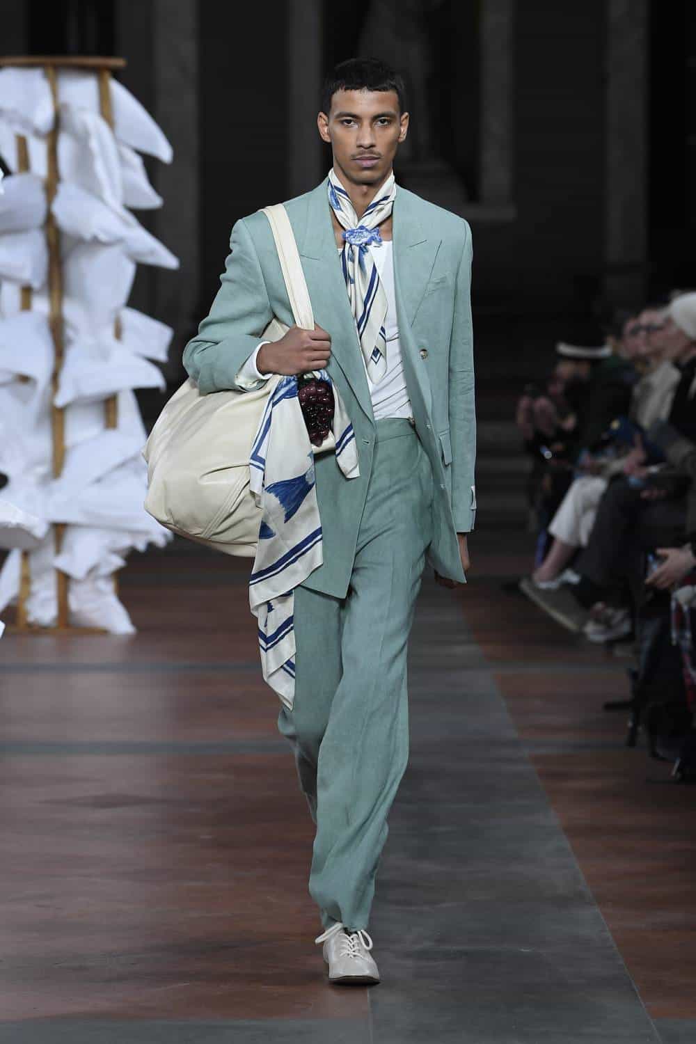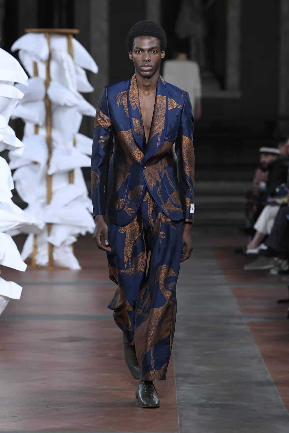 Elsewhere, Daley’s signature billowing trousers were swapped for more slender suits, as the designer revealed backstage he’d begun working with more factories in Italy to craft his collections. There was also military-inspired woollen coats, night shirts dressed up with paintings of fishes and boyish knits featuring cute, animal motifs – making for a well-rounded wardrobe that’ll delight the designer’s growing, loyal fanbase (Mr Styles included).