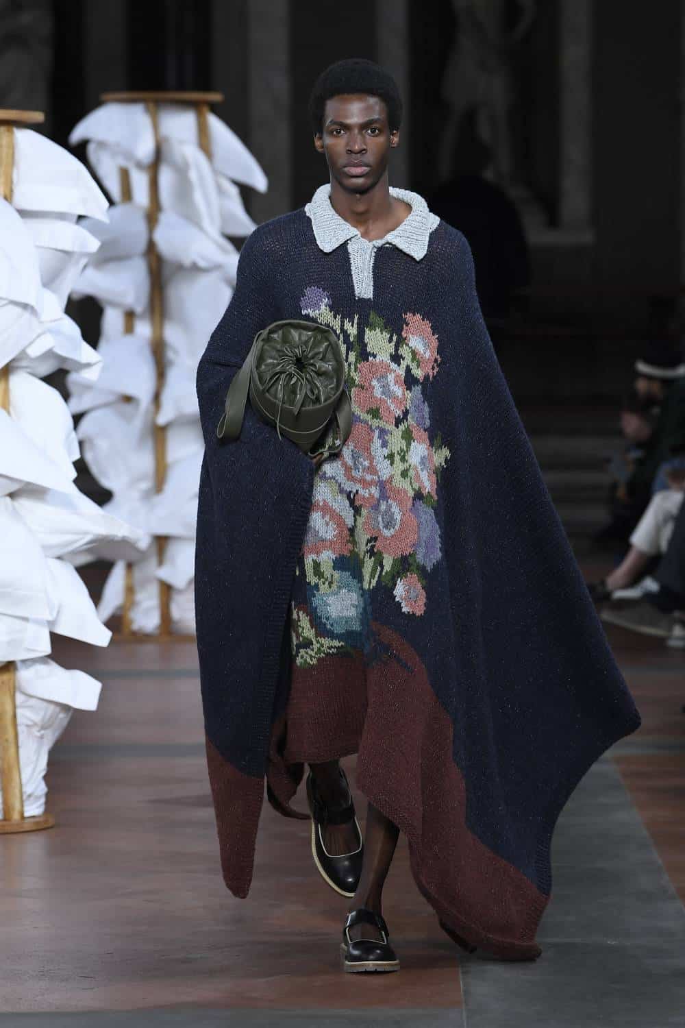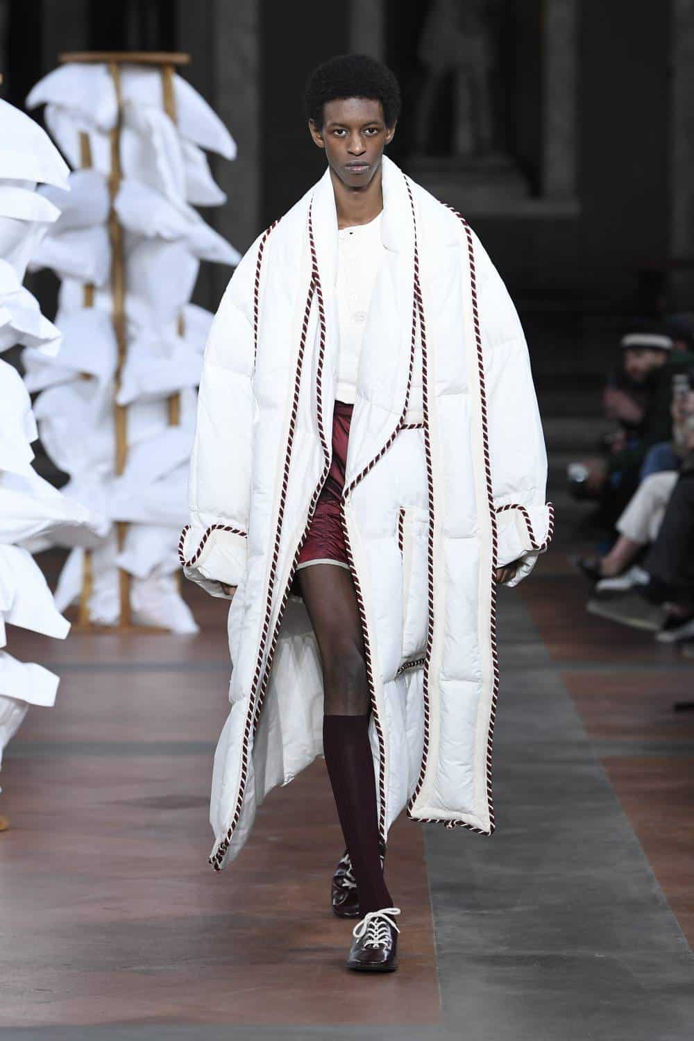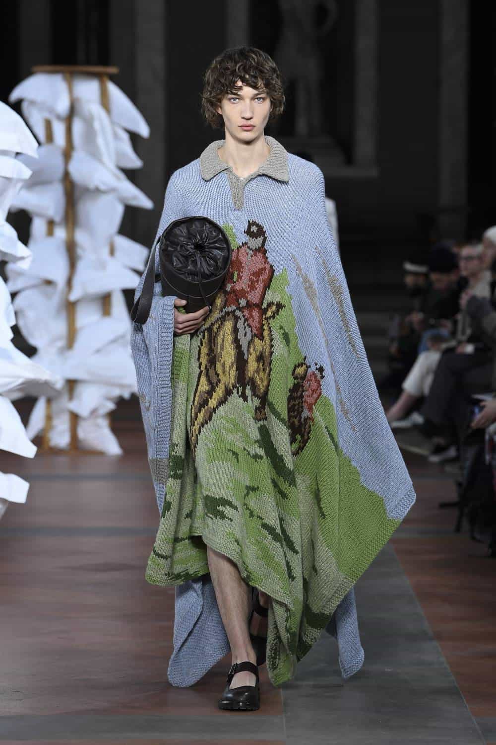 Backdropped by a series of Mannerist masterpieces, Daley set about juxtaposing British formality with an air of queer intimacy. Before designing the collection, he’d discovered a series of journal entities from an Oxford student in 1935 as he was falling in love with guy in another dorm. As such, many models came in a state of undress: tailcoats and shirts were worn trouser-less, burgundy sport shorts were paired with cosy duvet coats and hand-knitted tapestry ponchos were as if the collection’s protagonists had thrown a blanket around themselves after sneaking out of their lover’s room.