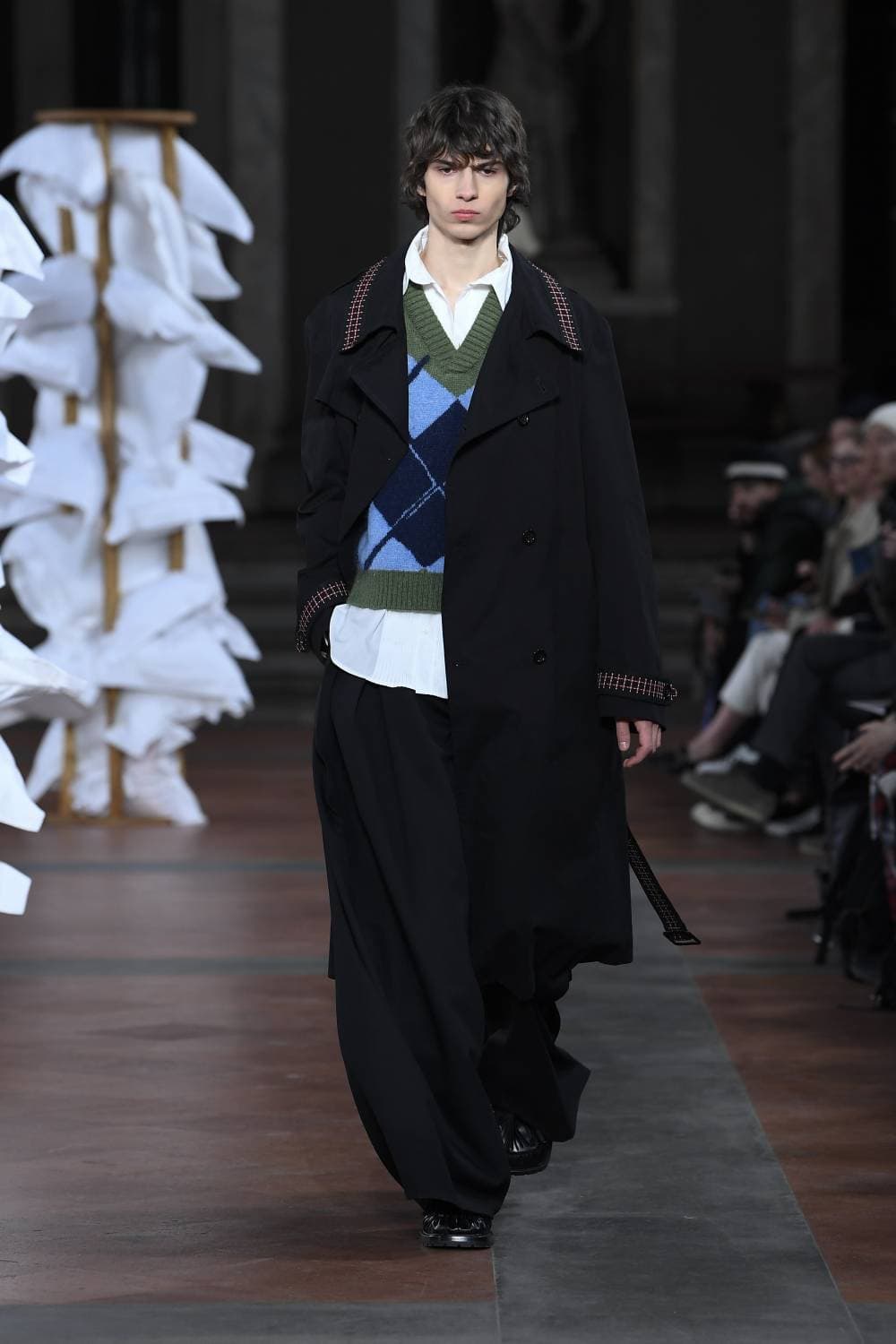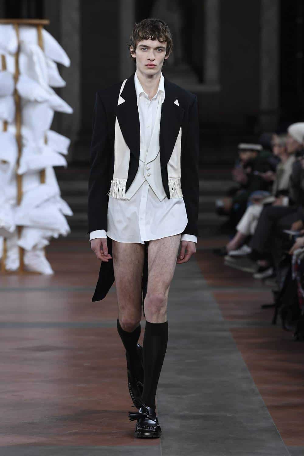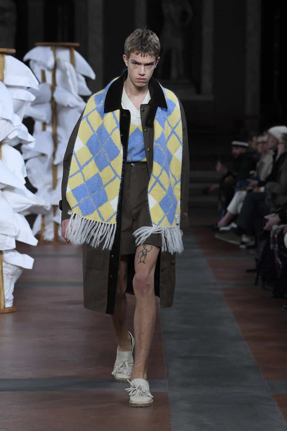 Backdropped by a series of Mannerist masterpieces, Daley set about juxtaposing British formality with an air of queer intimacy. Before designing the collection, he’d discovered a series of journal entities from an Oxford student in 1935 as he was falling in love with guy in another dorm. As such, many models came in a state of undress: tailcoats and shirts were worn trouser-less, burgundy sport shorts were paired with cosy duvet coats and hand-knitted tapestry ponchos were as if the collection’s protagonists had thrown a blanket around themselves after sneaking out of their lover’s room.