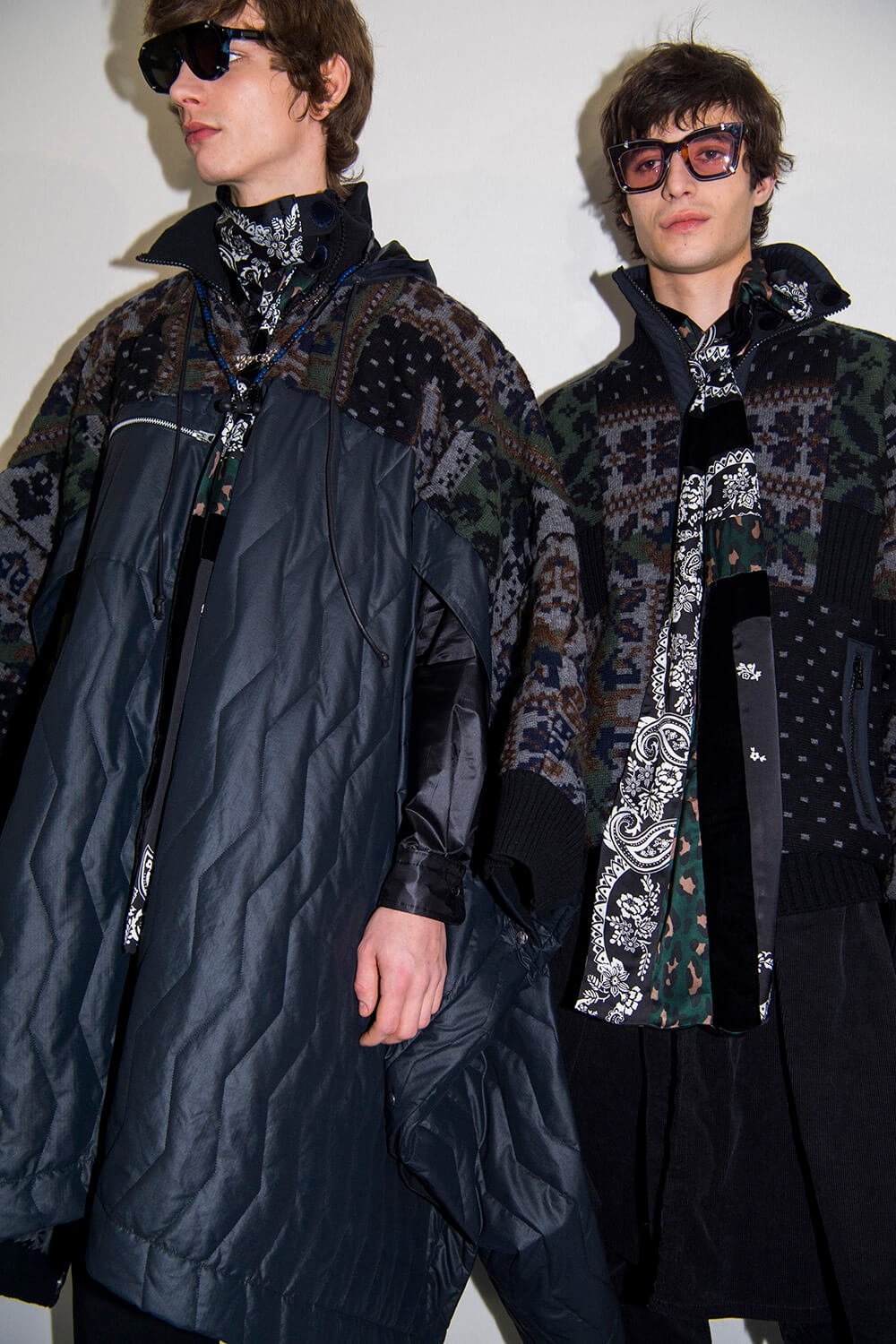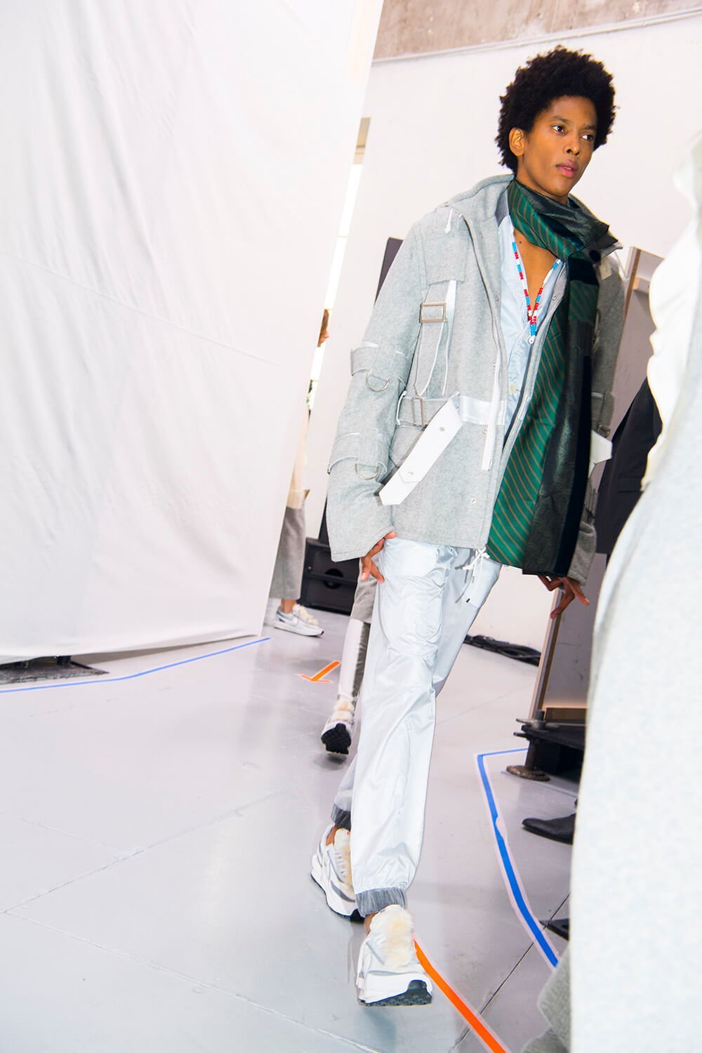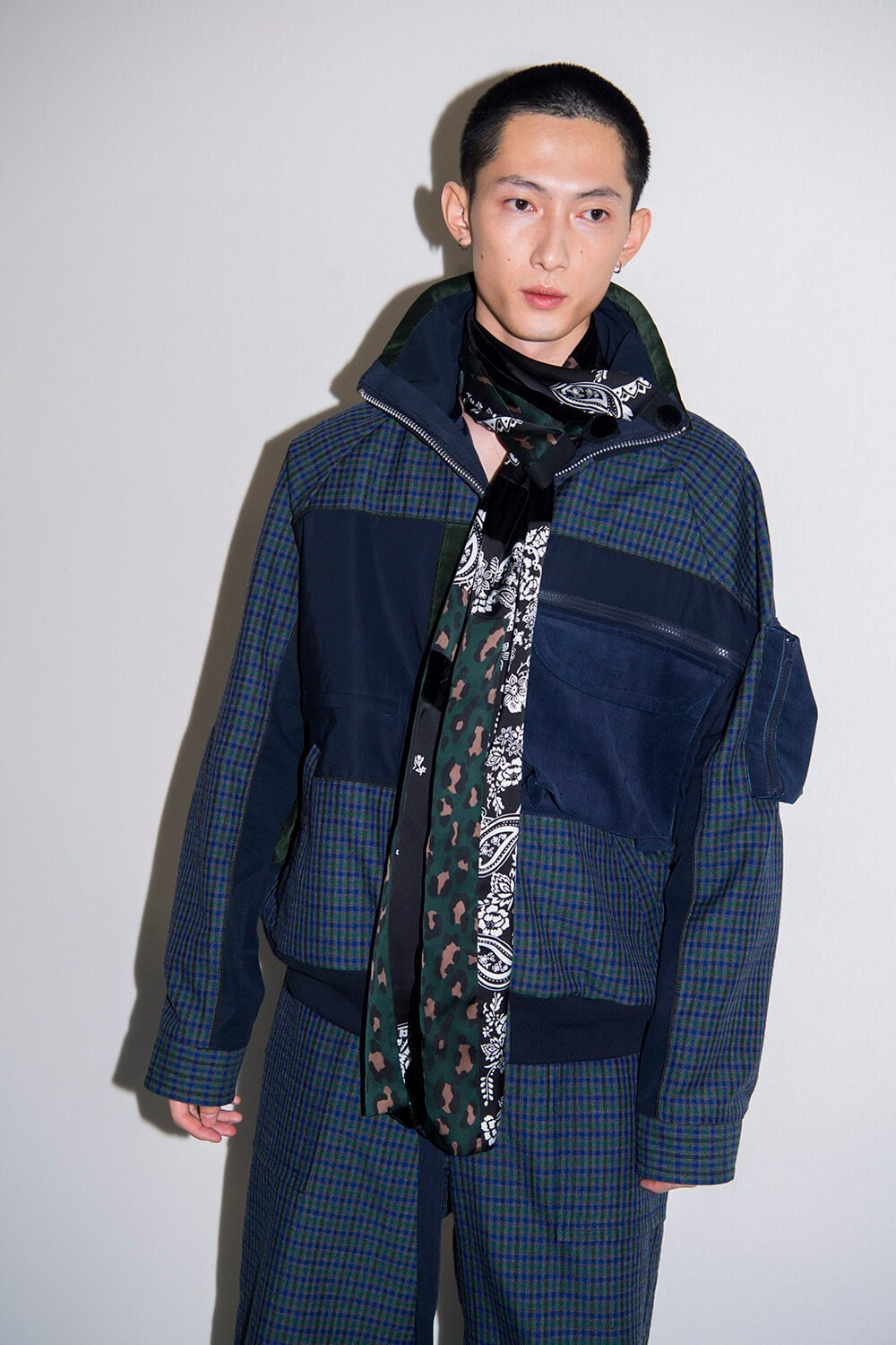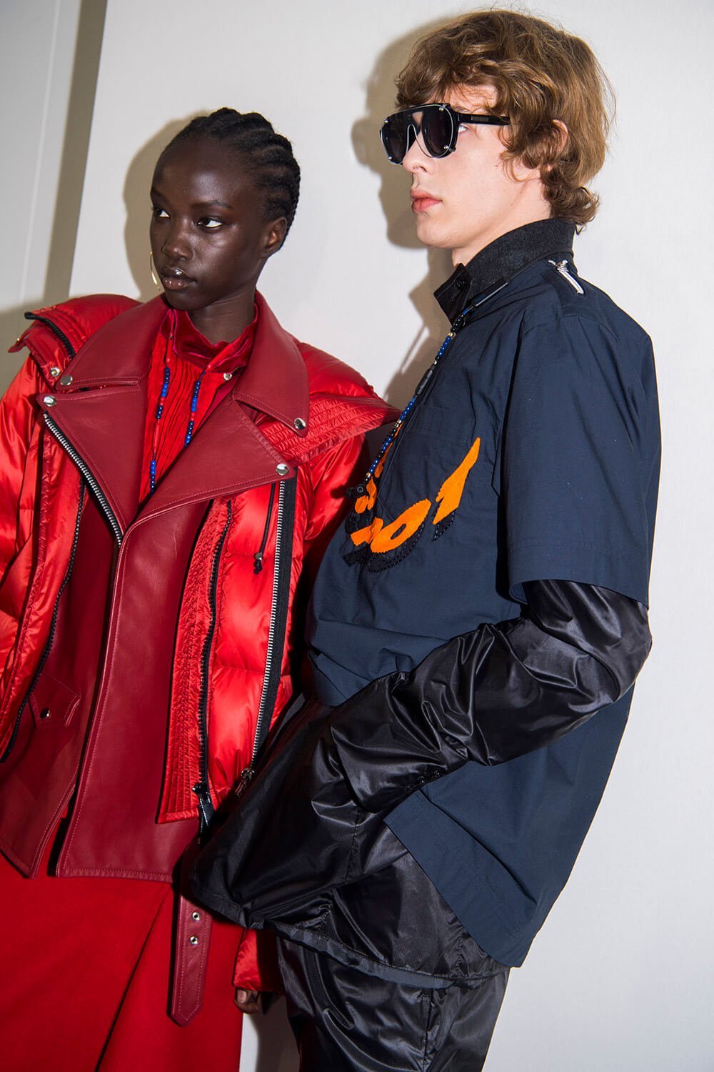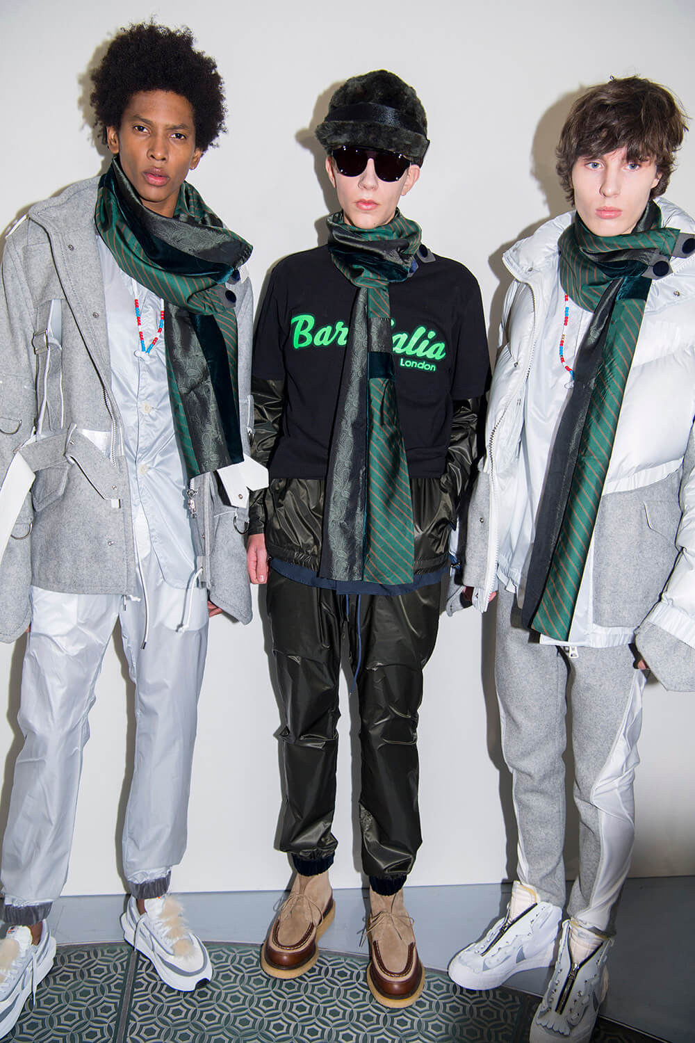 Cut, patch and re-sew; maybe with a zip: it’s the in-house mantra of Sacai designer Chitose Abe. She and her studio, based in Tokyo, use this practice, honing it, developing it and applying it to new garments every season. Of all the Menswear designers showing this week in Paris, Abe’s Sacai – forgive me – has the vibe. Meaning, she plugs into that all-important fashion ether: the how and what and next of men’s fashion. It’s great! Was she hanging around London’s Soho recently? She was certainly in town: the t-shirts with ‘Bar Italia London’ printed on the front. The “sacaification” of streetwear archetypes generates retail gold. The puffa jacket got the treatment just. The shoes and sneakers too: need those. And those ear buds held on some kind of wire support, which models wore round their necks, the wire covered in coloured beads, we’re all going to want those. A new product category right there: jewellery-tech.