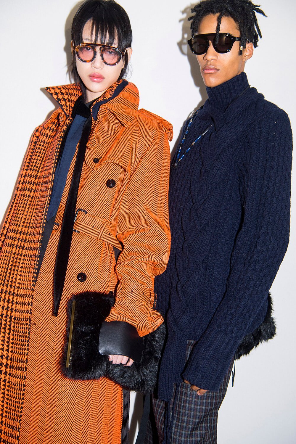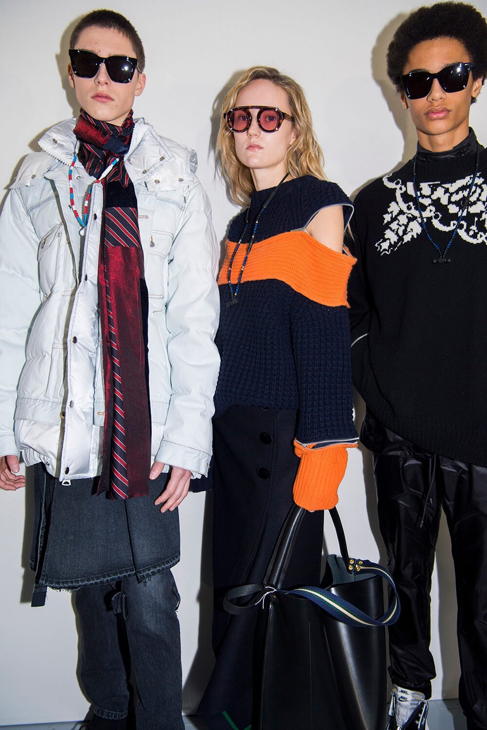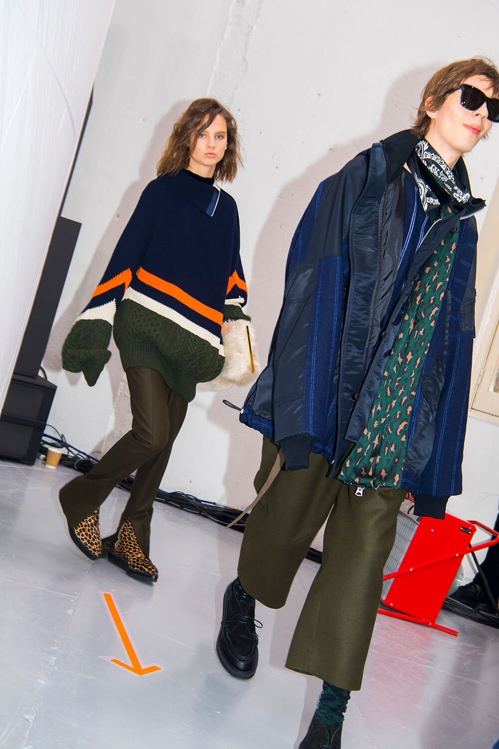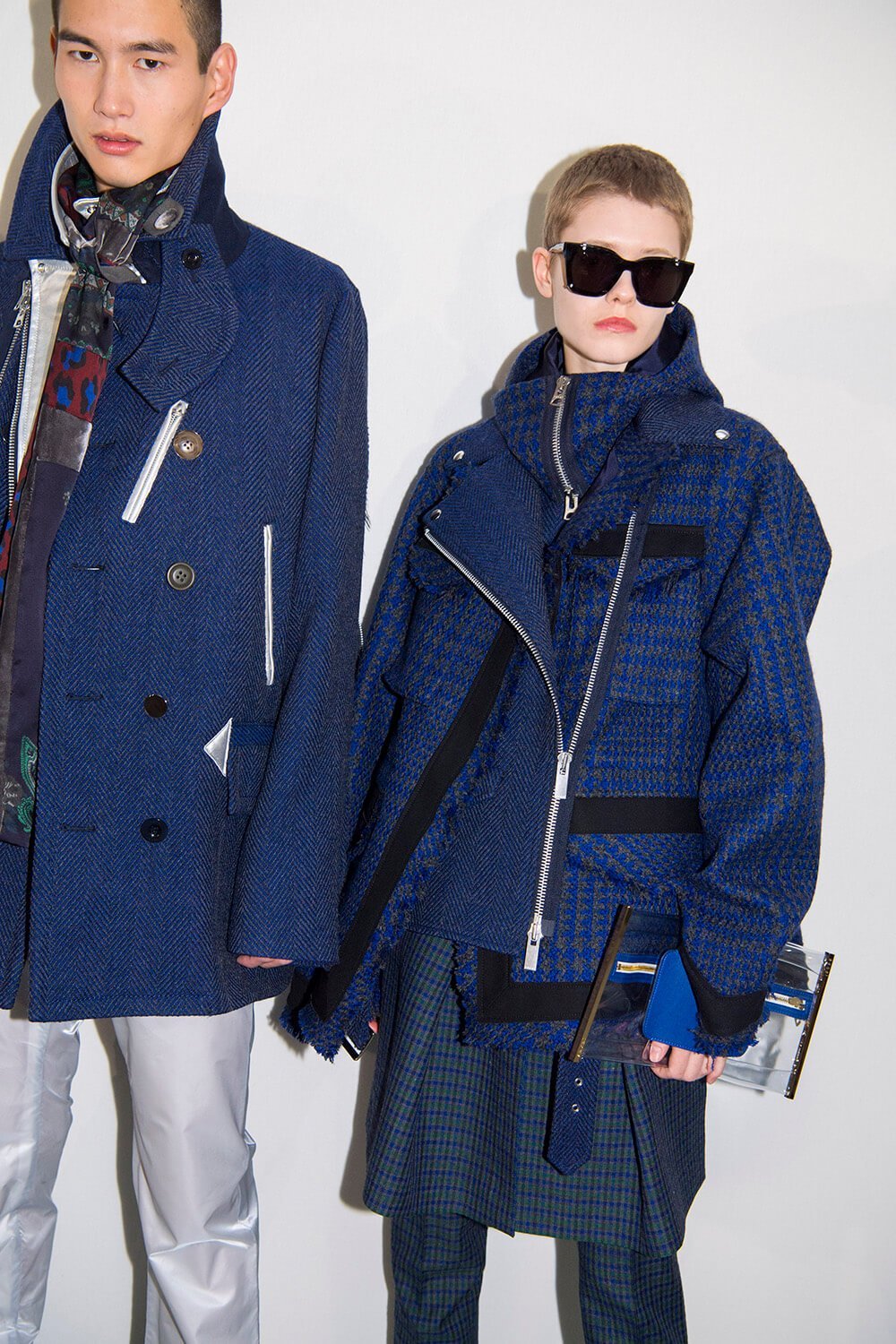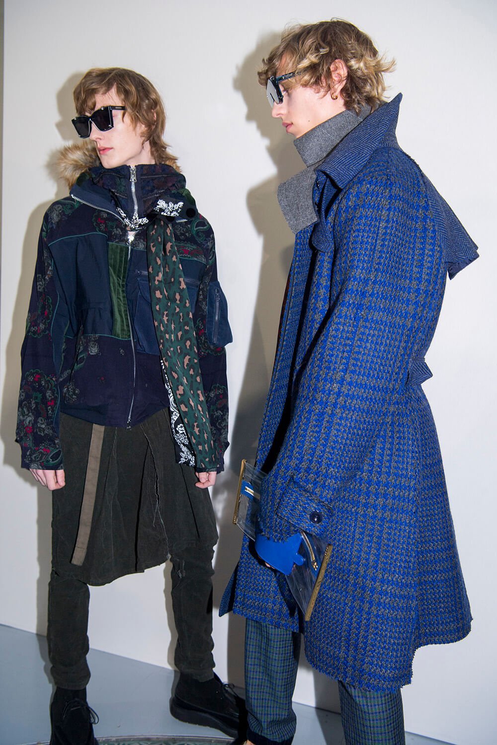 Cut, patch and re-sew; maybe with a zip: it’s the in-house mantra of Sacai designer Chitose Abe. She and her studio, based in Tokyo, use this practice, honing it, developing it and applying it to new garments every season. Of all the Menswear designers showing this week in Paris, Abe’s Sacai – forgive me – has the vibe. Meaning, she plugs into that all-important fashion ether: the how and what and next of men’s fashion. It’s great! Was she hanging around London’s Soho recently? She was certainly in town: the t-shirts with ‘Bar Italia London’ printed on the front. The “sacaification” of streetwear archetypes generates retail gold. The puffa jacket got the treatment just. The shoes and sneakers too: need those. And those ear buds held on some kind of wire support, which models wore round their necks, the wire covered in coloured beads, we’re all going to want those. A new product category right there: jewellery-tech.