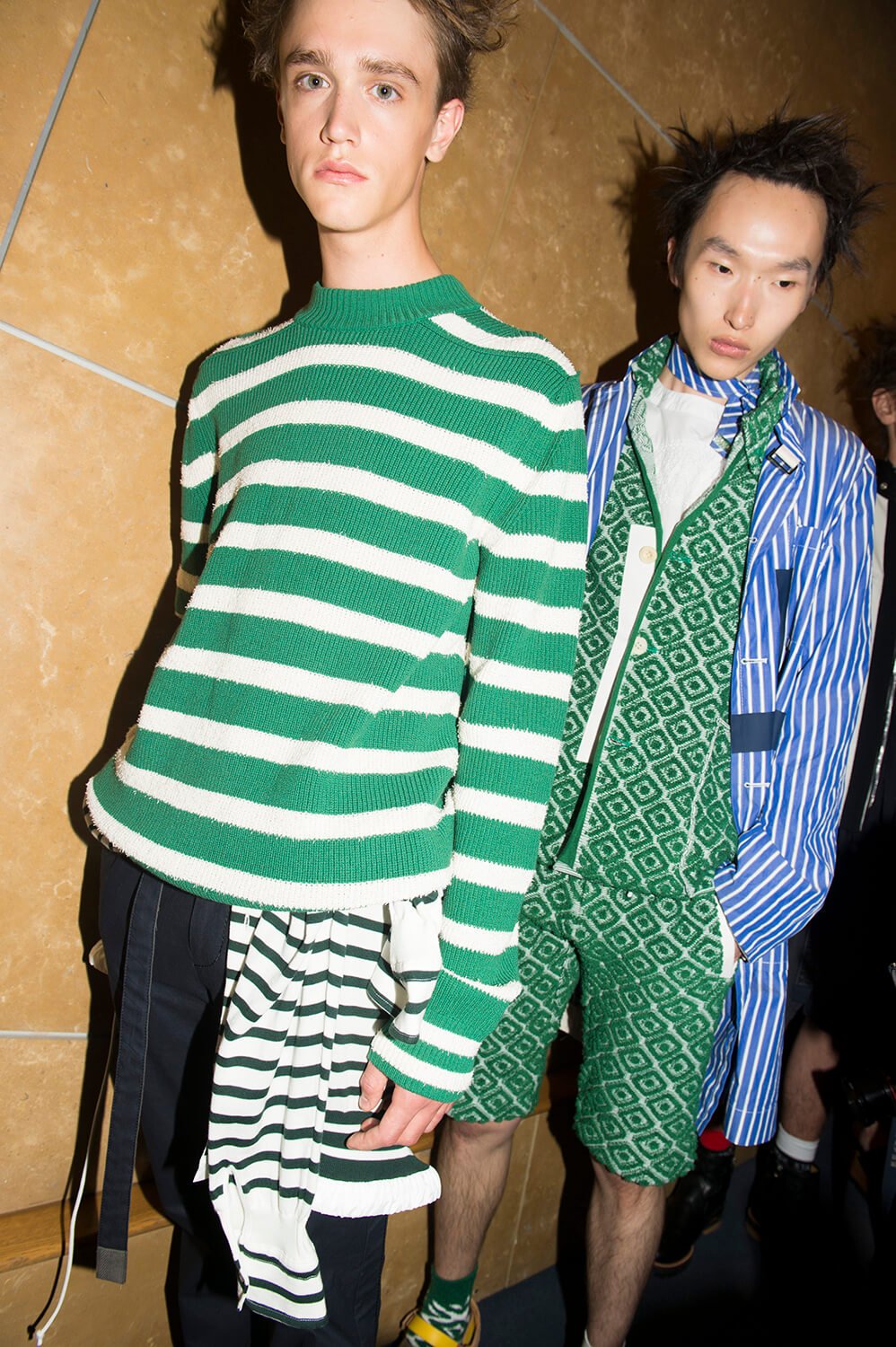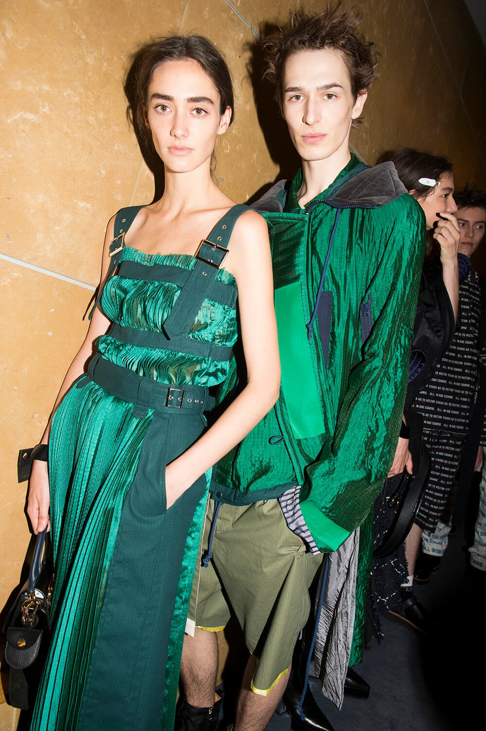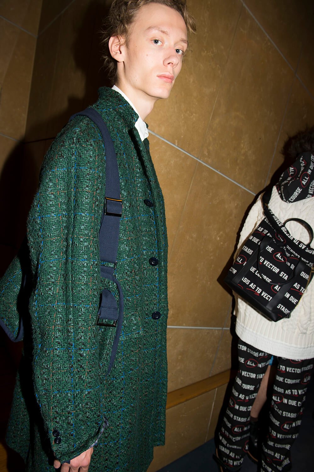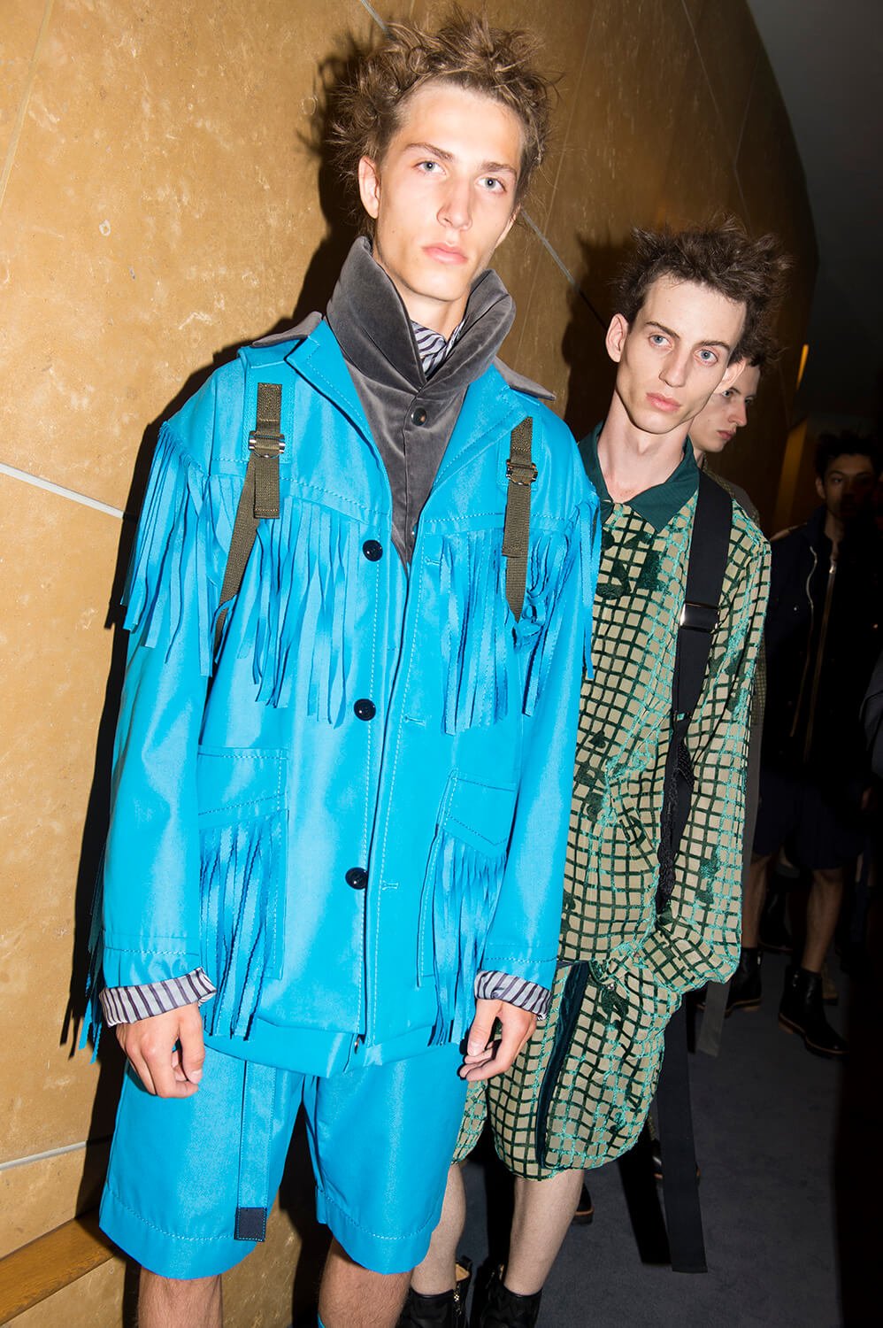 Generous proportions and sportswear shapes abound – roomy t-shirts were emblazoned with the words of Frederik Weiner, worn with matching wide-leg shorts. Anoraks, in brilliant colours, that criss-crossed the body, or perfect boucle polo shirts, worn with backpacks. Something feminine to the women’s offering this season, too (this was also a presentation of the their pre-collection) – girlish pleated gowns were fastened with technical straps, or dresses that fell down off the shoulder and into puffs at the sleeves. Femininity was played with too in the men’s collection with sheer t-shirts, stitched with flowers, or shirting edged with velvet. It sounds a lot, and it was, but together it works. That’s Chitose’s genius. And why we like to see a Sacai show as a walking shopping list. We’re off to have a lie down and contemplate our Spring wardrobe.