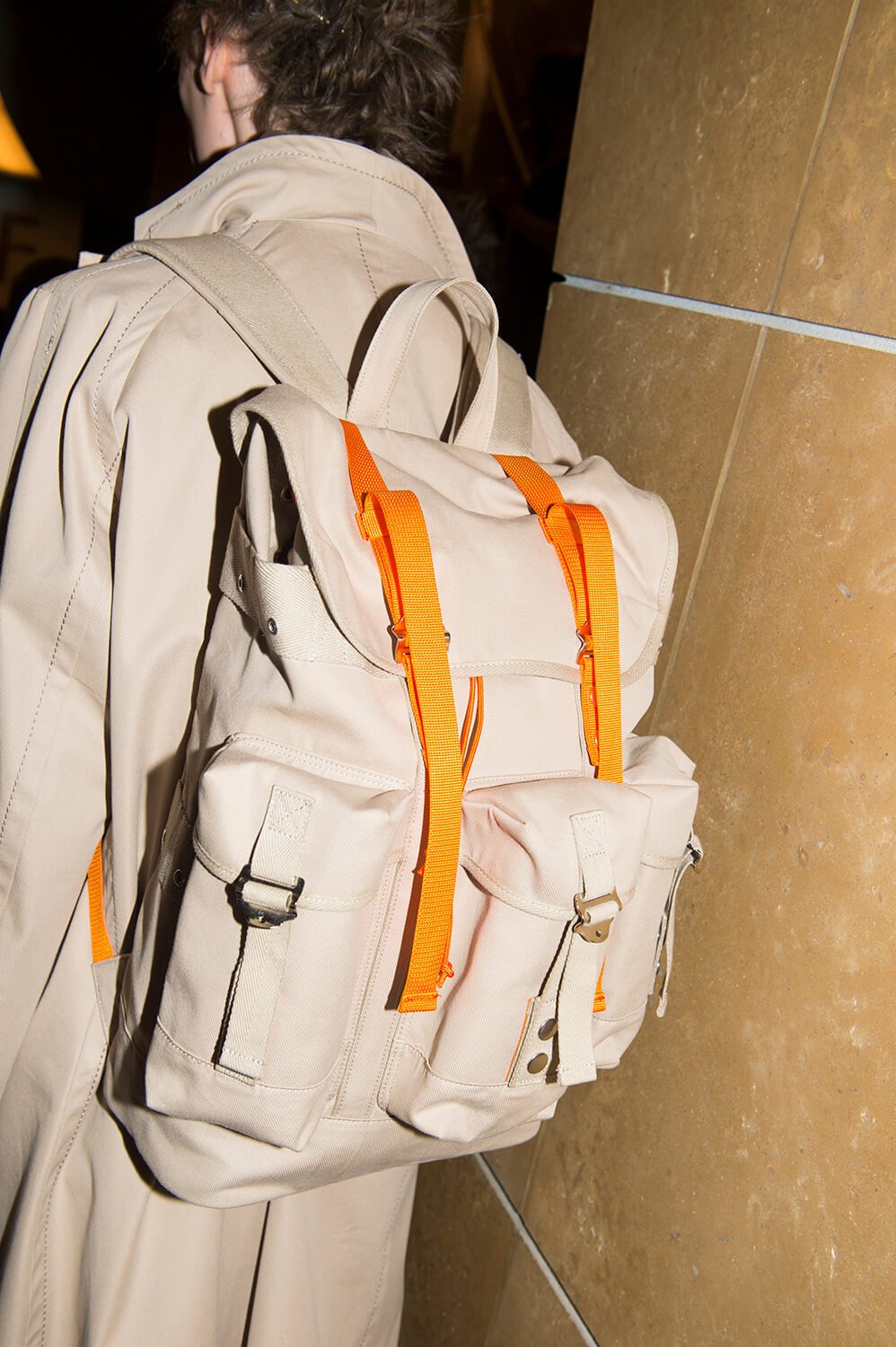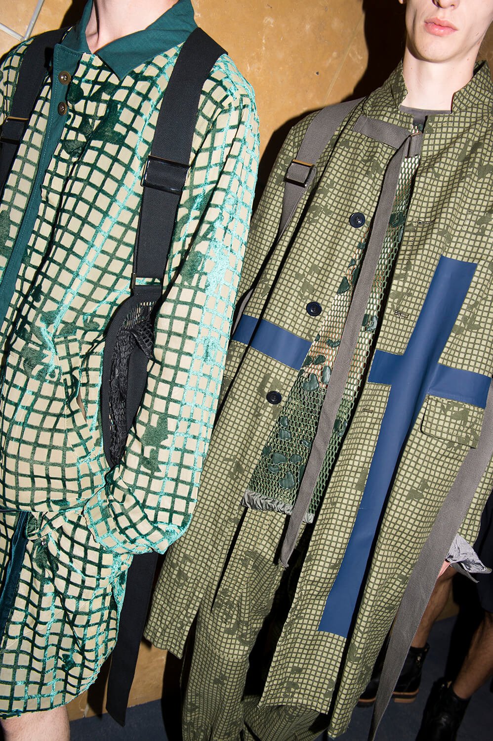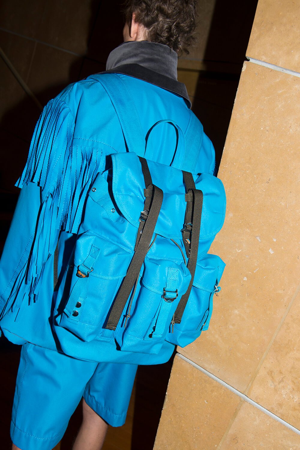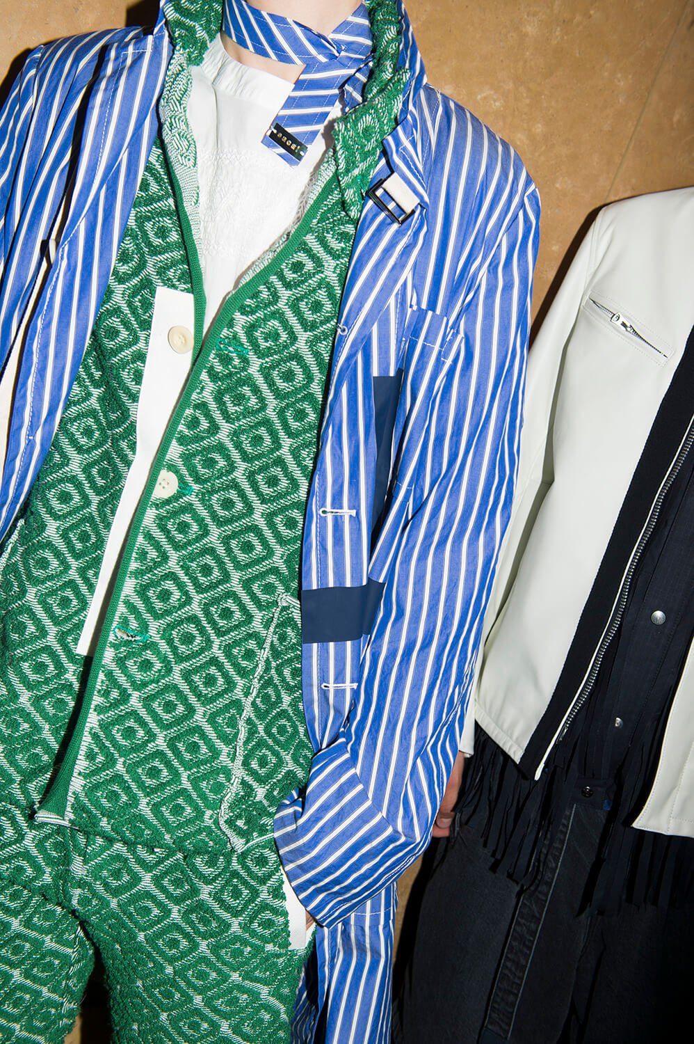Generous proportions and sportswear shapes abound – roomy t-shirts were emblazoned with the words of Frederik Weiner, worn with matching wide-leg shorts. Anoraks, in brilliant colours, that criss-crossed the body, or perfect boucle polo shirts, worn with backpacks. Something feminine to the women’s offering this season, too (this was also a presentation of the their pre-collection) – girlish pleated gowns were fastened with technical straps, or dresses that fell down off the shoulder and into puffs at the sleeves. Femininity was played with too in the men’s collection with sheer t-shirts, stitched with flowers, or shirting edged with velvet. It sounds a lot, and it was, but together it works. That’s Chitose’s genius. And why we like to see a Sacai show as a walking shopping list. We’re off to have a lie down and contemplate our Spring wardrobe.