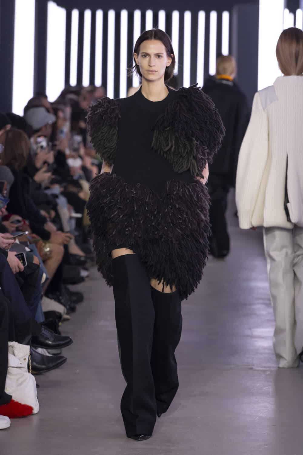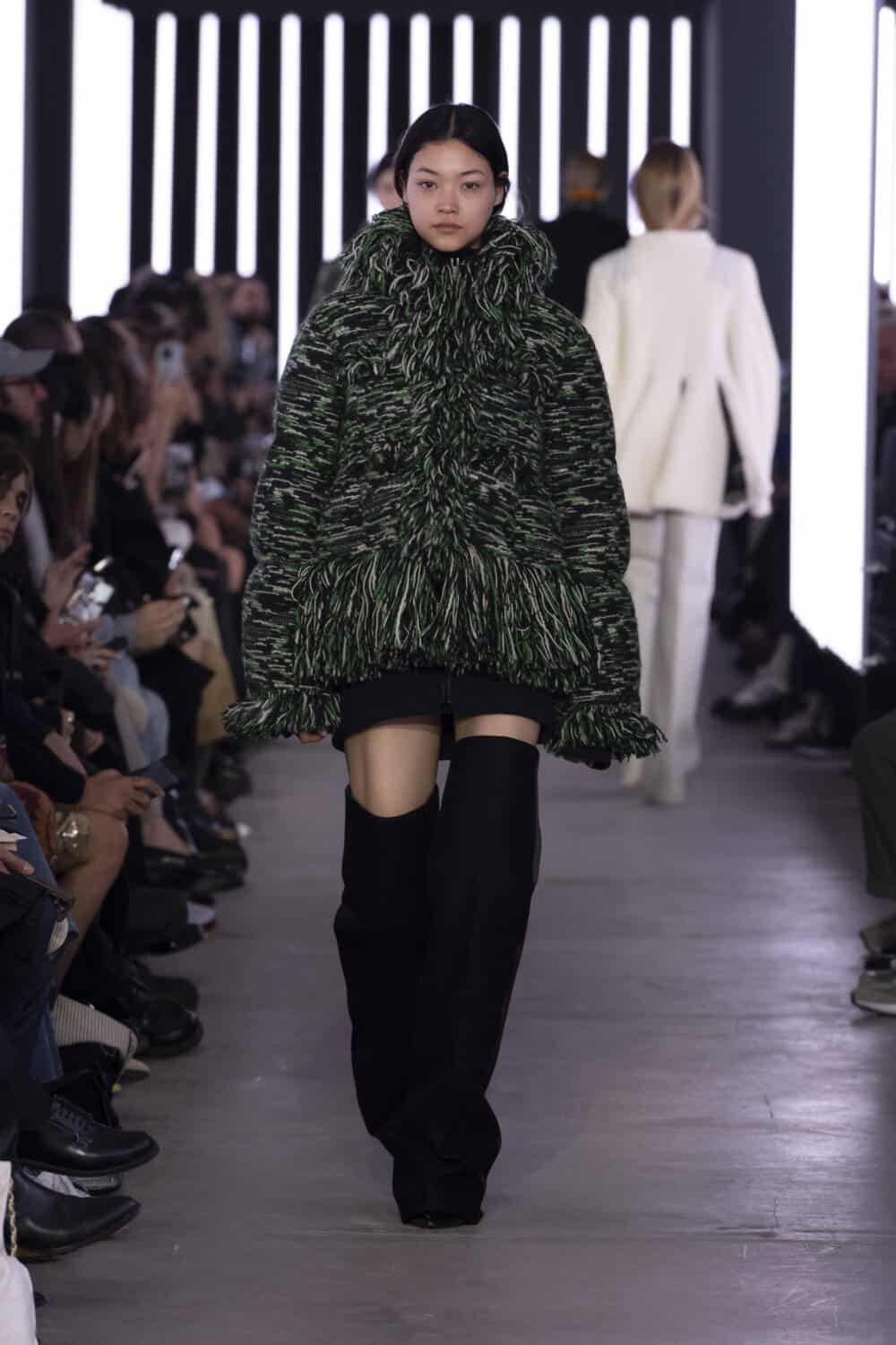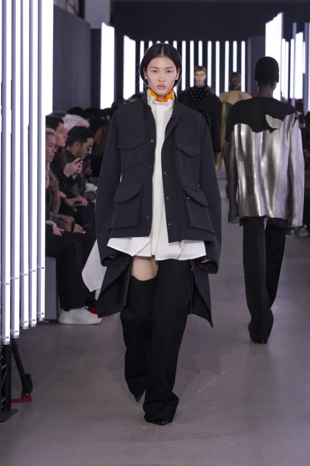 Sending 47 looks down its luminously-lit runway, outerwear was a staple, as it often is. Silhouettes had been chopped, stretched and inflated to create pieces that felt sharp and elevated. Zips and pockets evoked a utilitarian air whilst thick and shaggy knitwear ensured the Sacai customer would be kept warm during the winter months.