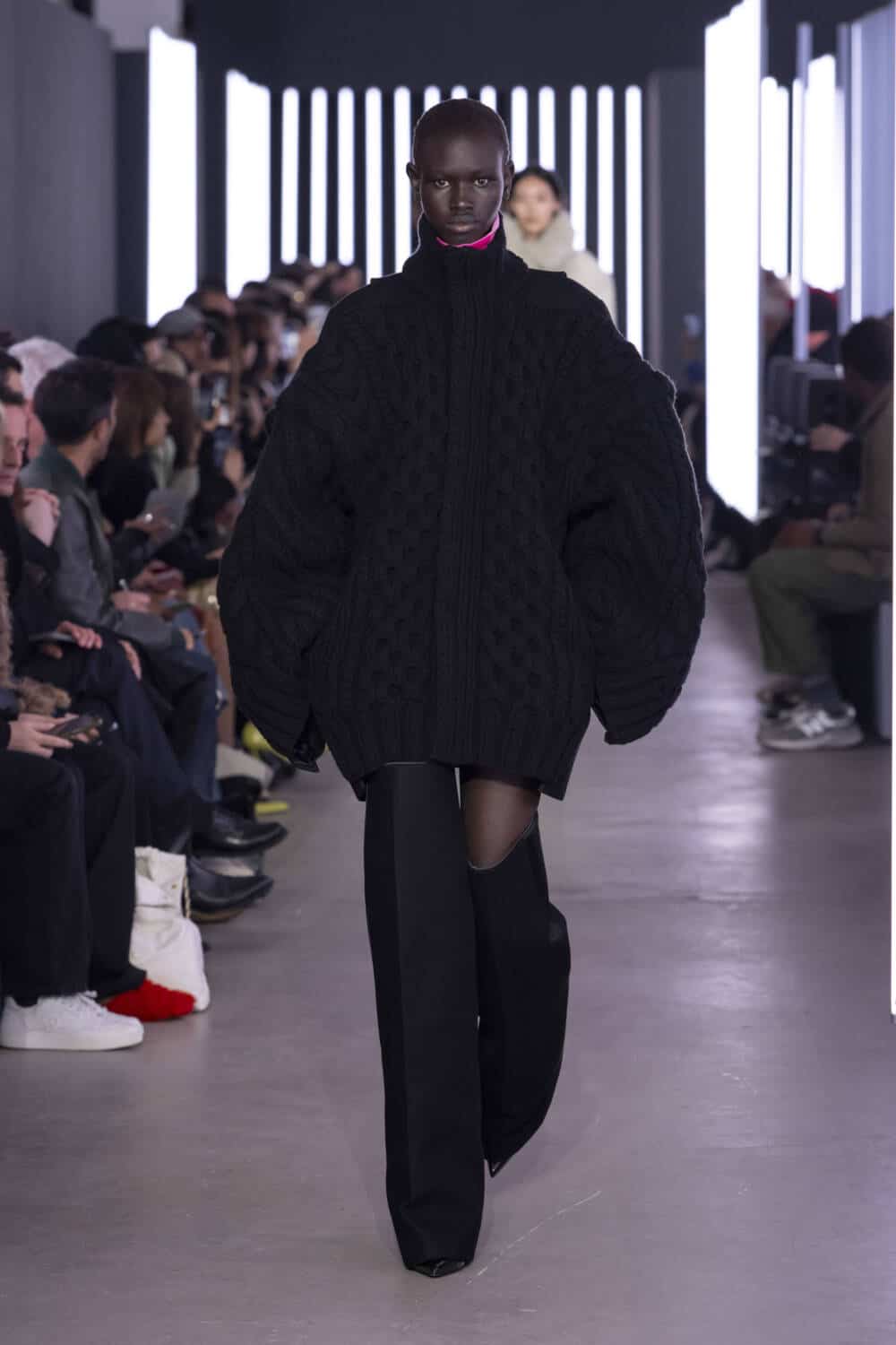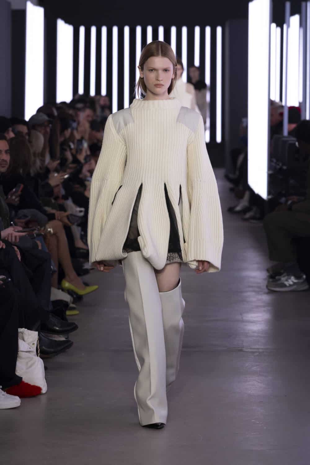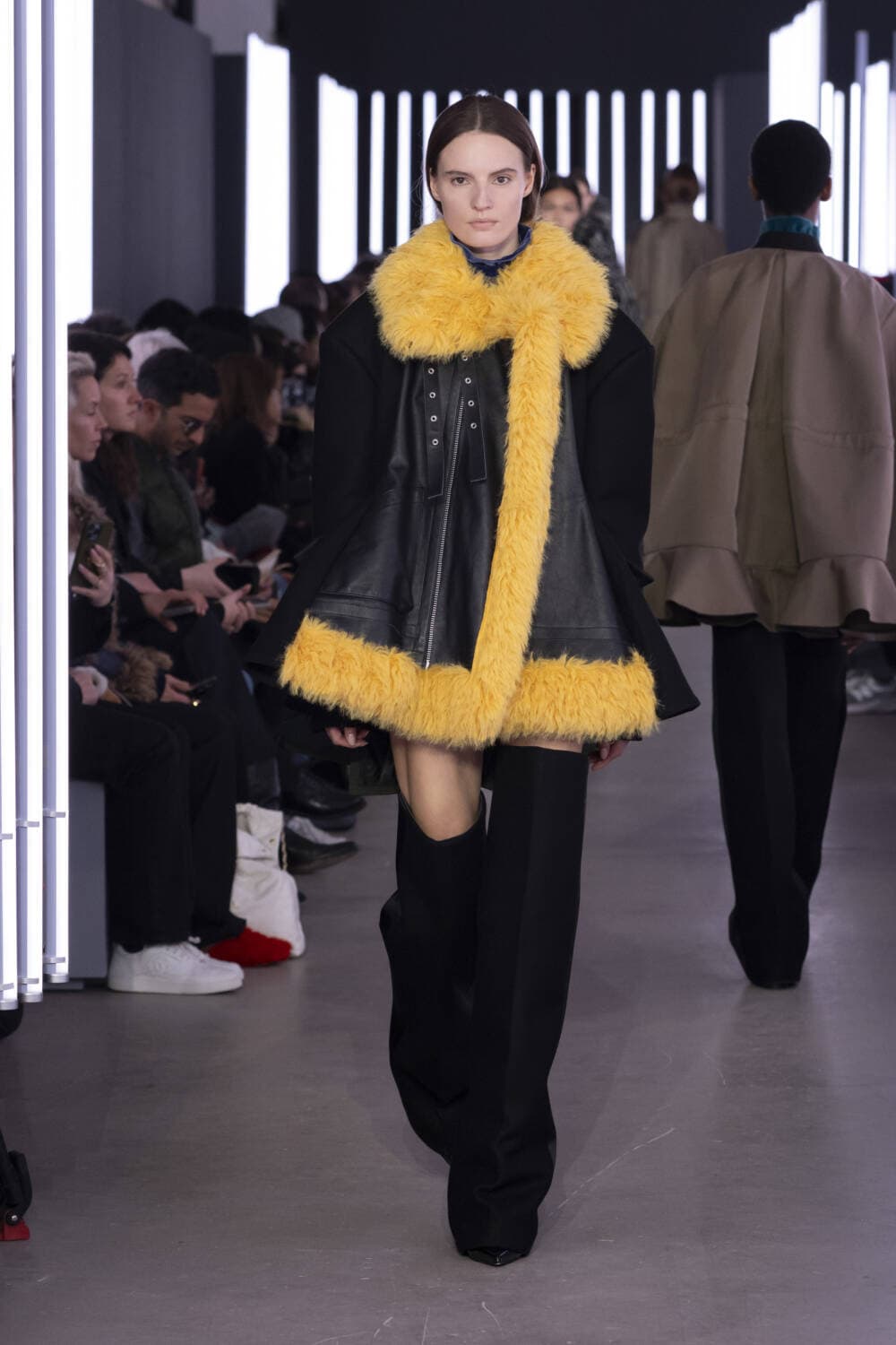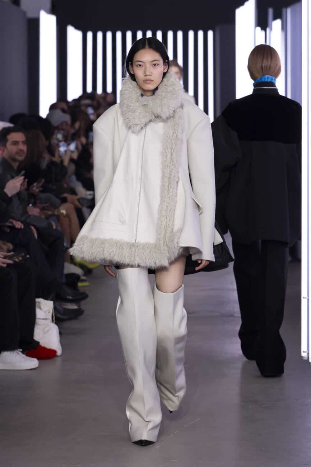Sending 47 looks down its luminously-lit runway, outerwear was a staple, as it often is. Silhouettes had been chopped, stretched and inflated to create pieces that felt sharp and elevated. Zips and pockets evoked a utilitarian air whilst thick and shaggy knitwear ensured the Sacai customer would be kept warm during the winter months.