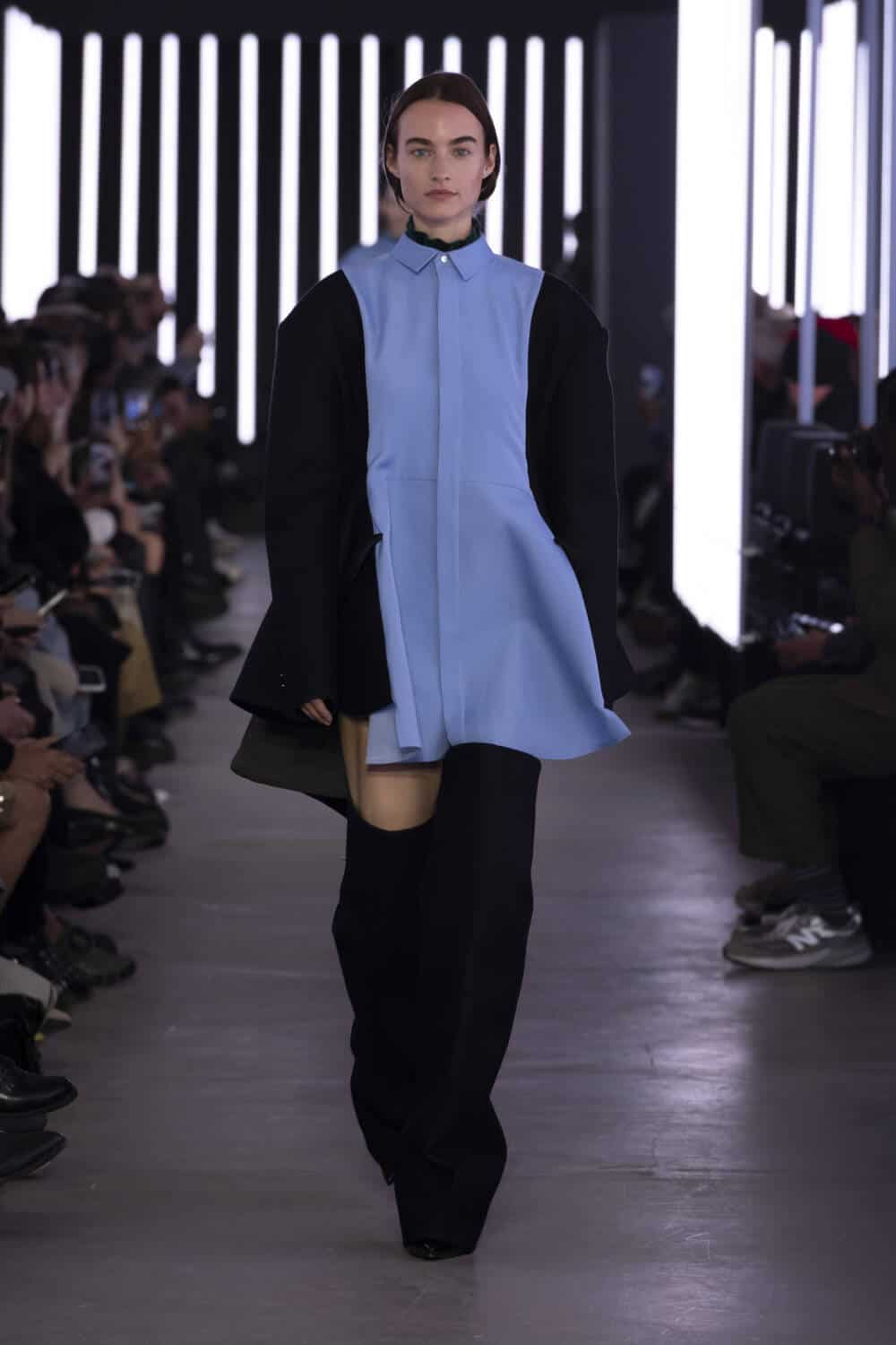 One-piece dressing was a central focus, with shirts, dresses, jackets and coats spliced and stitched together to form singular garments. Artfully layered cuts of fabric cascaded down sides creating a welcome slew of asymmetry. Traditional shapes were melted and moulded to incorporate Sacai’s signature hybridisation, with bomber jackets that slithered into peplums and flight jackets that sported suit jacket sleeves. The palette was predominantly muted, drawing on shades of blue, black, brown and beige interspersed with the occasional pop of colour peeping up above a collar or on a faux-fur trim to keep things playful. Accessories harmoniously elevated each look, with boots that took their form from baggy suit trousers cut mid-way up the thigh and sleek leather clutches finished with glossy metal closures. It was Sacai doing what it does best.