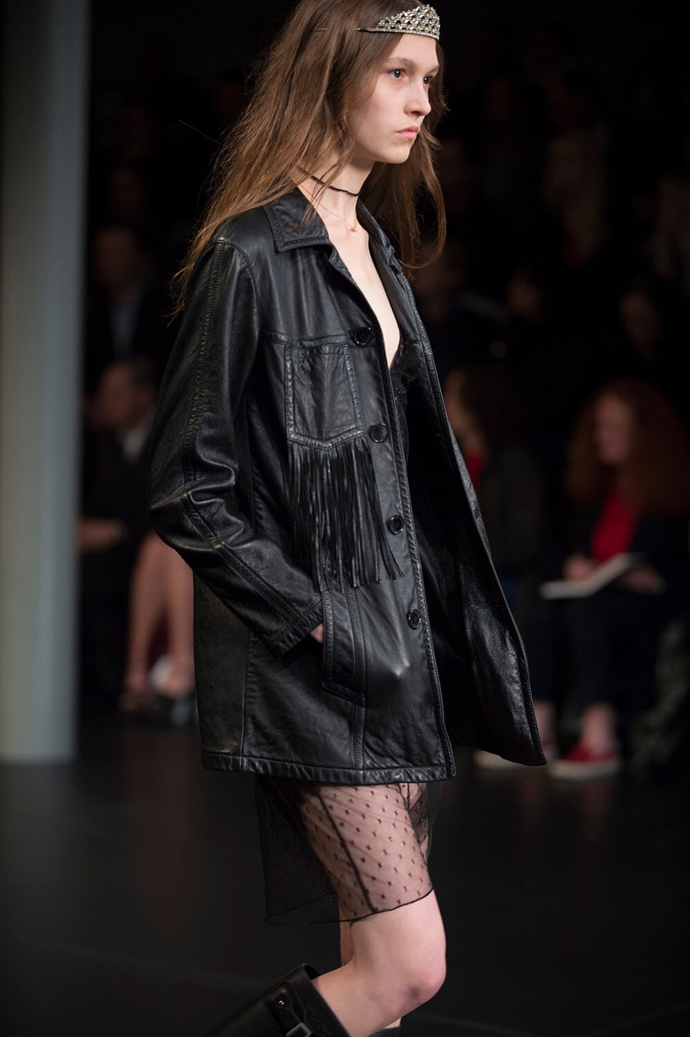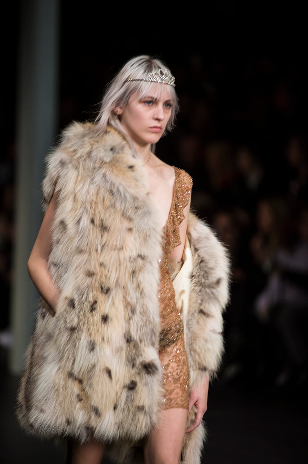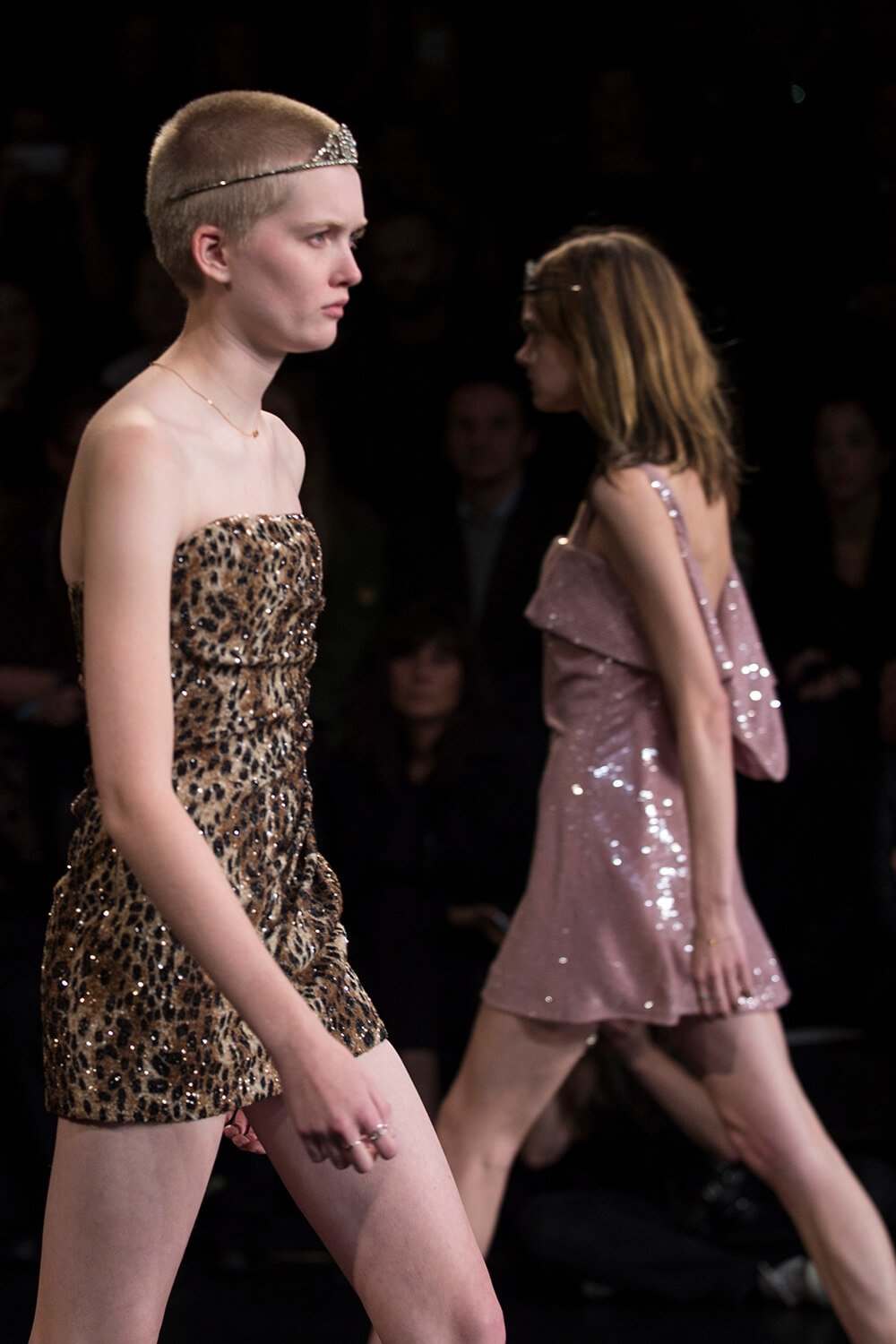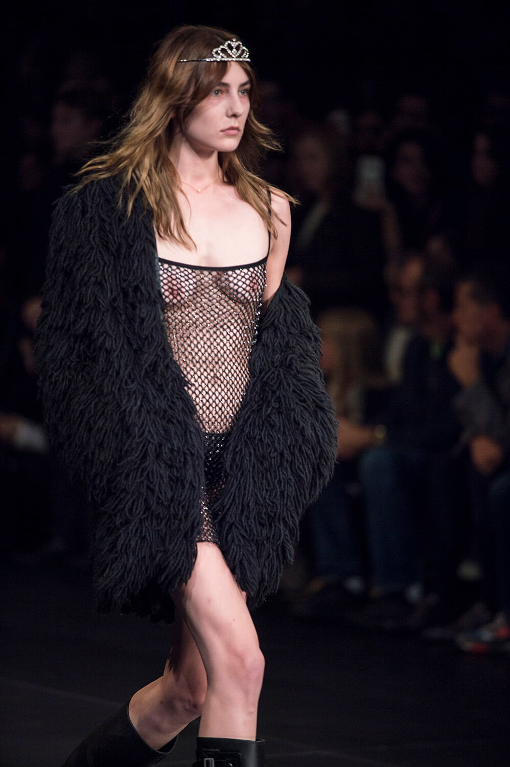 Well, that’s sold it. After watching Saint Laurent’s show last night, it’s decided – we’re stripping off for spring. Forget demure, cover-it-up dressing. This was all about lingerie lingerie lingerie – slip dresses, sheer lace, nipples. Bras and knickers. It was all a bit ravaged beauty queen – the little tiaras, sequin embellishments. Mixed with some Courtney Love grunge – this is Hedi, after all – courtesy of those thrown on parkas and worn-in animal print coats that offered a little cover up. Right, we’re off to buy some knickers and tiara. And maybe a parka too – it is a little cold outside today.