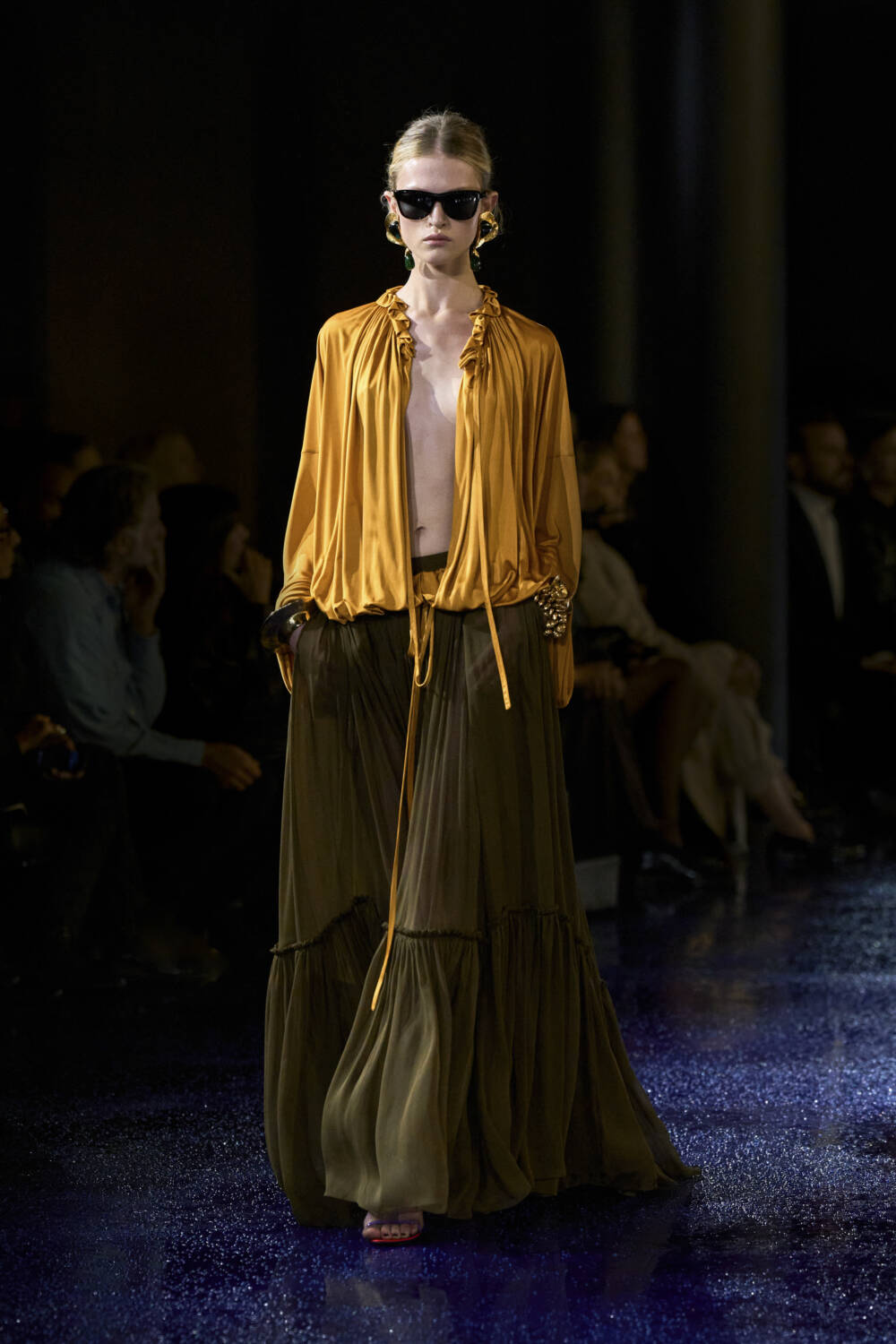 The ghosts of Betty Catroux and Lou Lou de la Falaise stalked Anthony Vaccarello’s Saint Laurent SS25 catwalk. The designer is known for his emphatic messaging and commitment to a look. Last season it was sheer hosiery dressing, this time it was trouser suits – double-breasted, boxy, oversized, masculine and worn Catroux-style with a shirt and tie. The legendary muse watched from the front row approvingly. Interspersed into the androgynous line-up were flounced, flowing, floor-length skirts and dresses glinting with gold-threaded opulence.