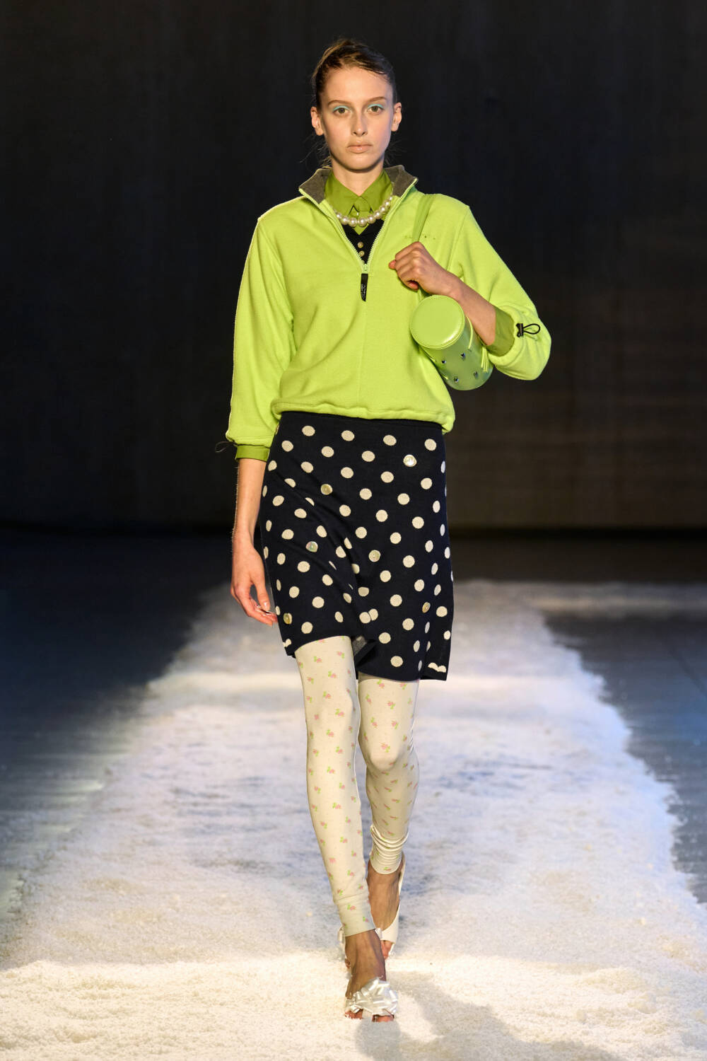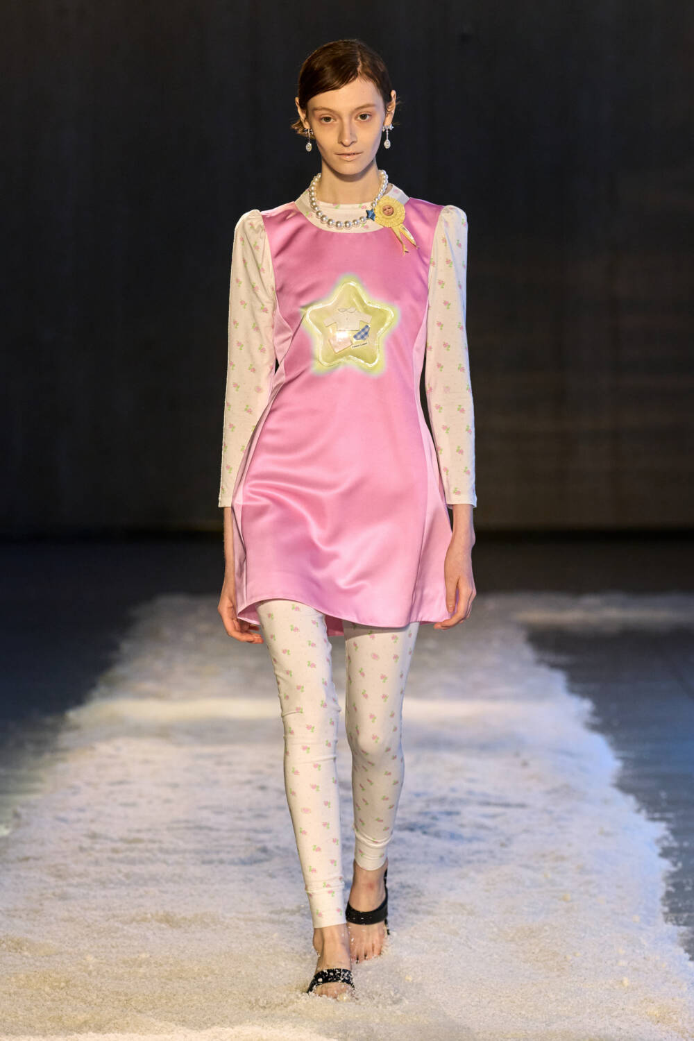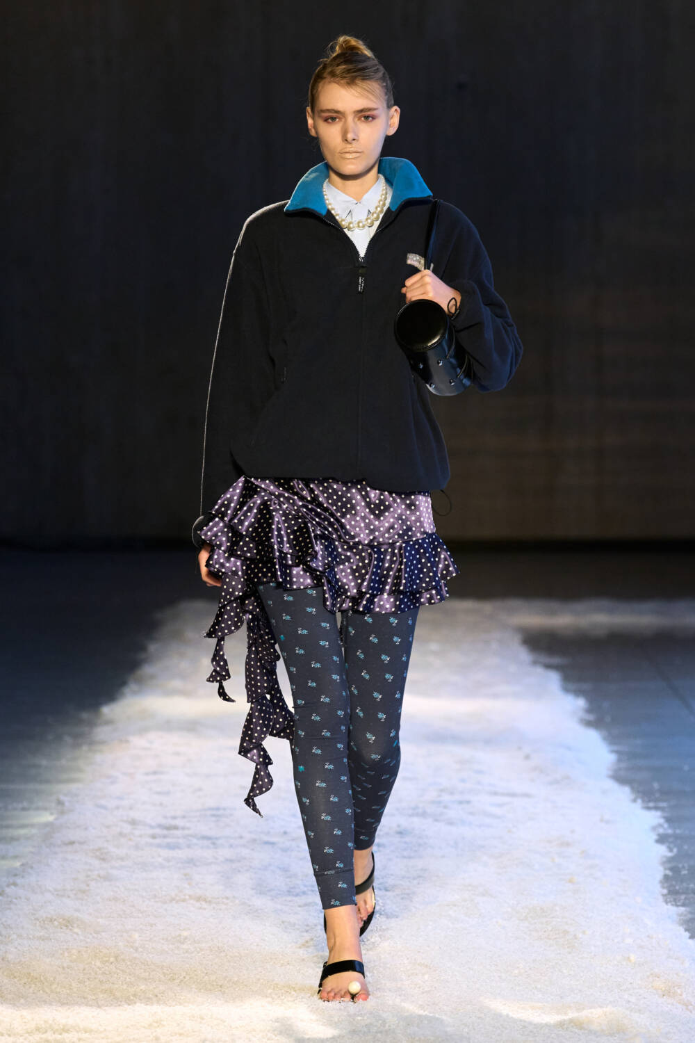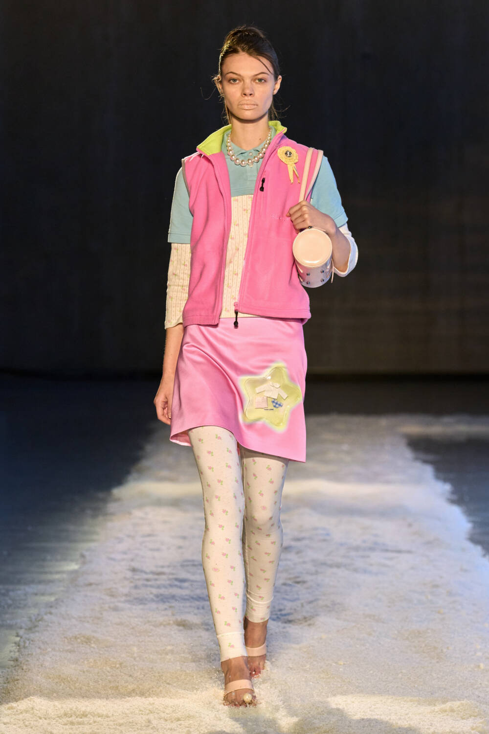 As always Liang mined her younger years as a starting point. From favourite movies like The Snowman and The Parent Trap to trips to ToysRUs to personal objects like a pink planner with a lock, everything calls back to a moment in time. The influences were evident from the opening look: a pink shift worn over a long johns was equal parts child playing dress up and a cool downtown girl styling. A tee tucked under a cardigan riffed on the toy store’s logo while the brand’s signature fleeces were teamed with colourful miniskirts. It was all very playful and personal – not everything is conventionally pretty or sensical but for the Sandy customer, experimentation with fashion is an integral part of her identity.