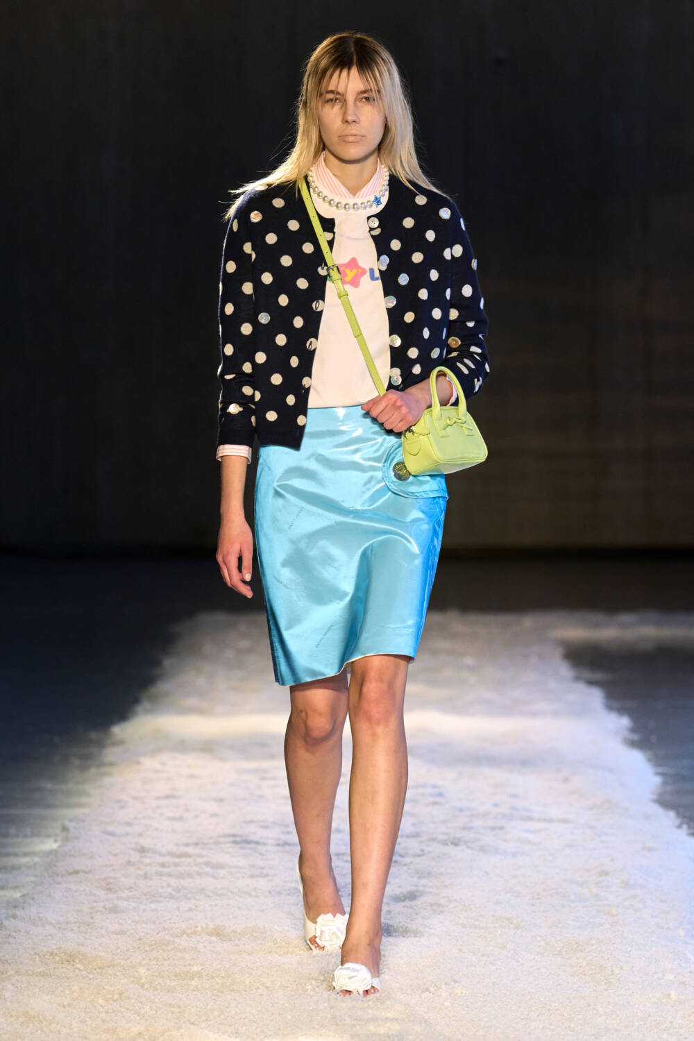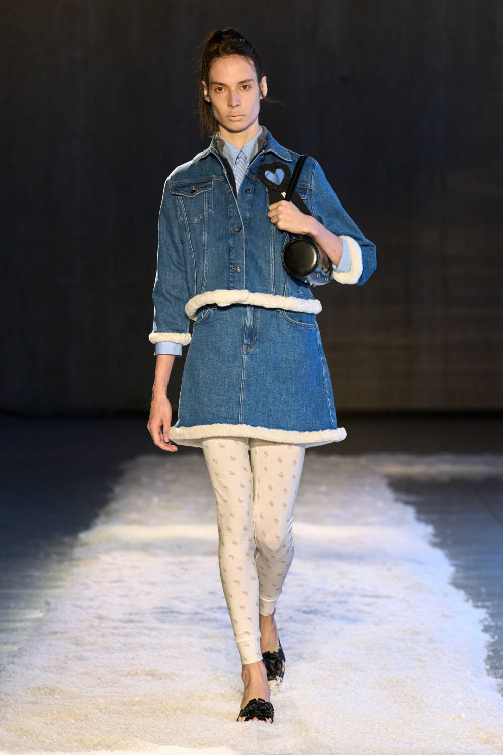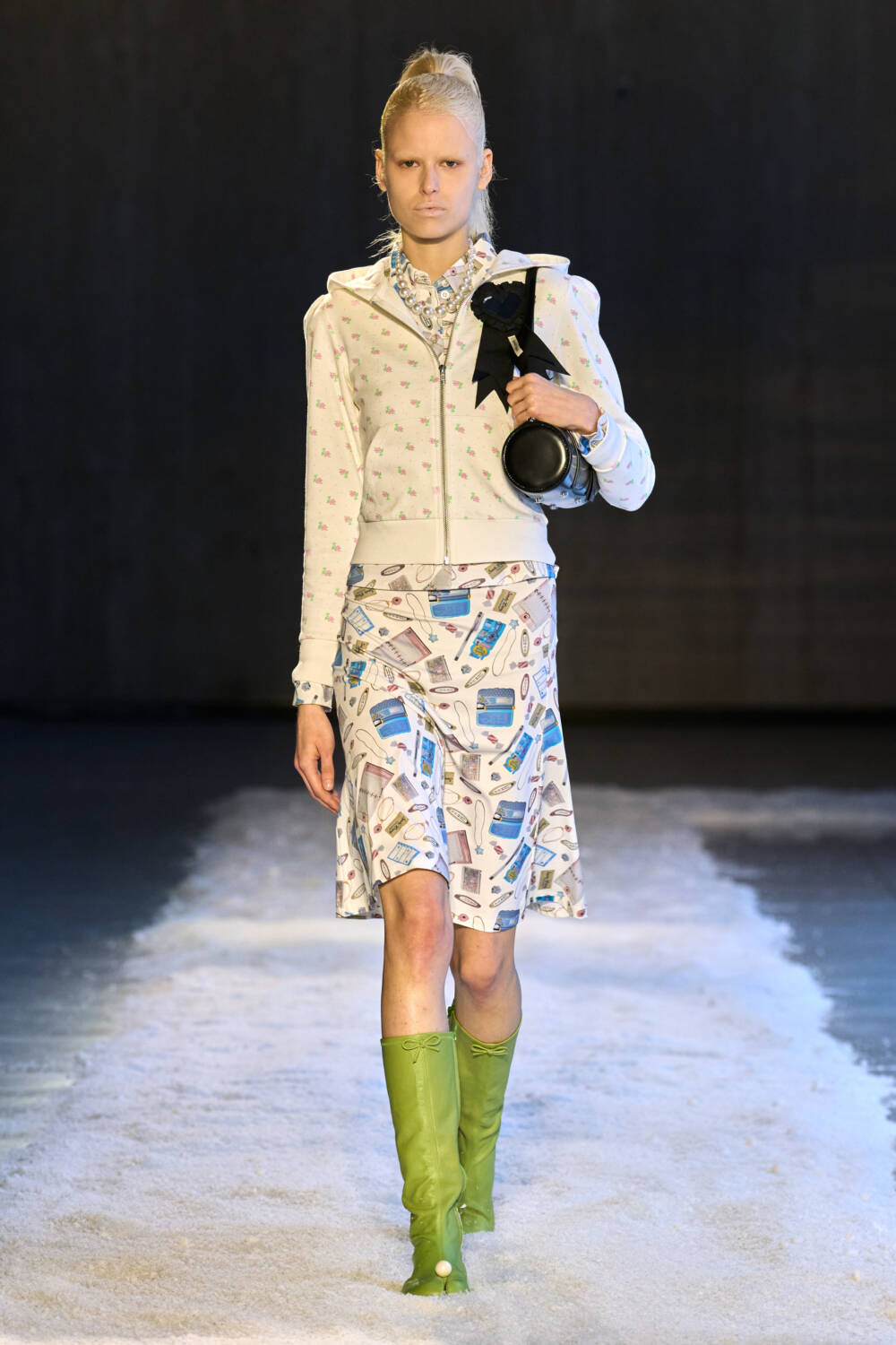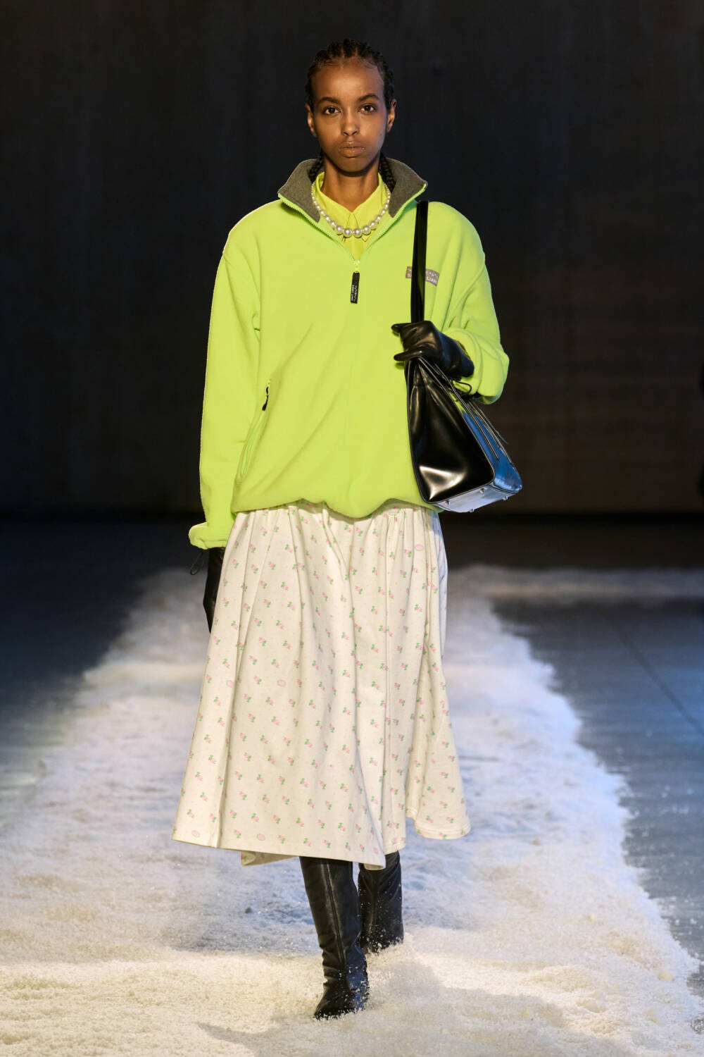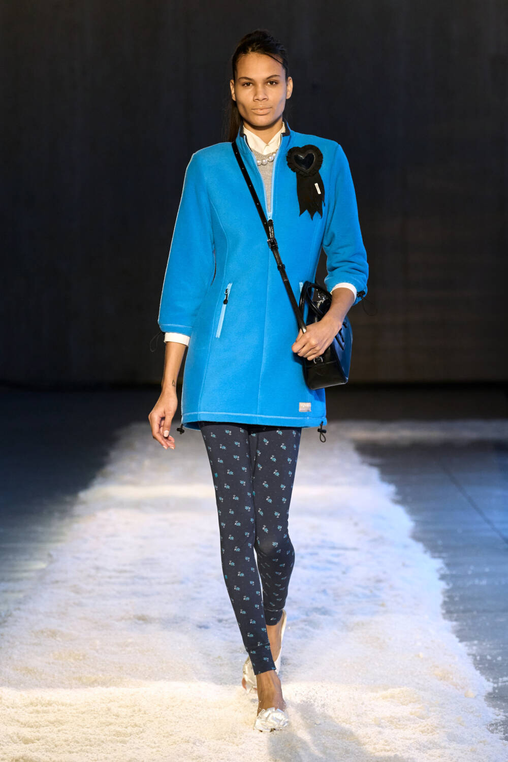 As always Liang mined her younger years as a starting point. From favourite movies like The Snowman and The Parent Trap to trips to ToysRUs to personal objects like a pink planner with a lock, everything calls back to a moment in time. The influences were evident from the opening look: a pink shift worn over a long johns was equal parts child playing dress up and a cool downtown girl styling. A tee tucked under a cardigan riffed on the toy store’s logo while the brand’s signature fleeces were teamed with colourful miniskirts. It was all very playful and personal – not everything is conventionally pretty or sensical but for the Sandy customer, experimentation with fashion is an integral part of her identity.