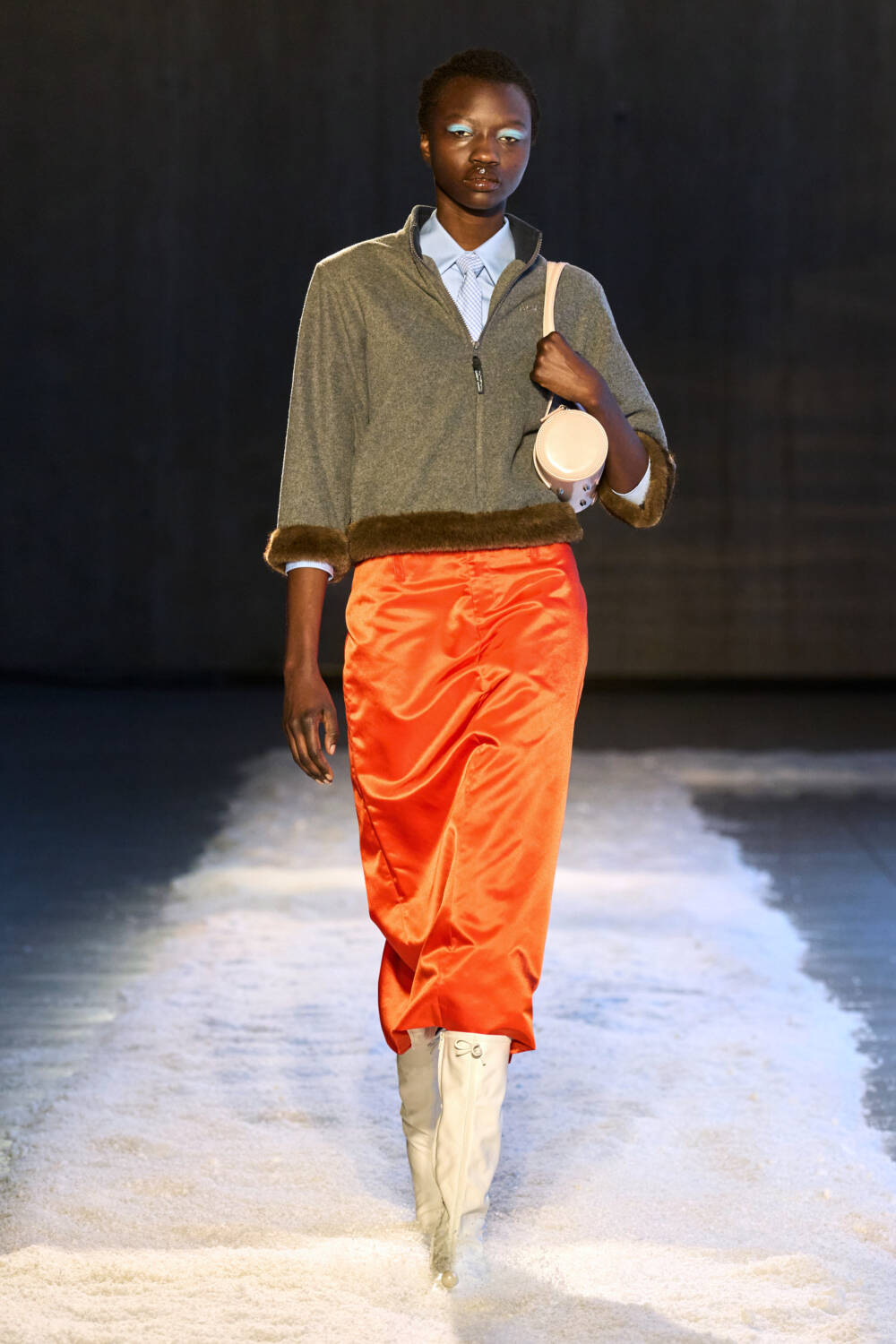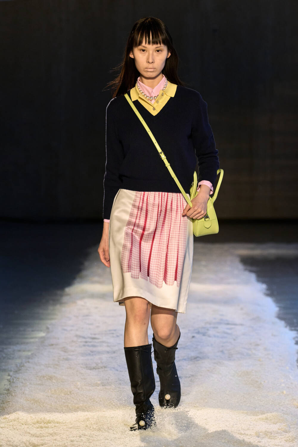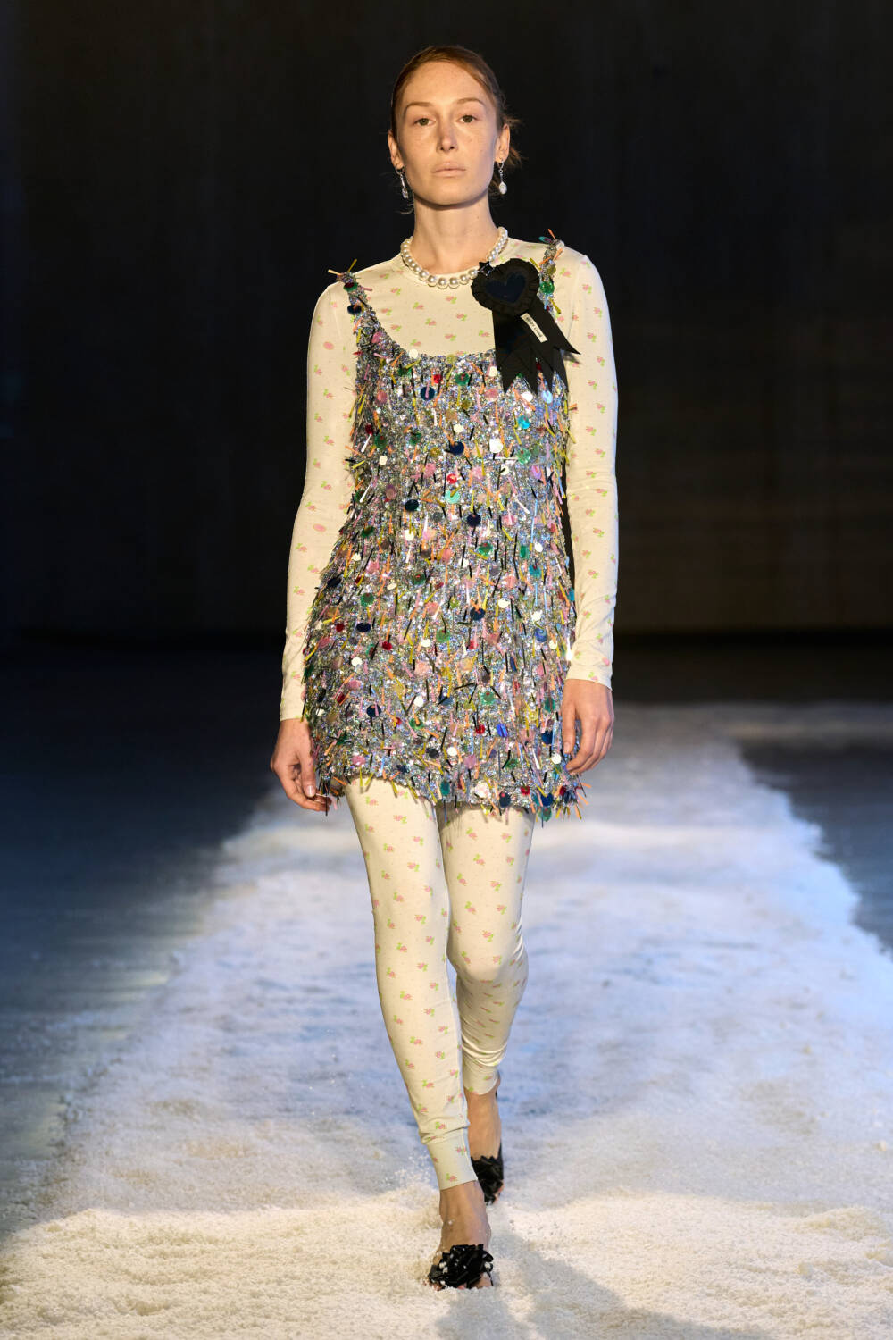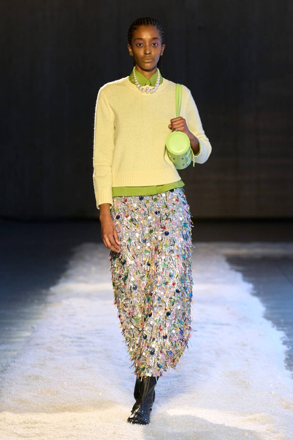 As always Liang mined her younger years as a starting point. From favourite movies like The Snowman and The Parent Trap to trips to ToysRUs to personal objects like a pink planner with a lock, everything calls back to a moment in time. The influences were evident from the opening look: a pink shift worn over a long johns was equal parts child playing dress up and a cool downtown girl styling. A tee tucked under a cardigan riffed on the toy store’s logo while the brand’s signature fleeces were teamed with colourful miniskirts. It was all very playful and personal – not everything is conventionally pretty or sensical but for the Sandy customer, experimentation with fashion is an integral part of her identity.