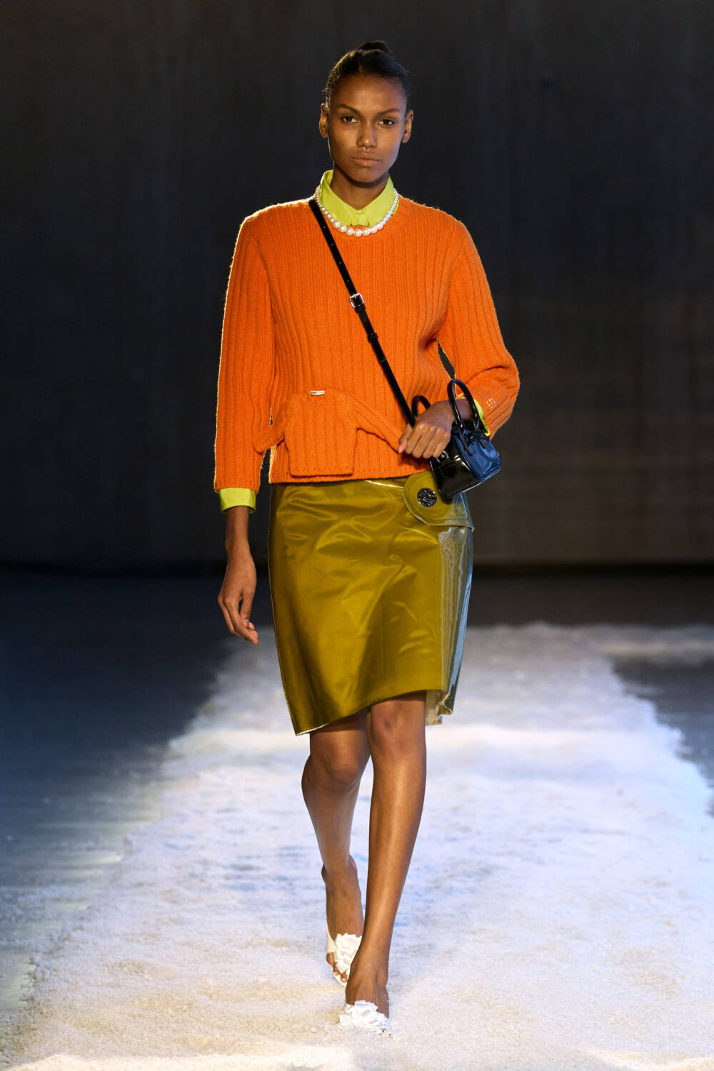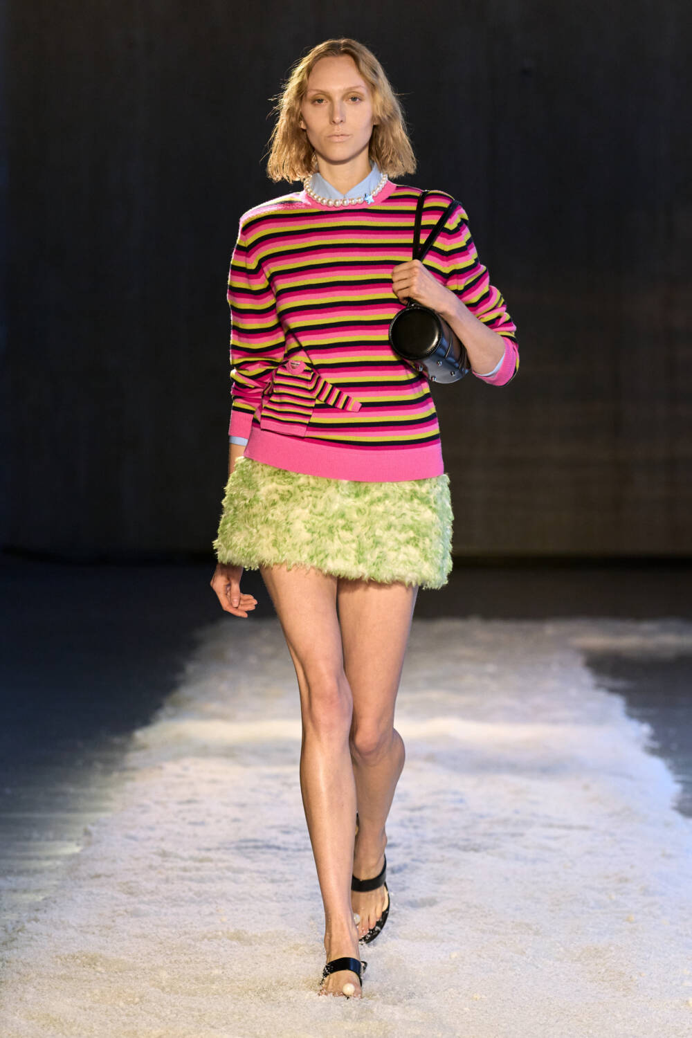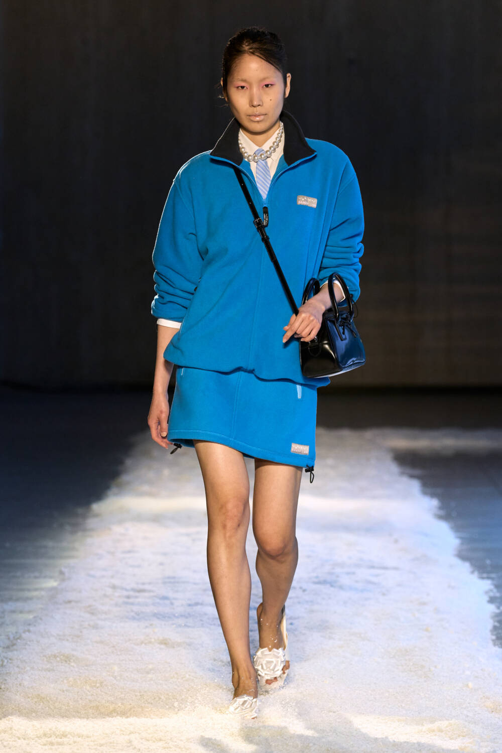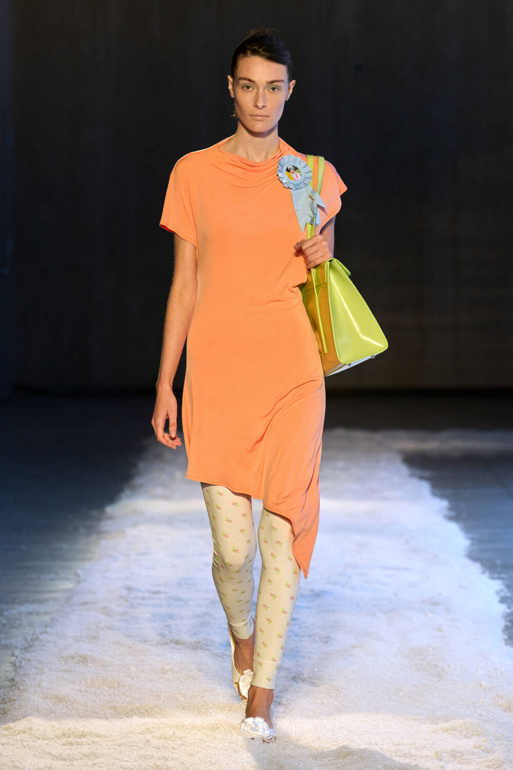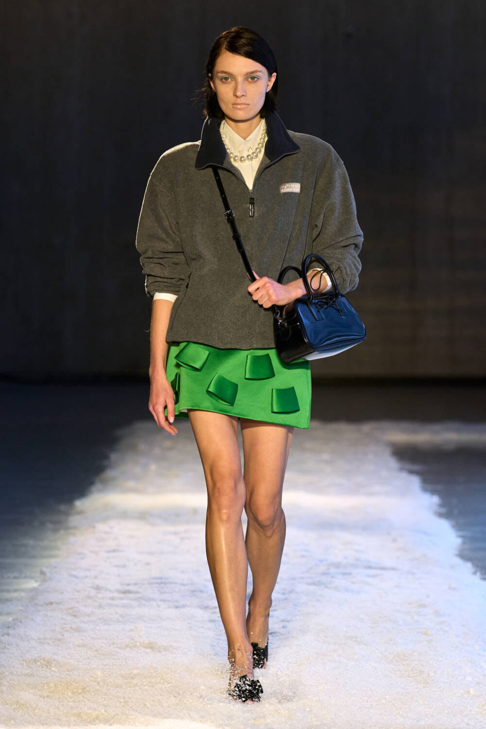 As always Liang mined her younger years as a starting point. From favourite movies like The Snowman and The Parent Trap to trips to ToysRUs to personal objects like a pink planner with a lock, everything calls back to a moment in time. The influences were evident from the opening look: a pink shift worn over a long johns was equal parts child playing dress up and a cool downtown girl styling. A tee tucked under a cardigan riffed on the toy store’s logo while the brand’s signature fleeces were teamed with colourful miniskirts. It was all very playful and personal – not everything is conventionally pretty or sensical but for the Sandy customer, experimentation with fashion is an integral part of her identity.