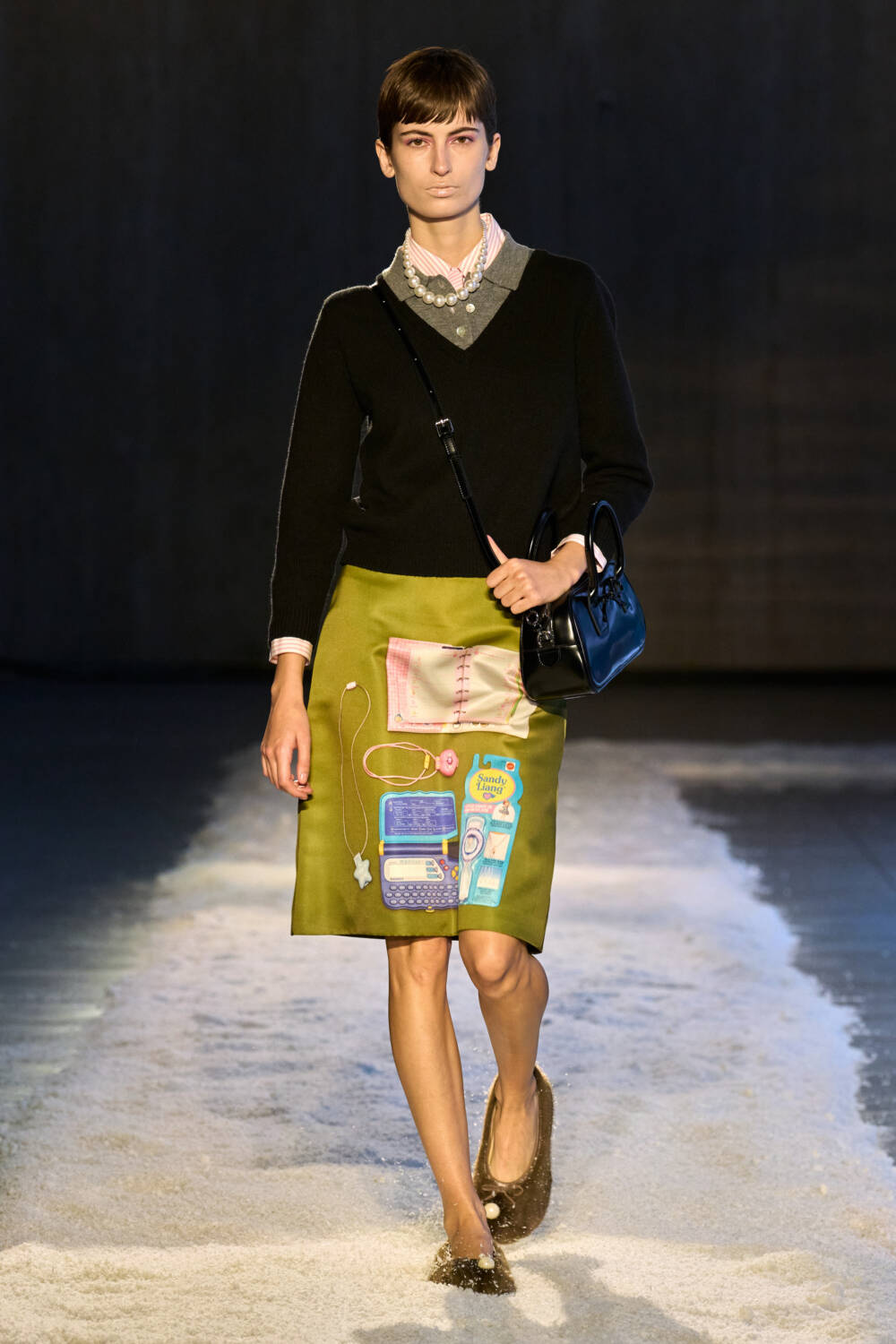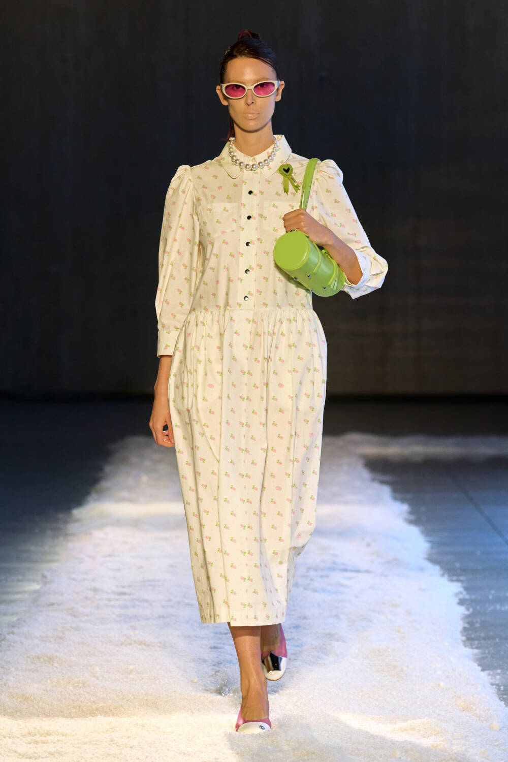 Speaking of playful, Liang decided to throw in a bit of surrealism into the mix. Sweaters featured miniature versions at the shoulder or hip. A mini was covered in little silk renditions of the silhouette while a shift dress also received the same treatment. Other pieces used trompe l’oeil, whether it was a skirt that featured a printed version of Liang’s gingham dress from a few years back or another that had a pink planner and earphones.