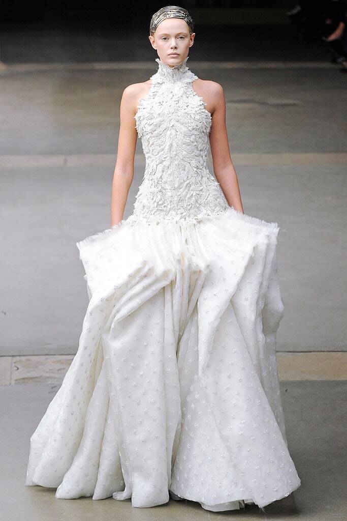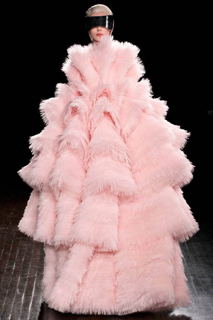 On the same Salle Wagram floor where Lee McQueen showed in October 2003, Sarah Burton presented her lush AW12 collection. Extravagant tiered puff-ball dresses paired with uniform white wigs and sci-fi visors exploded onto the runway. Frothy pink organza and shaggy shapes of goat fur, ostrich feather and Mongolian lamb undulated with every step, demanding utter attention.