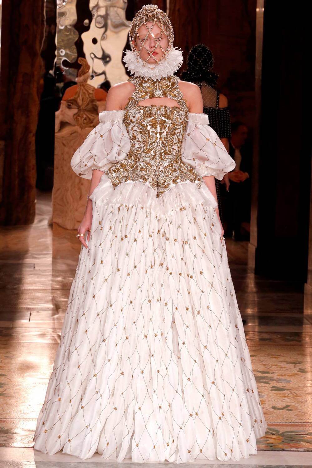 For Alexander McQueens’s AW13 show, Burton was inspired by the formative years of Elizabethan England. Completing the 10-look collection – divided into five subgroups: communion, nuns, cardinals, popes, and angels – during the final stages of her pregnancy, collars were stiff, linen, and attached to intricate puffy-sleeved ball gowns embellished with pearls, jewels and structured with enormous crinolines. Models’ heads were encased in precious cages for the brief but glorious pageant, serving a sort of off-kilter subversion and a punkish assault on orthodoxy.