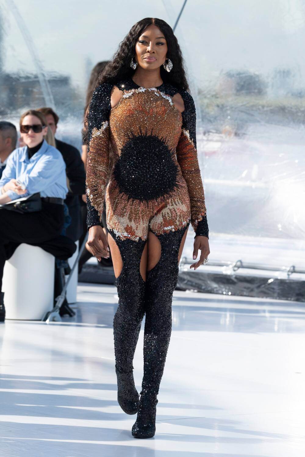 Sarah Burton’s SS23 collection for the house was inspired by humanity and human connection. Under a bubble dome in the elegant courtyard of Sir Christopher Wren’s Old Royal Naval College in Greenwich, the designer translated that into a masterclass in tailoring, playing with proportion, cut and silhouette, breaking the rules as only someone who knows them instinctively can do. Bringing back the bumster and pairing it with tiny corset-cut blazers, sending out a series of printed bodysuits and cut-away lace catsuits – Naomi Campbell’s was a beaded and embellished dream – braced with leather corset belts, and decking dresses and suits with evil eye-esc motifs, it was a powerhouse collection.