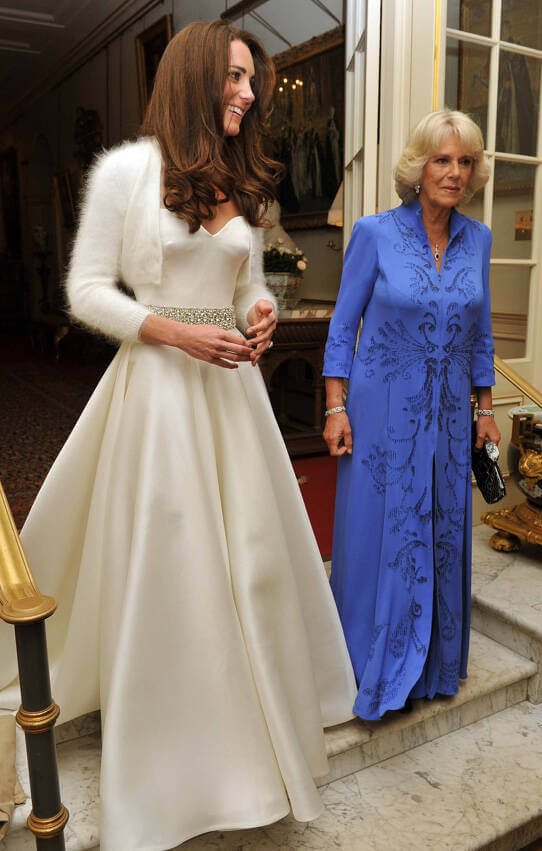 Later, at the reception hosted by the late Queen Elizabeth II at Buckingham Palace, the new Princess of Wales wore a rarely-seen satin gown with a delicate sweetheart neckline and accessorised it with a crystallised belt, angora bolero – the look was also designed by Burton. Burton described the opportunity to create the gowns as the ‘‘experience of a lifetime”.