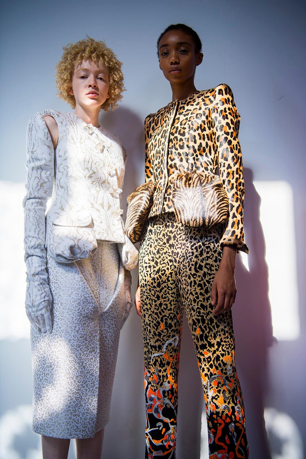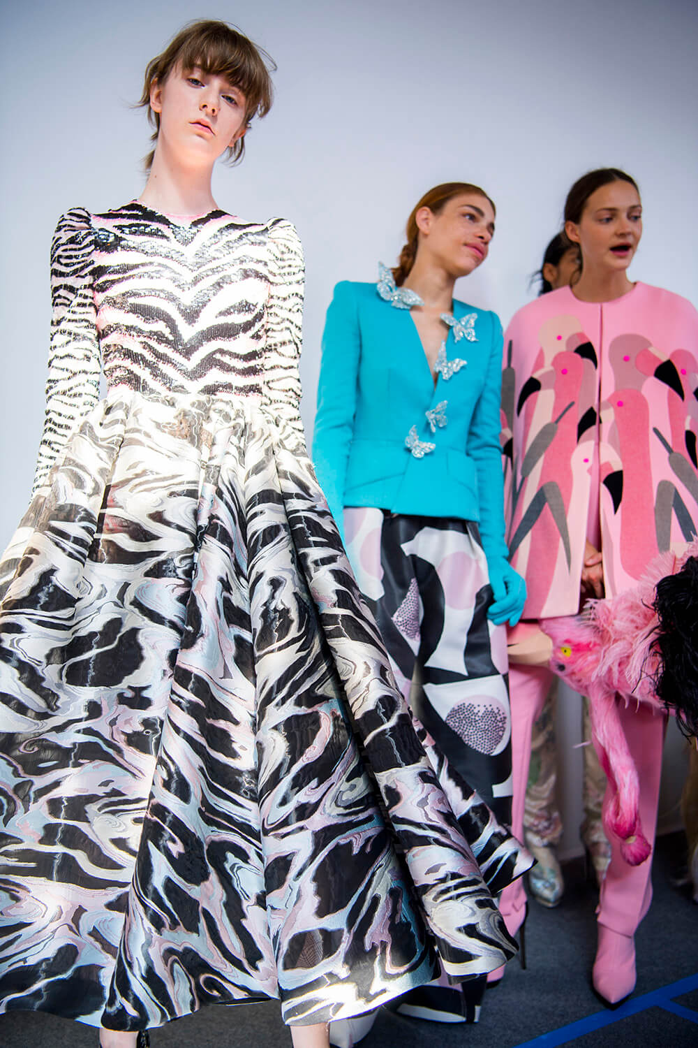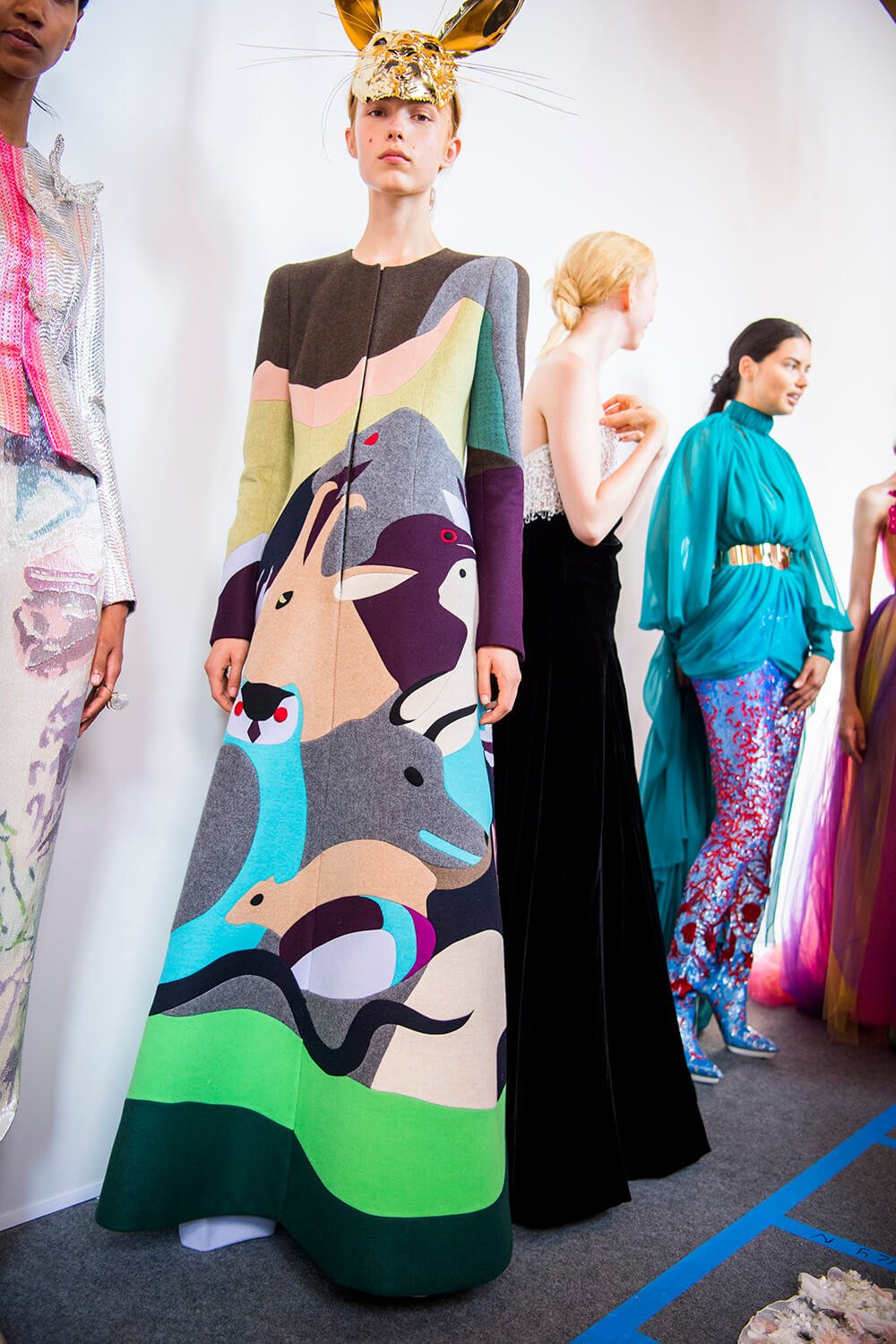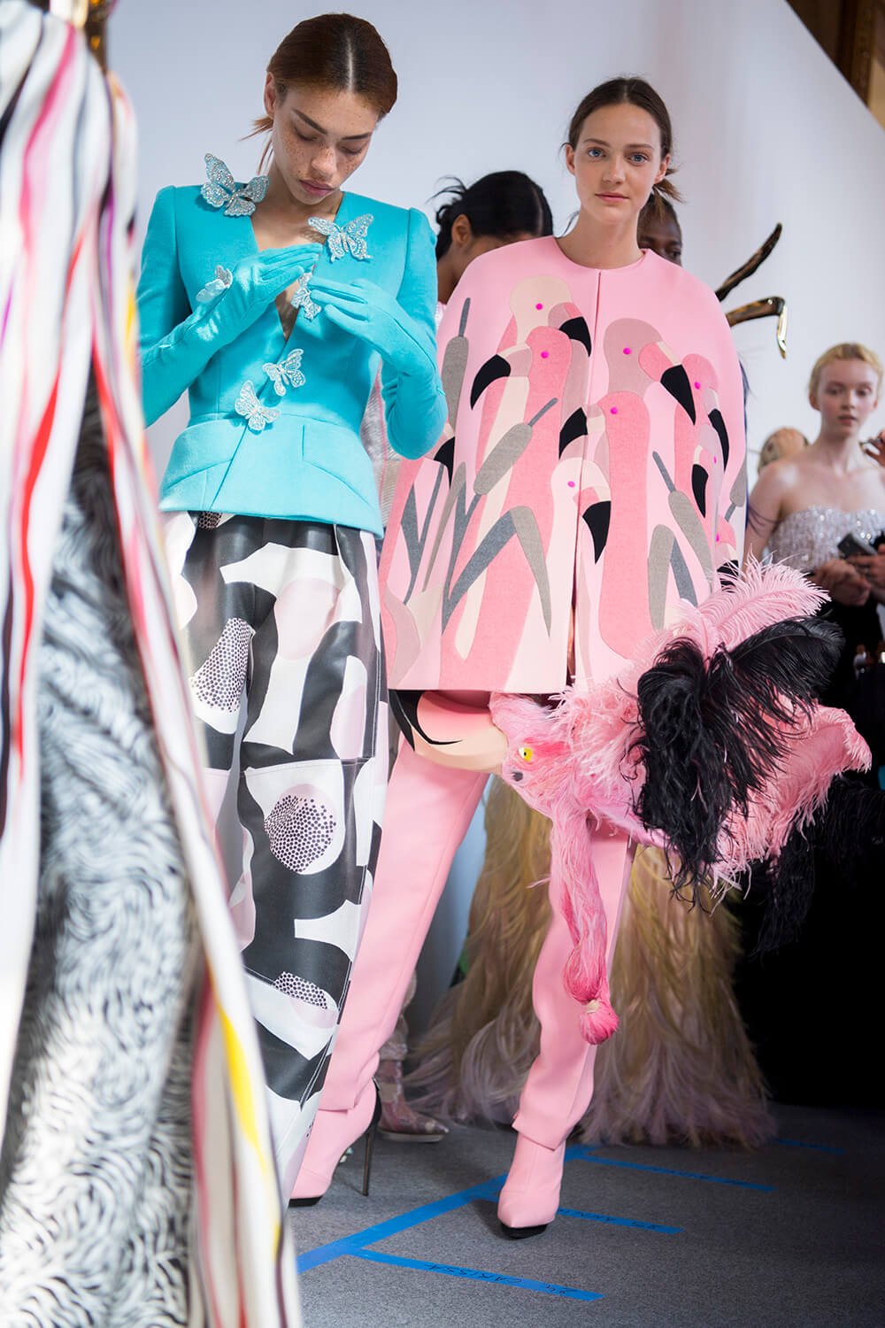 If you want reality go to Zara. This is haute couture – a world where pink flamingo feathered masks and floor length matching capes are served up with your morning coffee. From the very first look, Schiaparelli creative director Betrand Guyon played to couture’s greatest strength: fantasy. The house is steeped in surrealism and he used the craft of couture to turn his models into mythical creatures complete with vivid head pieces or masks. A leopard lady slunk through the salons of the Opera Garnier wearing an elaborate winged cat mask complete with whiskers. Another model wore sleek shocking pink satin cocktail trousers and a perky pair of matching bunny ears. Elsewhere the decoration was stunning. Three dimensional tropical flowers blossomed atop a rainbow chiffon gown, glittering butterflies settled on a blue velvet jacket and embroidered eyes blinked from the front of a floor length dress. Erin O’Connor walked in a grand floor length satin cape with Elsa Schiaparelli’s face painted on the front (the couture equivalent of branding). “For me the fantasy is fundamental for the couture,” said Guyin of his flights of fancy. Couture he added was the last bastion of escapism. “This may be the only moment where we can really communicate with the fantasy and with the creation the colour,” he said. “Everything contrasts with the life we live in this strange epoch.” It is strange indeed and wonderfully weird but at Schiaparelli it is also beautifully rendered.