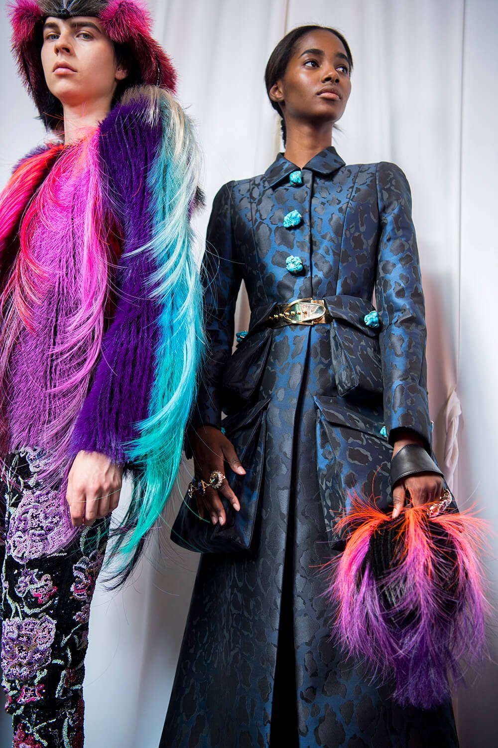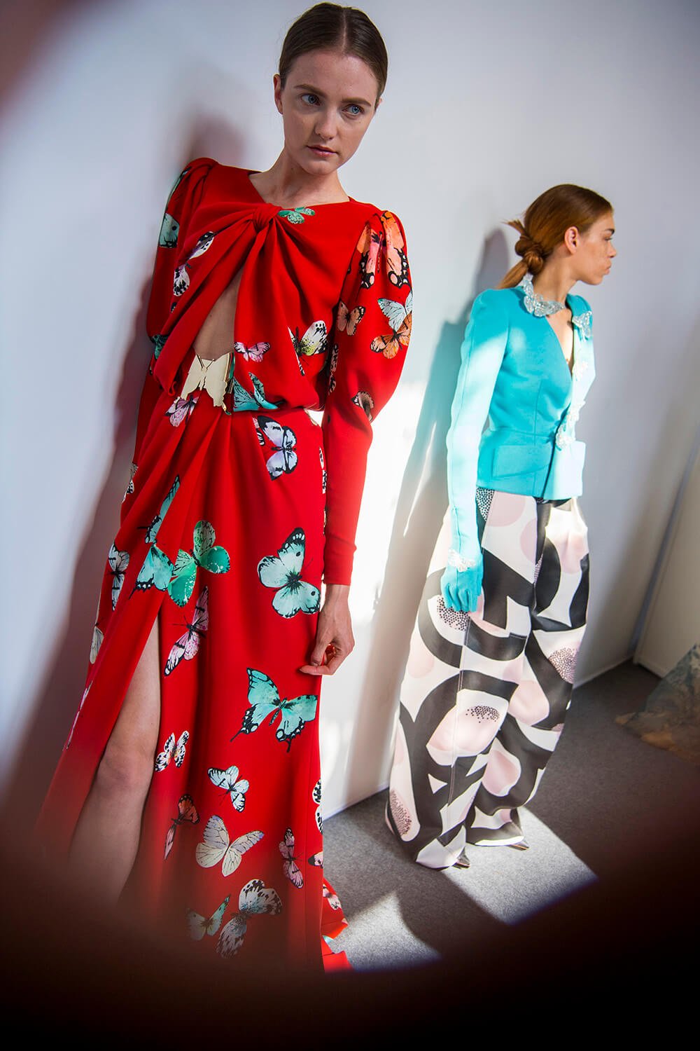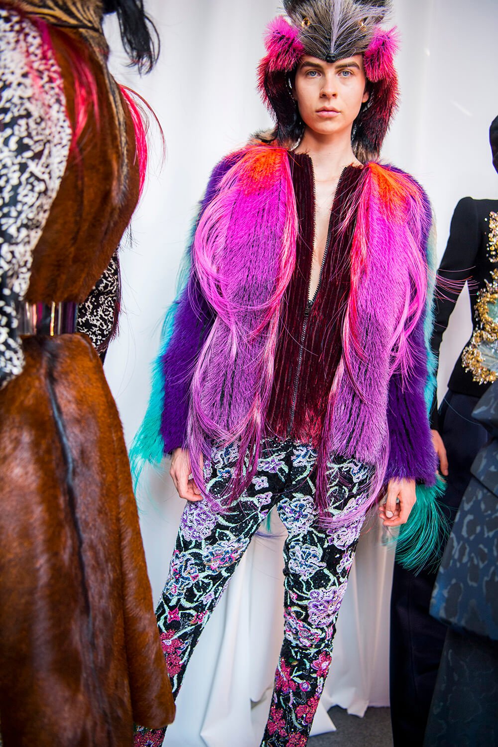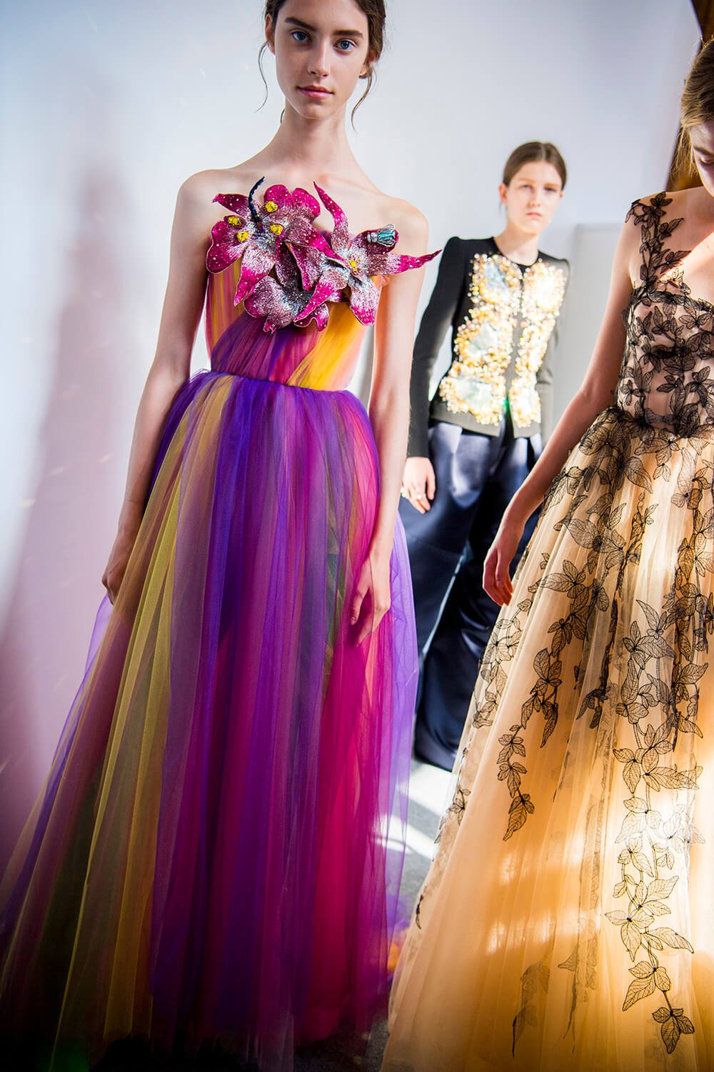 If you want reality go to Zara. This is haute couture – a world where pink flamingo feathered masks and floor length matching capes are served up with your morning coffee. From the very first look, Schiaparelli creative director Betrand Guyon played to couture’s greatest strength: fantasy. The house is steeped in surrealism and he used the craft of couture to turn his models into mythical creatures complete with vivid head pieces or masks. A leopard lady slunk through the salons of the Opera Garnier wearing an elaborate winged cat mask complete with whiskers. Another model wore sleek shocking pink satin cocktail trousers and a perky pair of matching bunny ears. Elsewhere the decoration was stunning. Three dimensional tropical flowers blossomed atop a rainbow chiffon gown, glittering butterflies settled on a blue velvet jacket and embroidered eyes blinked from the front of a floor length dress. Erin O’Connor walked in a grand floor length satin cape with Elsa Schiaparelli’s face painted on the front (the couture equivalent of branding). “For me the fantasy is fundamental for the couture,” said Guyin of his flights of fancy. Couture he added was the last bastion of escapism. “This may be the only moment where we can really communicate with the fantasy and with the creation the colour,” he said. “Everything contrasts with the life we live in this strange epoch.” It is strange indeed and wonderfully weird but at Schiaparelli it is also beautifully rendered.