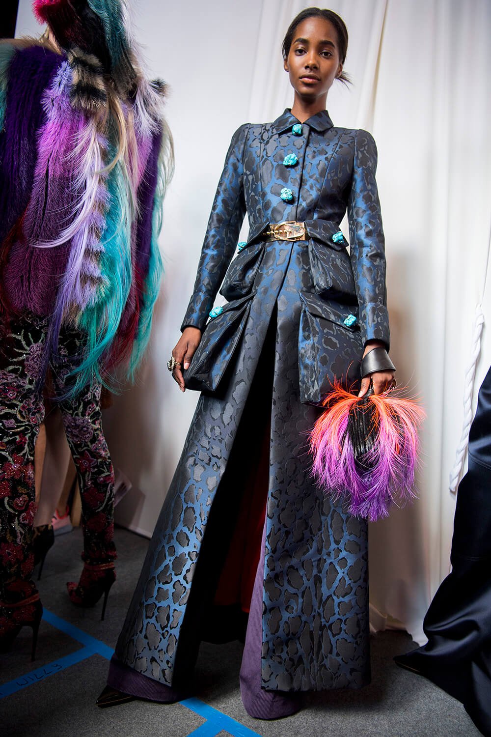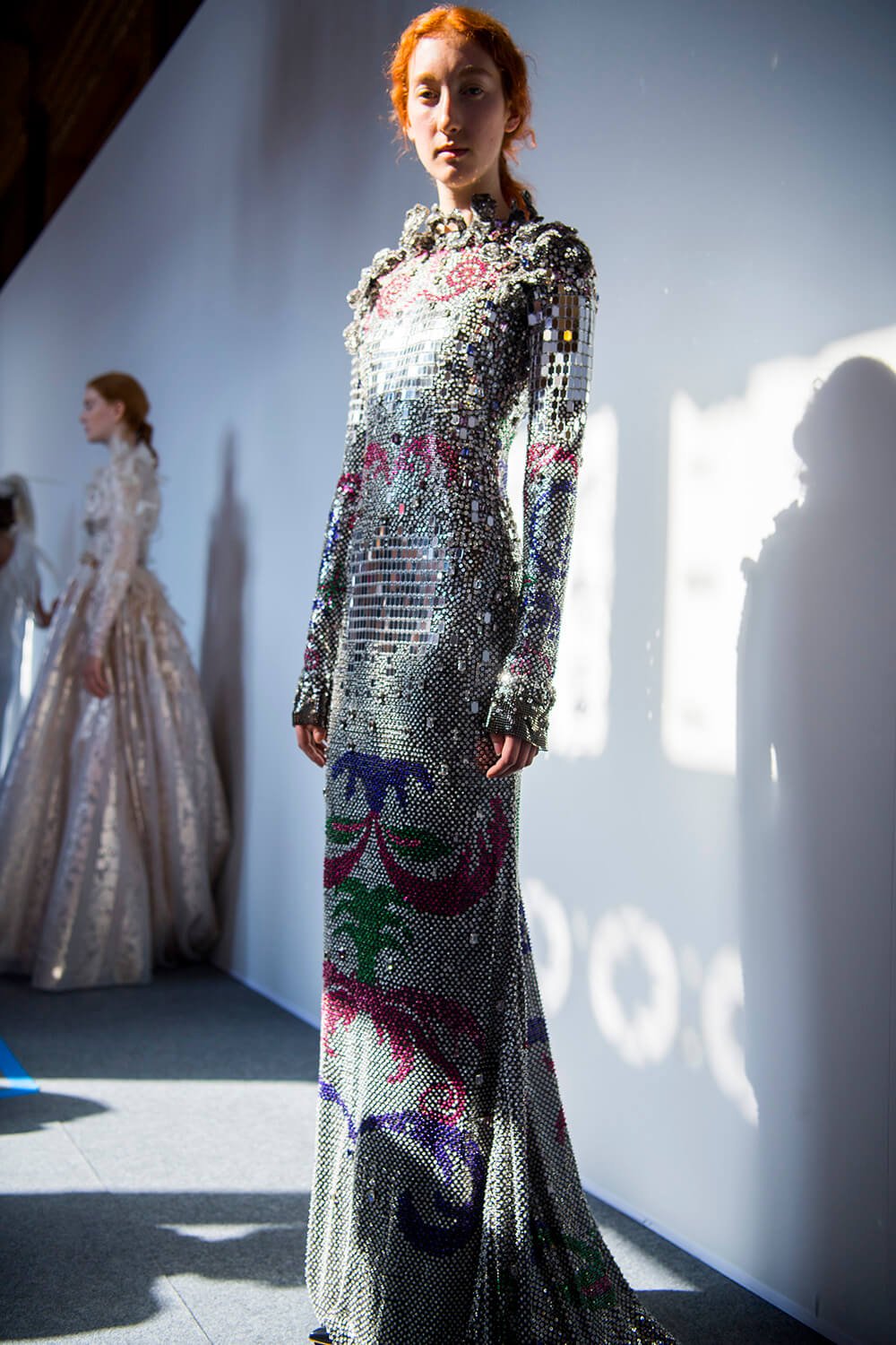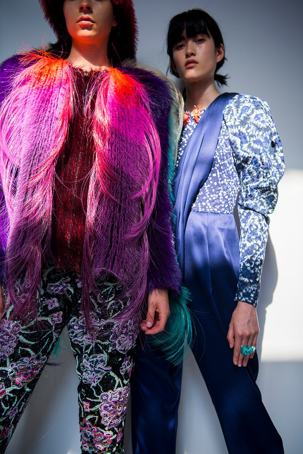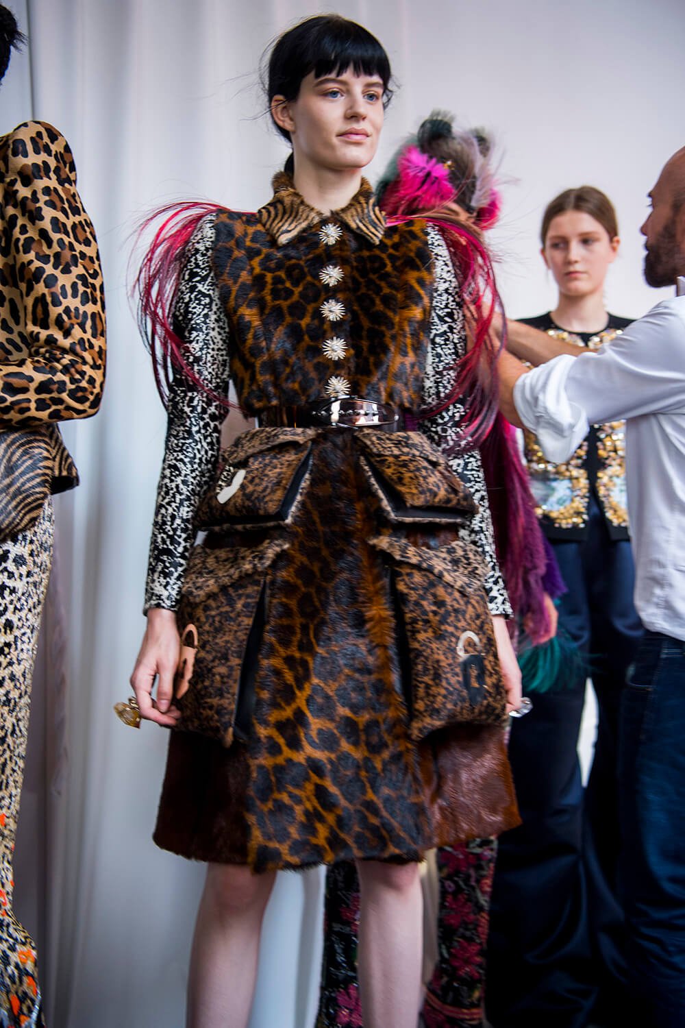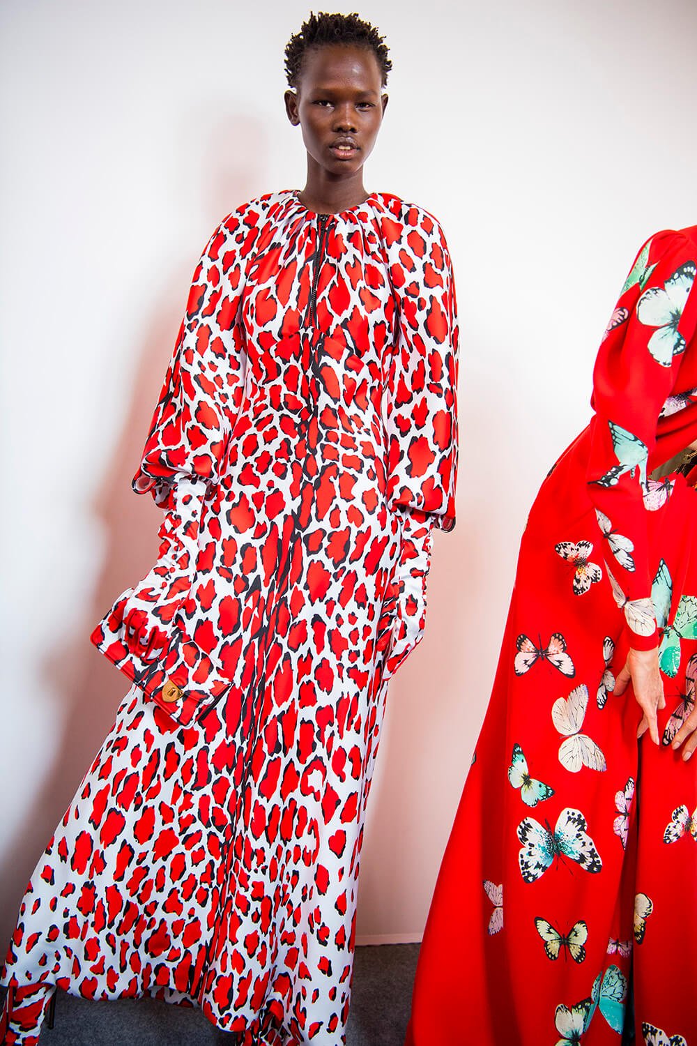 If you want reality go to Zara. This is haute couture – a world where pink flamingo feathered masks and floor length matching capes are served up with your morning coffee. From the very first look, Schiaparelli creative director Betrand Guyon played to couture’s greatest strength: fantasy. The house is steeped in surrealism and he used the craft of couture to turn his models into mythical creatures complete with vivid head pieces or masks. A leopard lady slunk through the salons of the Opera Garnier wearing an elaborate winged cat mask complete with whiskers. Another model wore sleek shocking pink satin cocktail trousers and a perky pair of matching bunny ears. Elsewhere the decoration was stunning. Three dimensional tropical flowers blossomed atop a rainbow chiffon gown, glittering butterflies settled on a blue velvet jacket and embroidered eyes blinked from the front of a floor length dress. Erin O’Connor walked in a grand floor length satin cape with Elsa Schiaparelli’s face painted on the front (the couture equivalent of branding). “For me the fantasy is fundamental for the couture,” said Guyin of his flights of fancy. Couture he added was the last bastion of escapism. “This may be the only moment where we can really communicate with the fantasy and with the creation the colour,” he said. “Everything contrasts with the life we live in this strange epoch.” It is strange indeed and wonderfully weird but at Schiaparelli it is also beautifully rendered.