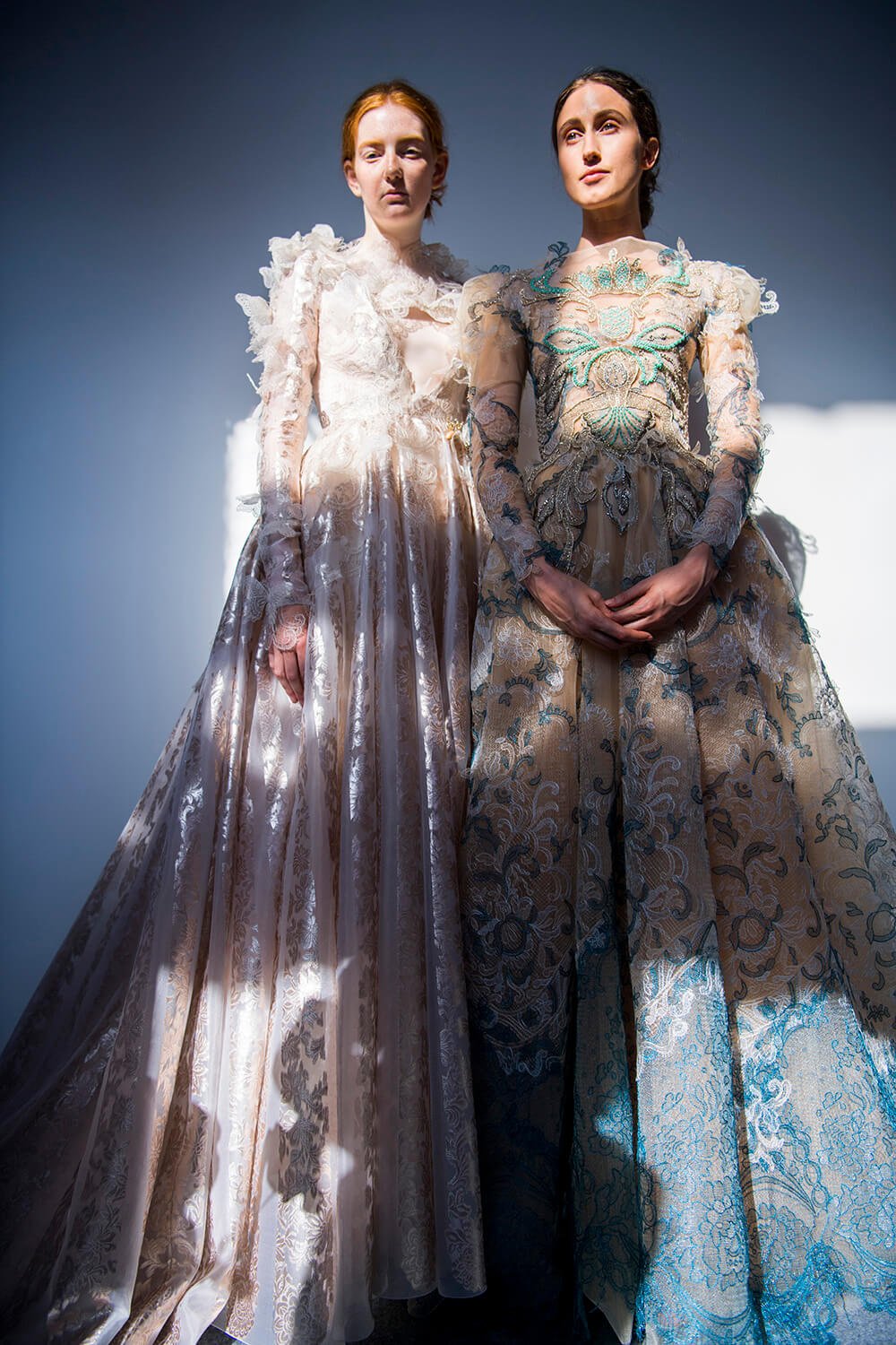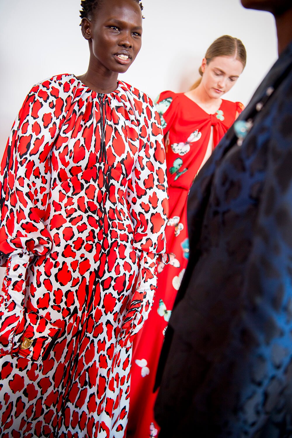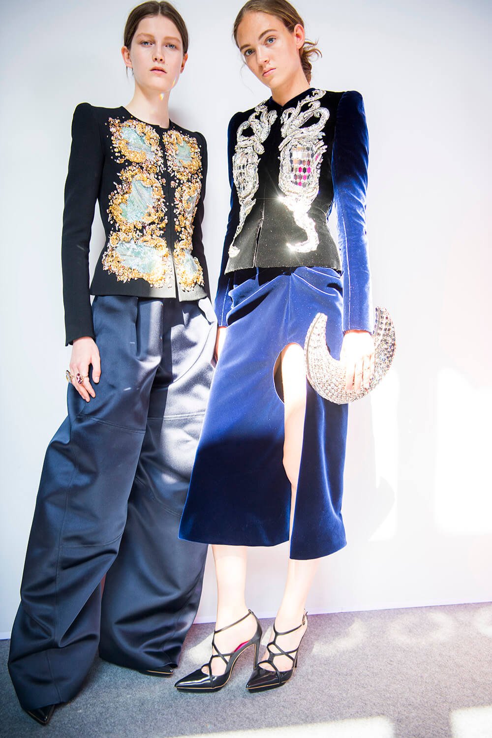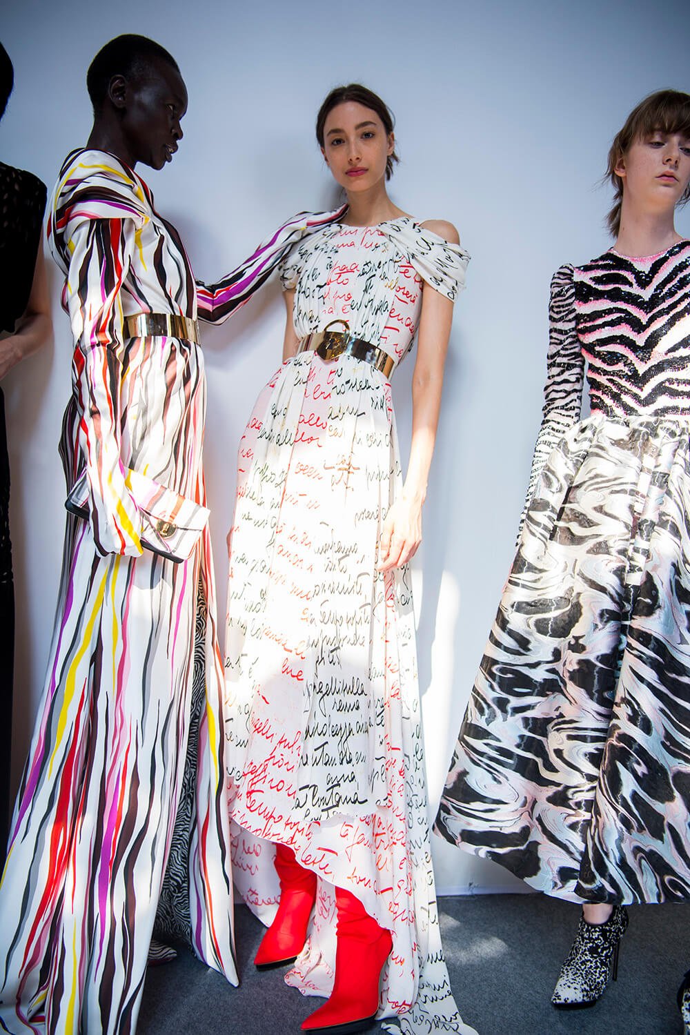 If you want reality go to Zara. This is haute couture – a world where pink flamingo feathered masks and floor length matching capes are served up with your morning coffee. From the very first look, Schiaparelli creative director Betrand Guyon played to couture’s greatest strength: fantasy. The house is steeped in surrealism and he used the craft of couture to turn his models into mythical creatures complete with vivid head pieces or masks. A leopard lady slunk through the salons of the Opera Garnier wearing an elaborate winged cat mask complete with whiskers. Another model wore sleek shocking pink satin cocktail trousers and a perky pair of matching bunny ears. Elsewhere the decoration was stunning. Three dimensional tropical flowers blossomed atop a rainbow chiffon gown, glittering butterflies settled on a blue velvet jacket and embroidered eyes blinked from the front of a floor length dress. Erin O’Connor walked in a grand floor length satin cape with Elsa Schiaparelli’s face painted on the front (the couture equivalent of branding). “For me the fantasy is fundamental for the couture,” said Guyin of his flights of fancy. Couture he added was the last bastion of escapism. “This may be the only moment where we can really communicate with the fantasy and with the creation the colour,” he said. “Everything contrasts with the life we live in this strange epoch.” It is strange indeed and wonderfully weird but at Schiaparelli it is also beautifully rendered.